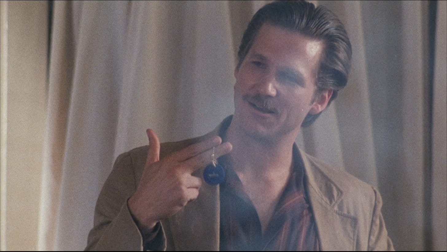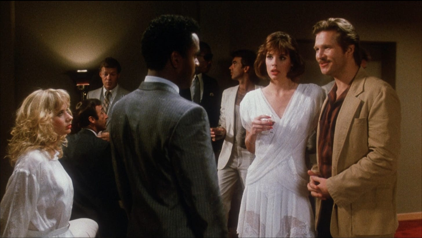 Hill’s unavailability opened the door for Hal Ashby to campaign for the job. Every picture the editor-turned-director had put in his spinning wheel in the 1970s had converted straw to gold: Harold and Maude (1971), The Last Detail (1973), Shampoo (1975), Bound For Glory (1976), Coming Home (1978), Being There (1979). Like several of his peers, Ashby’s magic had faded in the 1980s, with Second-Hand Hearts (1980), Lookin’ To Get Out (1982) and The Slugger’s Wife (1985) all critical and commercial disappointments. Ashby saw the potential in 8 Million Ways To Die to turn that around, but neither he nor his production designer Michael Haller were familiar with New York. They promised PSO they could make 8 Million Ways To Die cheaper if retooled for Los Angeles. With Oliver Stone unavailable for rewrites, Ashby attended Alcoholics Anonymous meetings and began polishing the script on his own, sharing fifty or so pages with Steve Roth. Jeff Bridges and Rosanna Arquette (replacing Jamie Lee Curtis, who’d departed the project over salary) wanted to work with Ashby and committed to play the leads, joined by a newcomer named Andy Garcia, cast as a Colombian drug dealer.