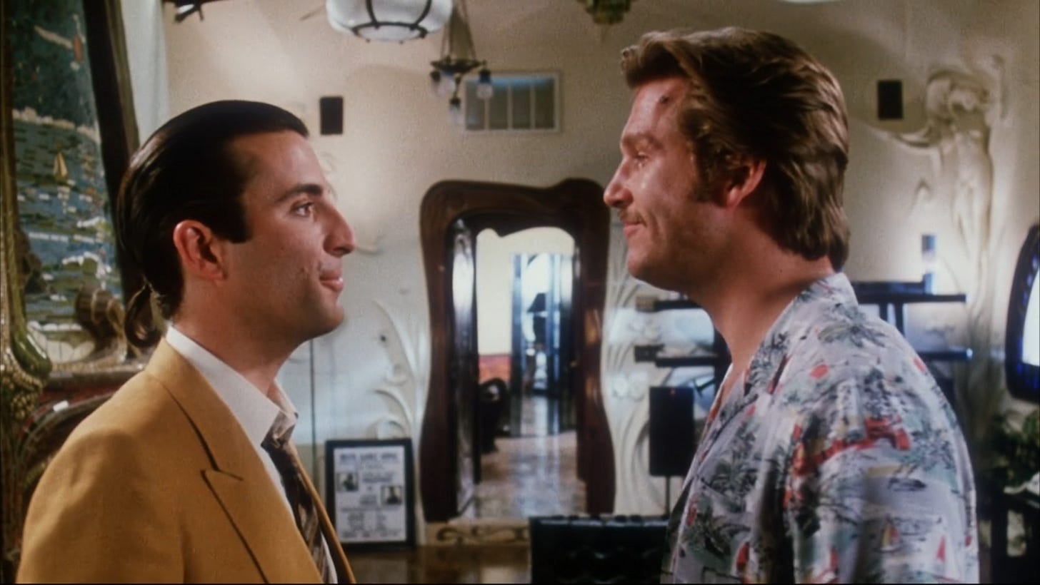Stone–who visited the set in Malibu, where a hilltop mansion on Cross Creek Road that once belonged to record producer David Foster, with operational funicular, was used for the club exteriors–would, based on his recent experience shooting Salvador for less than $4.5 million in Mexico, consider what he saw on Ashby’s set extravagant (the publicized budget for 8 Million Ways To Die would be $18 million). Lawrence Block noted that Ashby would encourage his actors to get into a scene by playing an over-the-top version, which Ashby would dial down in subsequent takes. After 86 days of shooting, he wrapped production and turned his assembly over to his editor, with Robert Lawrence promising he’d have a cut they could begin working on by Christmas. Using Ashby’s absence to cite unprofessionalism, PSO dismissed the director and brought in Stuart Pappé, who’d edited several comedies for director Paul Mazursky, to cut their picture. Several of the off-the-cuff takes Ashby had pushed his actors through and likely not intended for anyone to see ended up in the finished film.