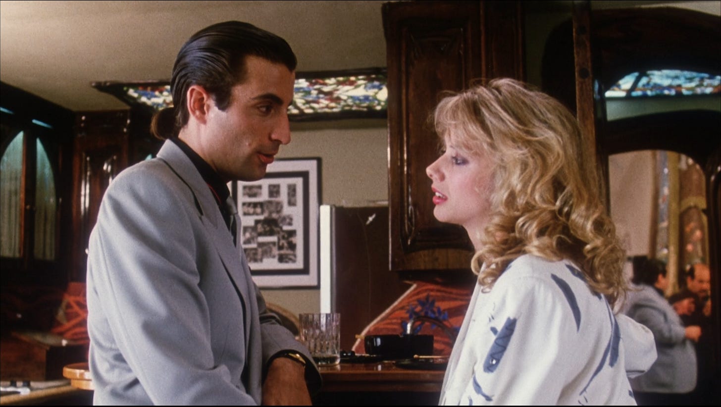 Scudder ends up in Alcoholics Anonymous, where a woman seeks his help on behalf of a friend in trouble. She gets Scudder into an underground gambling den that’s perched on a hill, accessible by funicular. He’s familiar with the club owner, Chance Walker (Randy Brooks) and is introduced to the woman in peril, a sporting lady named Sunny (Alexandra Paul), as well as a flashy drug smuggler named Angel Maldonado (Andy Garcia) who’s infatuated with a blonde working the club named Sarah (Rosanna Arquette). Scudder leaves the joint with Sunny and she asks for his help quitting the prostitution ring she’s caught up in, offering Scudder $5,000. He meets with Chance to offer him half his fee, but the club owner insists he’s no pimp and has no hold on what the girls in his club do outside it. Before Scudder gets any answers, Sunny is abducted in front of him and killed, her body thrown from a bridge. Scudder goes on a bender and after he regains his faculties, sets out to find the killer (the WGA would award screenplay credit to Oliver Stone and David Lee Henry, based on a novel by Lawrence Block).
