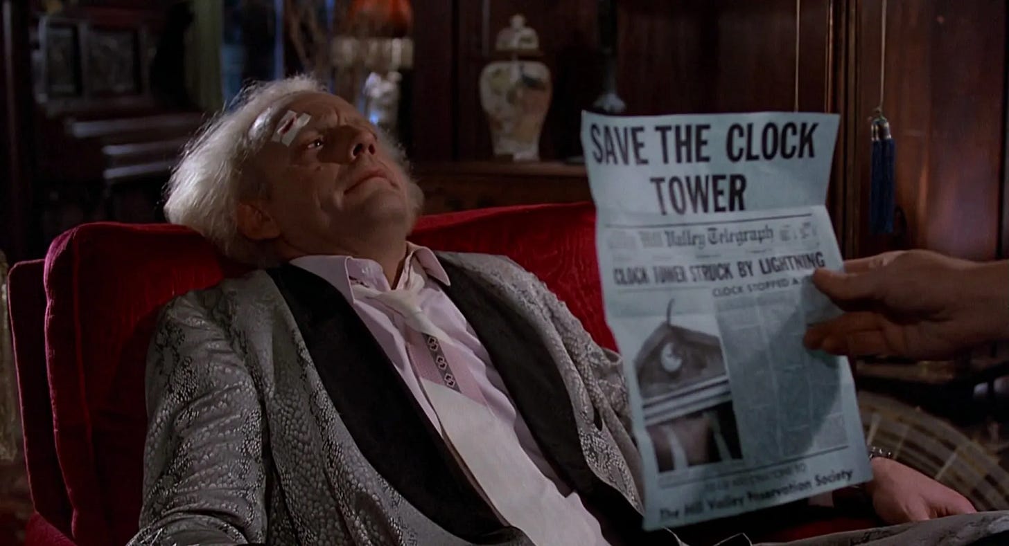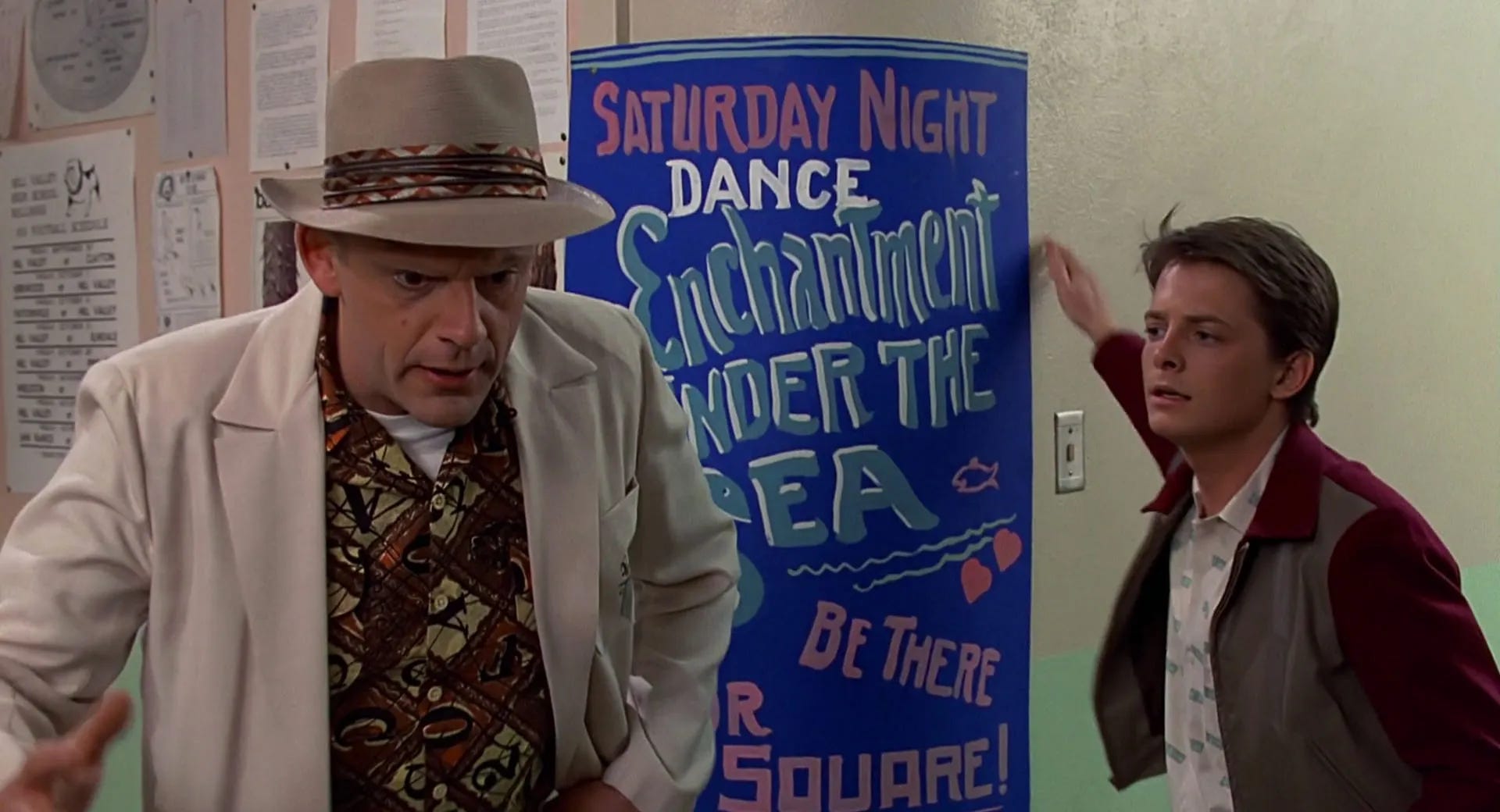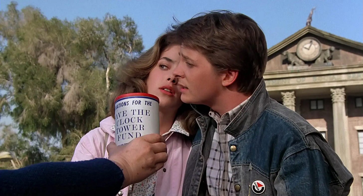 As an entertainment delivery system, Back to the Future is military grade in its efficiency. Like Walt Disney, its artistry comes from how dutifully it enthralls the viewer. There isn’t a moment that doesn’t advance the story in some keen way. Every line of dialogue, every plot point, every sight gag is engineered to pay off. Rather than just act on the viewer with lots of gags (ILM visual effects art director Phillip Norwood and visual effects supervisor Ken Ralston among the animators and technicians), the screenplay by Robert Zemeckis & Bob Gale finds another gear by asking us to participate with it. The screenplay not only gives Marty two puzzles to solve–fixing the time machine and matchmaking his parents, both necessary for him to have a future to return to–but slips us clues along the way. We remember Lorraine’s story about falling in love with George when her father hits him with the car and realize Marty is in trouble when he gets hit instead. We remember the volunteer telling Marty the tale about the clock tower being struck by lightning in 1955 and figure that’s how Doc can anticipate where lightning will strike. Back to the Future functions like an interactive game, but it’s not, it’s just great screenwriting. One of the reasons it’s aged so well along with Clue (1985) is that both movies are fun to riddle out, even after one viewing.