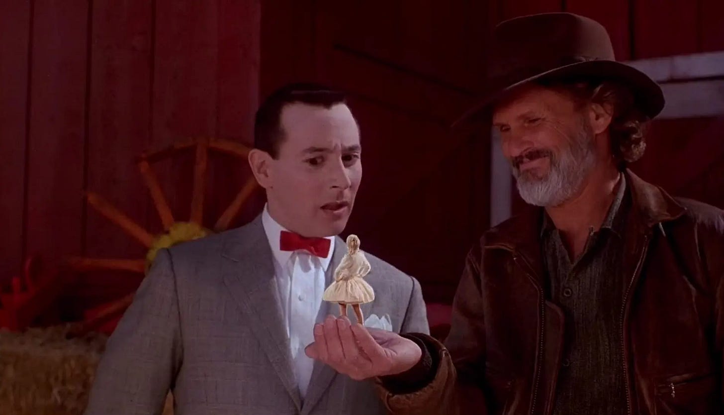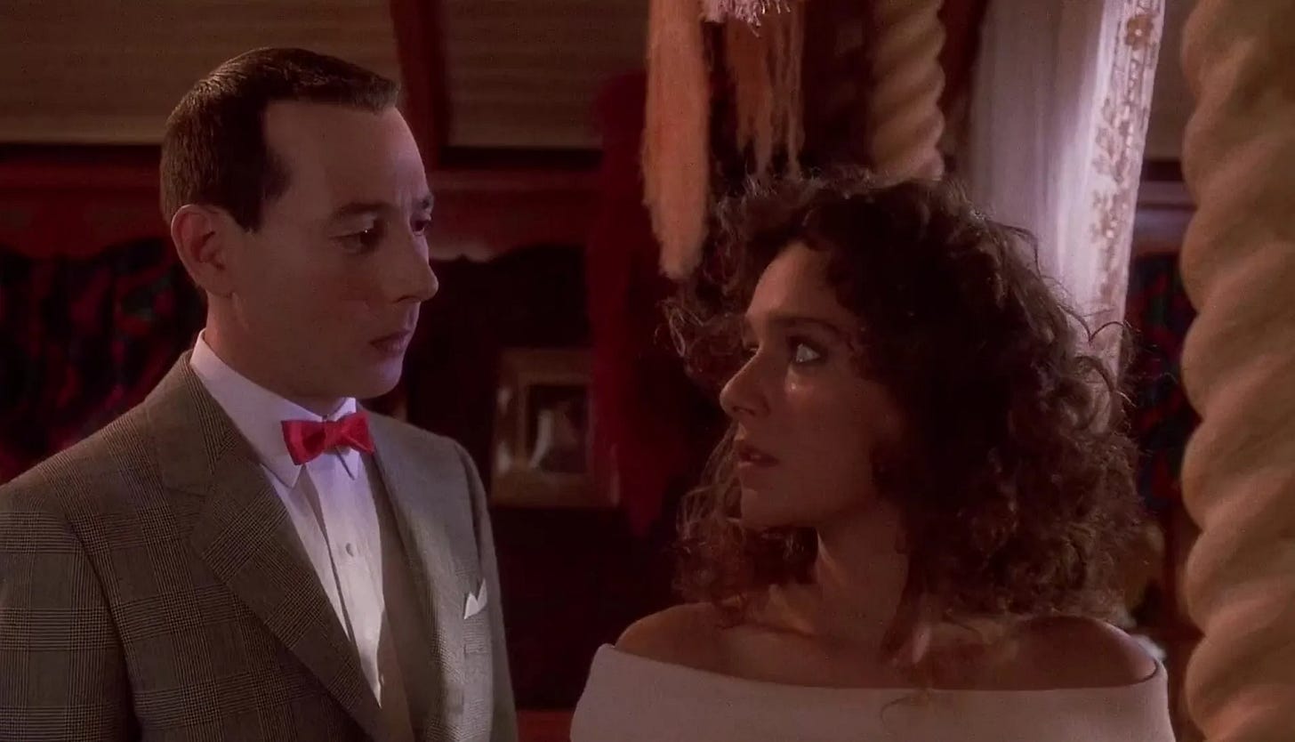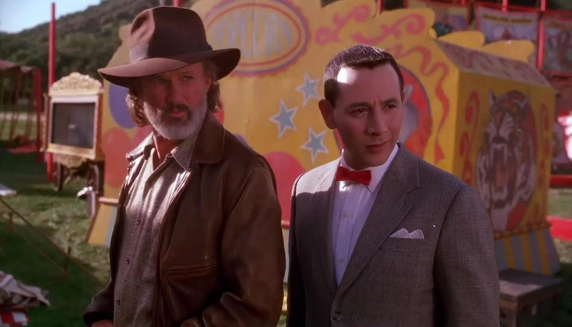 Reubens & Paragon & Varhol screened every circus movie they could find–the Academy Award winner for Best Picture, The Greatest Show on Earth (1952), and Jumbo (1962) being the best known with Dumbo (1941)–but they struggled to come up with a story. Three months into their efforts to dial in a script, Paragon concluded that the circus milieu was too confining, that Pee-wee needed to bust loose from it, while Varhol advocated for the opposite, enthralled by Pee-wee discovering the circus world this time out. Reubens recycled a few ideas from the draft of Pee-wee’s Big Adventure he’d halfway completed with Phil Hartman & Varhol, in which Pee-wee introduces joy and excitement to the citizenry of a lifeless town. This led Reubens & Varhol to the idea of Pee-wee owning a farm, growing oversized vegetables and hosting a traveling circus troupe when a storm blows them onto his land. Warner Bros. Pictures was allergic to a circus film and to meeting Reubens’ escalated fee to co-write, produce and star in it. The studio passed.