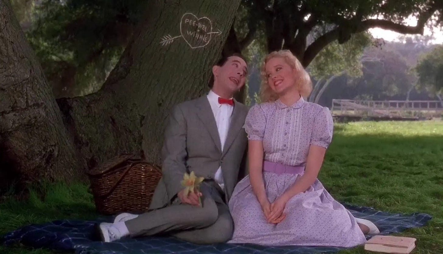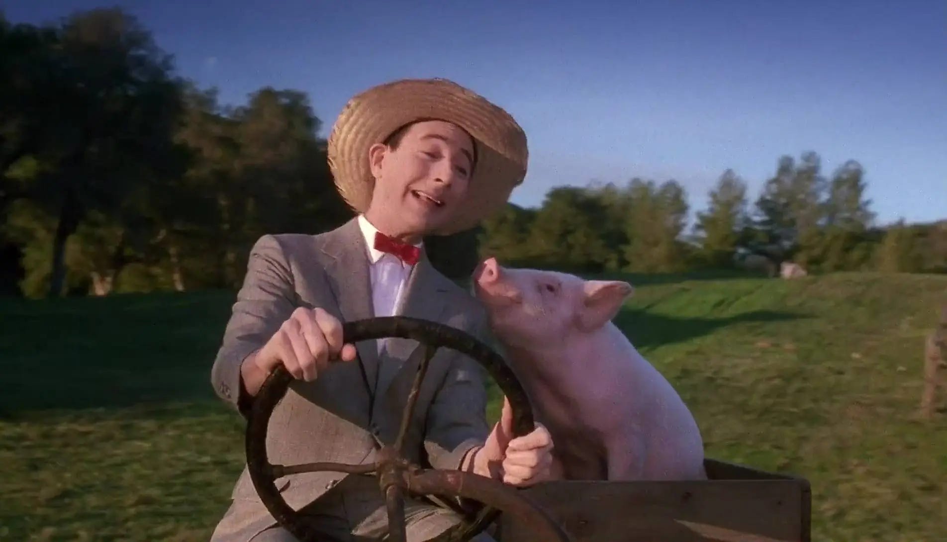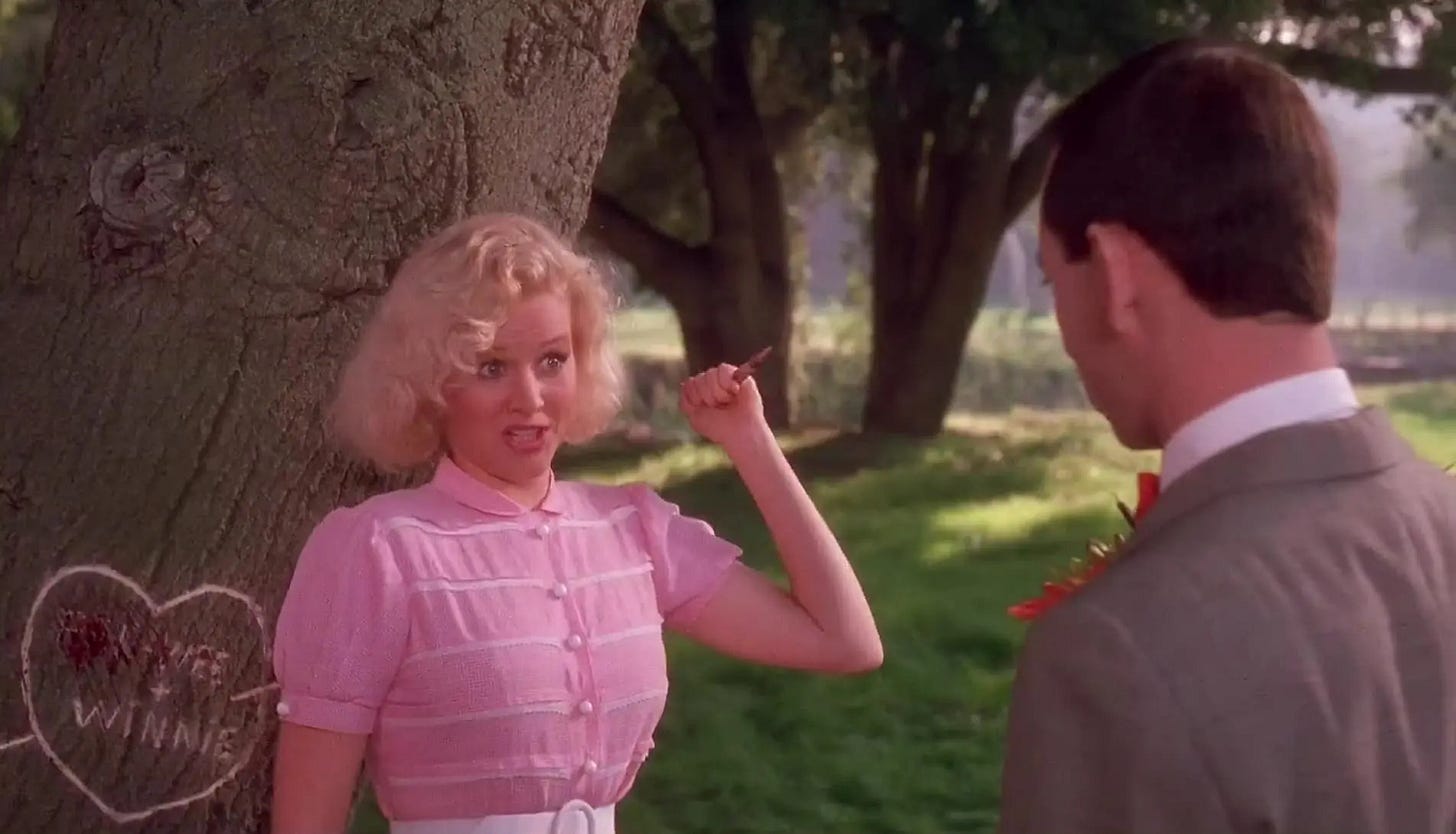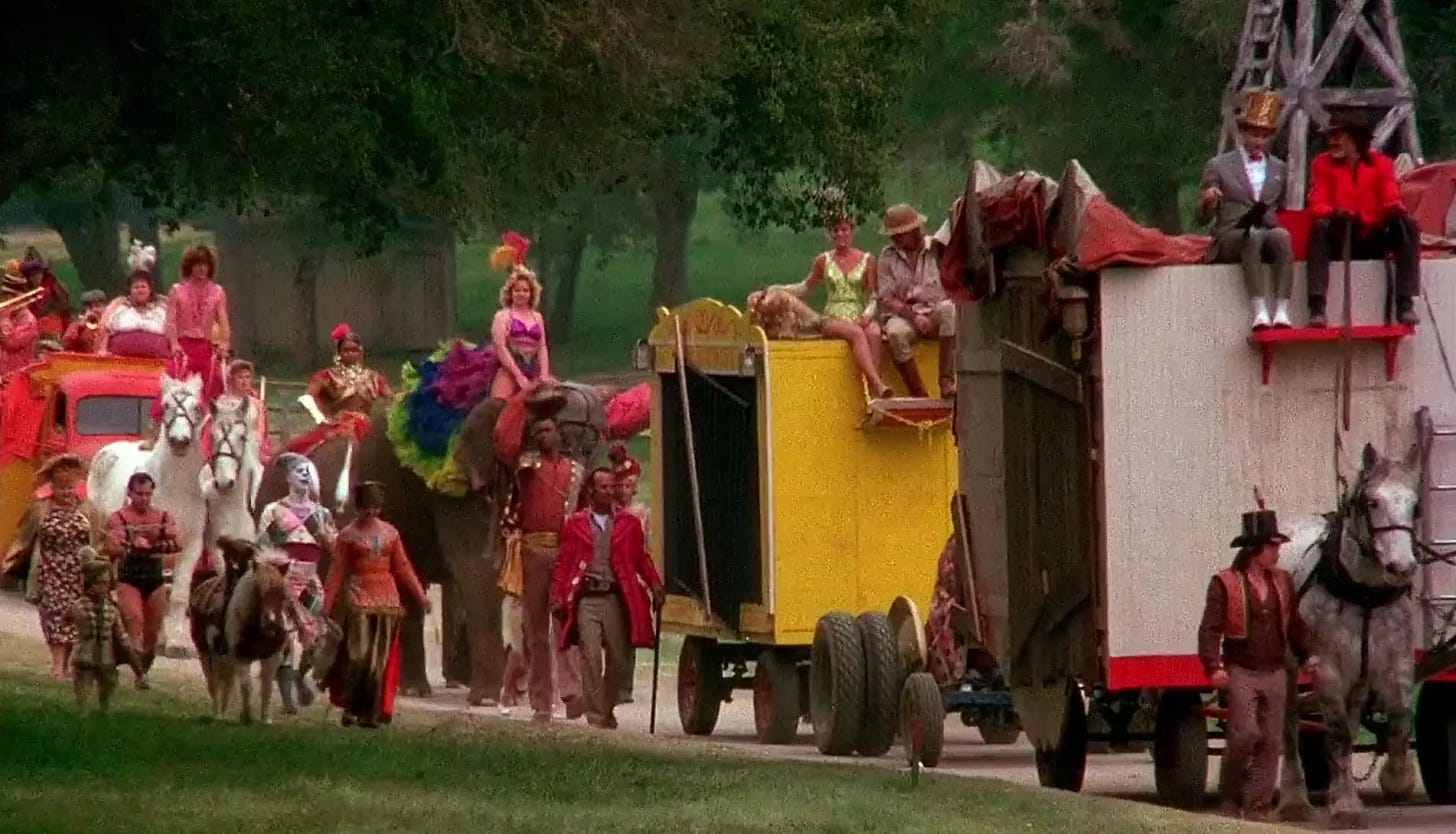 Reubens & Paragon & Varhol screened every circus movie they could find–the Academy Award winner for Best Picture, The Greatest Show on Earth (1952), and Jumbo (1962) being the best known with Dumbo (1941)–but they struggled to come up with a story. Three months into their efforts to dial in a script, Paragon concluded that the circus milieu was too confining, that Pee-wee needed to bust loose from it, while Varhol advocated for the opposite, enthralled by Pee-wee discovering the circus world this time out. Reubens recycled a few ideas from the draft of Pee-wee’s Big Adventure he’d halfway completed with Phil Hartman & Varhol, in which Pee-wee introduces joy and excitement to the citizenry of a lifeless town. This led Reubens & Varhol to the idea of Pee-wee owning a farm, growing oversized vegetables and hosting a traveling circus troupe when a storm blows them onto his land. Warner Bros. Pictures was allergic to a circus film and to meeting Reubens’ escalated fee to co-write, produce and star in it. The studio passed.