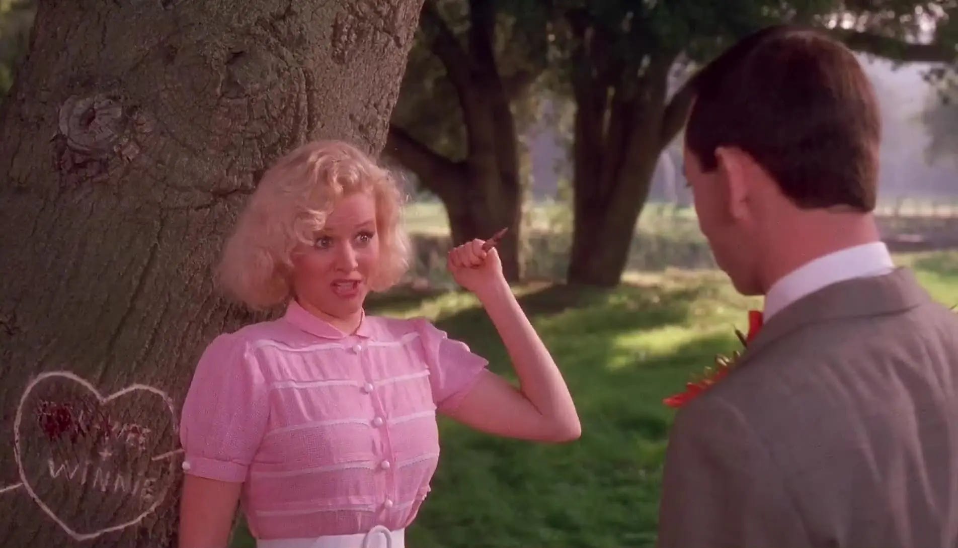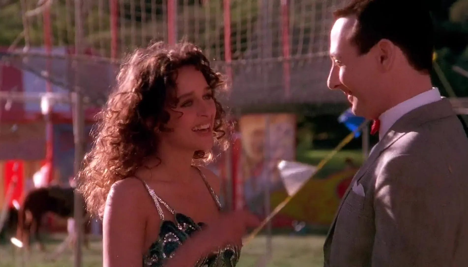 Other than Lynne Marie Stewart — who played Miss Yvonne on Pee-wee’s Playhouse and was cast as Zelda the Bearded Lady — none of the cast members of Pee-wee’s Big Adventure would return, making it less of a redo and more like a restart. Penelope Ann Miller and 22-year-old Valeria Golino (in her film debut by virtue of Reubens insisting the acrobats all be Italian) were cast as Pee-wee’s love interests, Kris Kristofferson as ringmaster Mace Montana and as the voice of Pee-wee’s best friend Vance the Pig, Wayne White, who performed and voiced the characters of Randy and Mr. Kite on Pee-wee’s Playhouse. The only craftspeople from Pee-wee’s Big Adventure returning with Reubens would be Danny Elfman, who agreed to score the picture between working with Tim Burton on Beetlejuice (1988) and Batman (1989). Shooting commenced January 1988 on a publicized budget of $20 million, more than three times what Pee-wee’s Big Adventure ended up costing despite a veteran director juggling far fewer locations. Pee-wee’s farm, the circus and the unnamed town were erected in Golden Oak Ranch, the 890-acre compound outside of Newhall, California owned by Walt Disney Studios and offering meadows, a waterfall and western sets. The concert sequence that opens the film was shot in the auditorium of Hart High School in Santa Clarita.