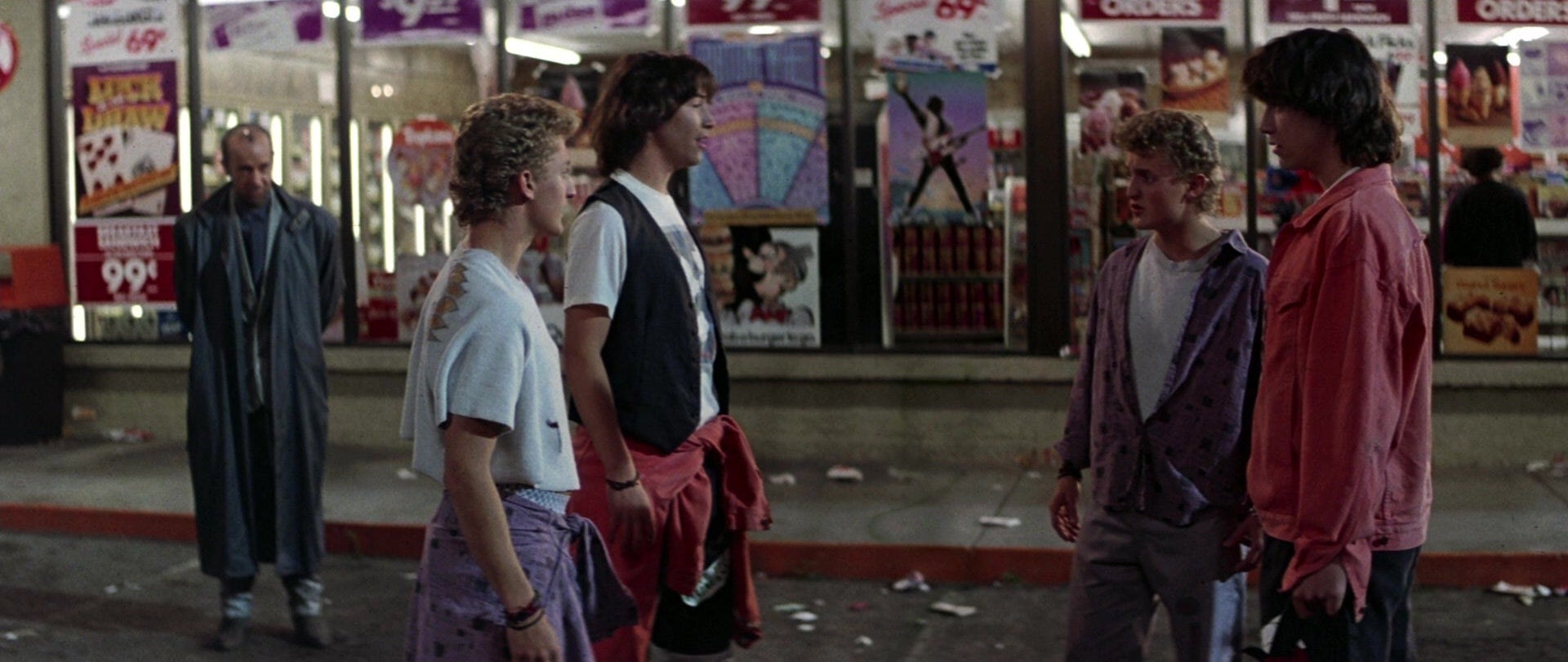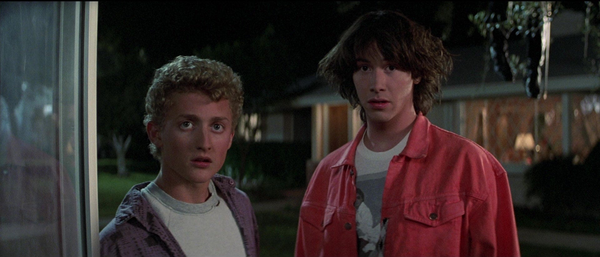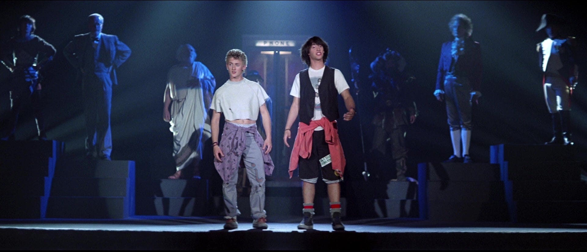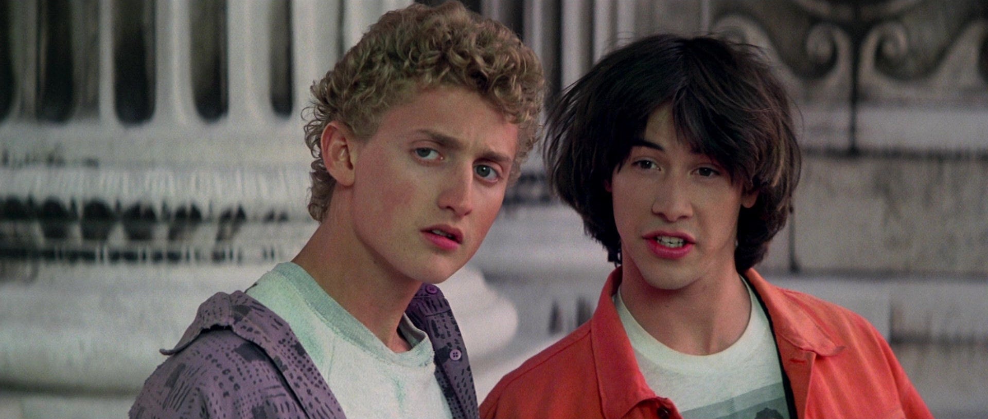 Johanna Steinmetz, Siskel’s substitute in the Chicago Tribune, wrote: “It helps if you think of Bill & Ted’s Excellent Adventure as sort of a Sesame Street for teens. Beneath the self-aggrandizing plot, the rock music, the dudespeak and the humor lurks a smattering of knowledge.” She gave it two stars out of four. Writing for the New York Times, Vincent Canby could barely muster the energy to salvage the comedy. “The one dimly interesting thing about Bill & Ted’s Excellent Adventure is the way the two teenage heroes communicate in superlatives. ‘We are about to fail most egregiously,’ says Ted to Bill, or maybe it’s Bill to Ted. They are also fond of odd words, such as bodacious. Other than that, they are inconsistent ciphers.” Filing a piece for the Los Angeles Times, bench critic Chris Willman chimed in: “Make no mistake. Bill & Ted’s Excellent Adventure is not a satire of mindlessness; it’s unabashed glorification of dumbness for dumbness’ sake.” Since John Hughes and all the cast members of the so-called Brat Pack had graduated to pictures aimed mostly at adults, teenagers hadn’t had a good movie that met them where they lived. The Naked Gun (1988), Twins (1988) and Rain Man (1988) were atop the box office, and none featured a teenage character with youthful preoccupations.