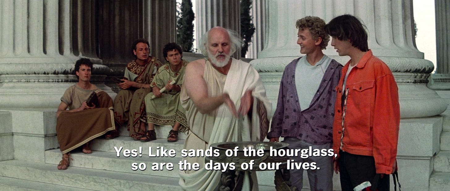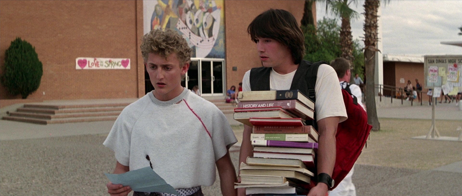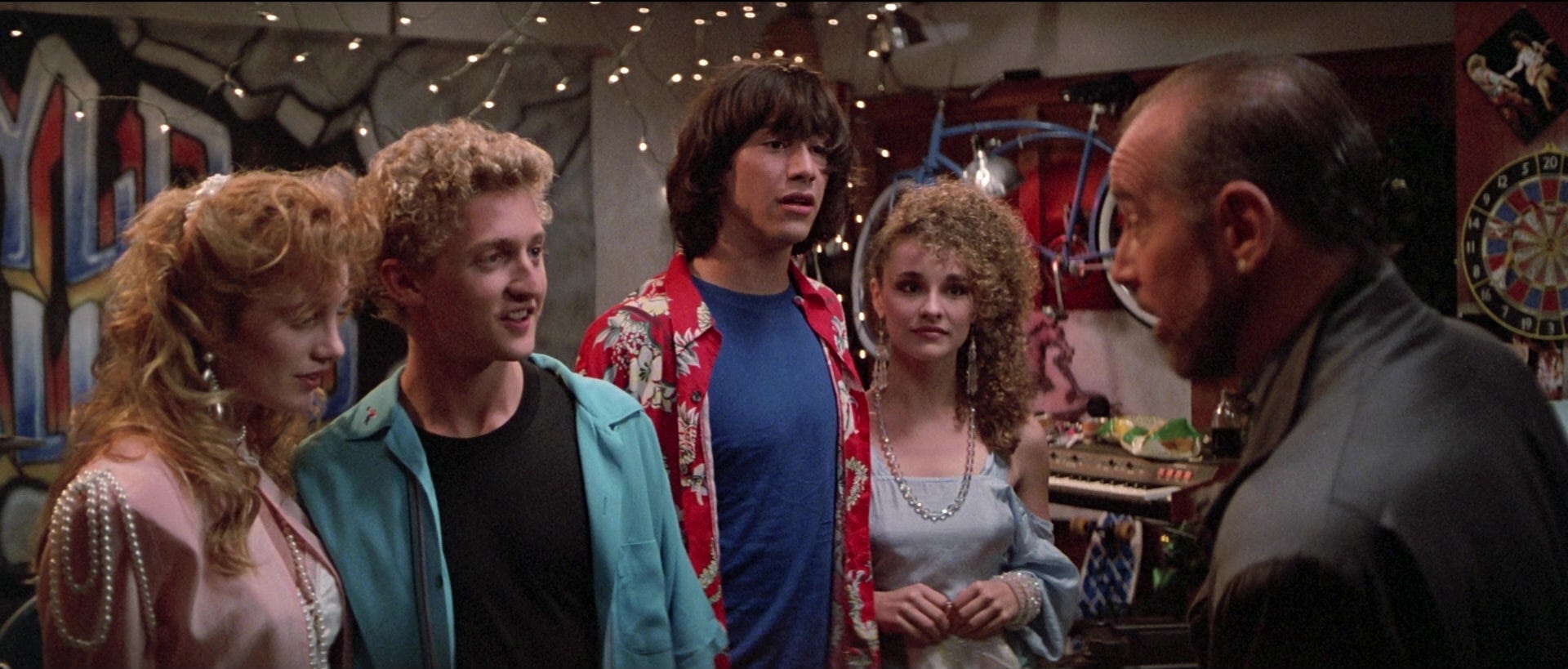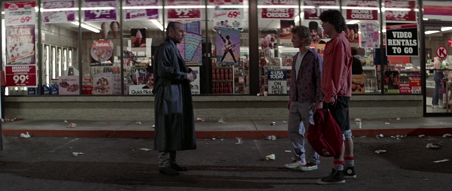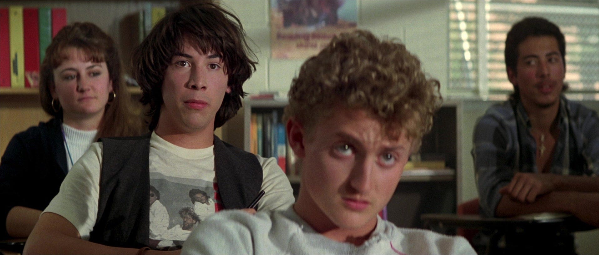 Johanna Steinmetz, Siskel’s substitute in the Chicago Tribune, wrote: “It helps if you think of Bill & Ted’s Excellent Adventure as sort of a Sesame Street for teens. Beneath the self-aggrandizing plot, the rock music, the dudespeak and the humor lurks a smattering of knowledge.” She gave it two stars out of four. Writing for the New York Times, Vincent Canby could barely muster the energy to salvage the comedy. “The one dimly interesting thing about Bill & Ted’s Excellent Adventure is the way the two teenage heroes communicate in superlatives. ‘We are about to fail most egregiously,’ says Ted to Bill, or maybe it’s Bill to Ted. They are also fond of odd words, such as bodacious. Other than that, they are inconsistent ciphers.” Filing a piece for the Los Angeles Times, bench critic Chris Willman chimed in: “Make no mistake. Bill & Ted’s Excellent Adventure is not a satire of mindlessness; it’s unabashed glorification of dumbness for dumbness’ sake.” Since John Hughes and all the cast members of the so-called Brat Pack had graduated to pictures aimed mostly at adults, teenagers hadn’t had a good movie that met them where they lived. The Naked Gun (1988), Twins (1988) and Rain Man (1988) were atop the box office, and none featured a teenage character with youthful preoccupations.