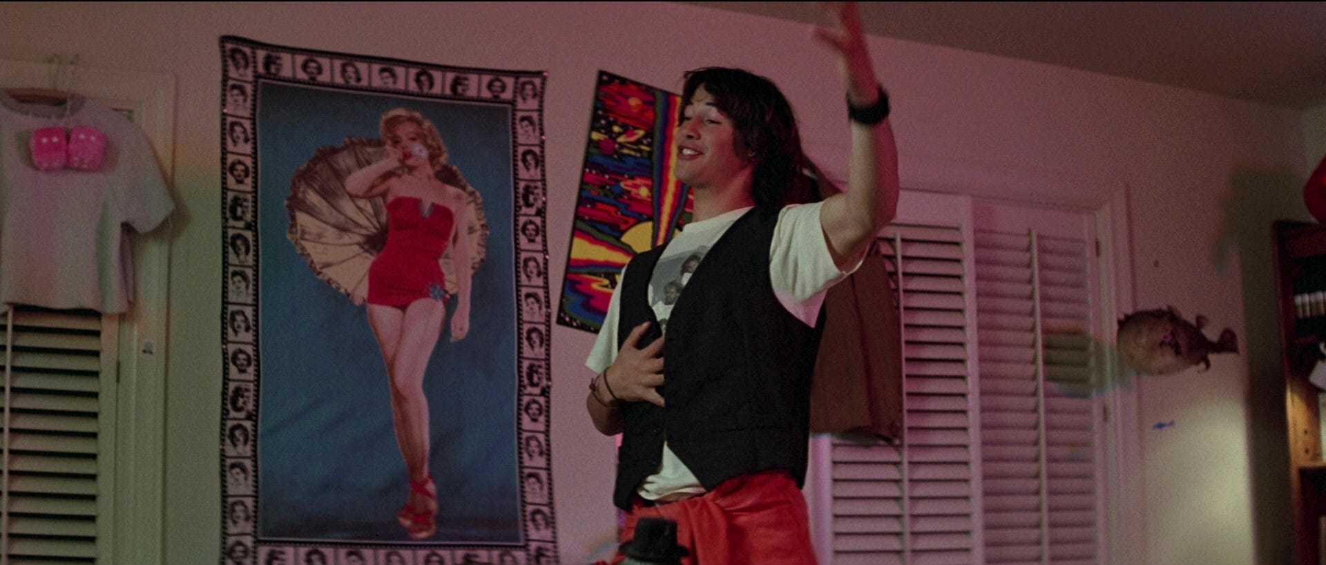 During auditions in Los Angeles, Keanu Reeves, who’d been featured in the critically acclaimed River’s Edge (1986) and little else, stood apart with a lovable sort of goofiness that seemed perfect for Bill. Alex Winter, a film student at Tisch School of the Arts at New York University, developed the best rapport with Reeves in auditions, both showing up on motorcycles, both bass players. For Winter, it was just another gig, but also not. The actor recalled, “What struck me at the time was the language. It was very distinct for what was presented as a teen comedy. It wasn’t like other teen comedies–God knows you’d audition for a ton of those. If it wasn’t a John Hughes movie it was a knock-off John Hughes movie and the language was always the same: teens acting like forty-year-olds in therapy. Bill and Ted were very childlike and spoke in this ornate way. That stood out. It was more fun.” Solomon added, “[Alex and Keanu] are really charming, smart and good looking guys. When Chris and I initially wrote the characters we pictured spotty guys with low rider jeans with their boxers sticking out, heavy metal T‑shirts and long hair. What Alex and Keanu brought was a more winning and charming personality, and what they embody that’s crucial to who Bill and Ted are is a benevolence of spirit and positivity. As soon as it was them, it was them.”