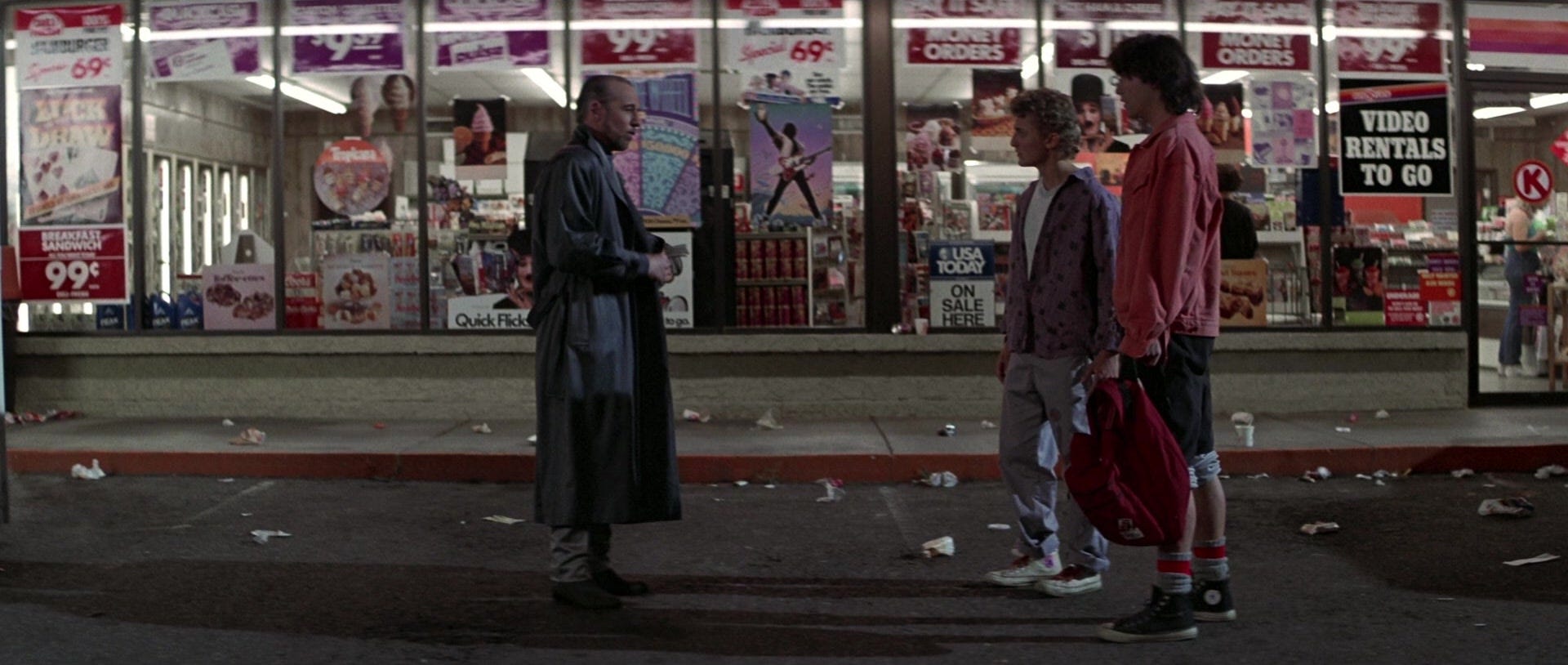 A test screening for Bill & Ted’s Excellent Adventure was booked in the best home field a teen comedy could have: the Sherman Oaks Galleria in Sherman Oaks, California. Ed Solomon claims he was visiting the mall and with no expectation of being recognized as the co-writer, was recruited to attend the screening, a free movie pitched to him as George Carlin helping some boys travel through time. Solomon passed, realizing later his participation in the focus group as a ringer might have helped his own movie get a release. This turned out to be unnecessary. To the surprise of everyone involved in the film, its test scores in Sherman Oaks went through the roof. Certain this was a fluke, Orion scheduled a second screening as far from Southern California as they could get: Secaucus, New Jersey. Those scores were even higher. Buoyed by the results, Orion set Bill & Ted’s Excellent Adventure for a release on President’s Day weekend, February 17, 1989, in 1,196 theaters. This was almost half the screens Universal Pictures was opening the Tom Hanks comedy The ‘Burbs in, but critics pinned both films with some of the worst reviews of the year. Gene Siskel and Roger Ebert didn’t even bother attending a press screening of Bill & Ted’s Excellent Adventure.