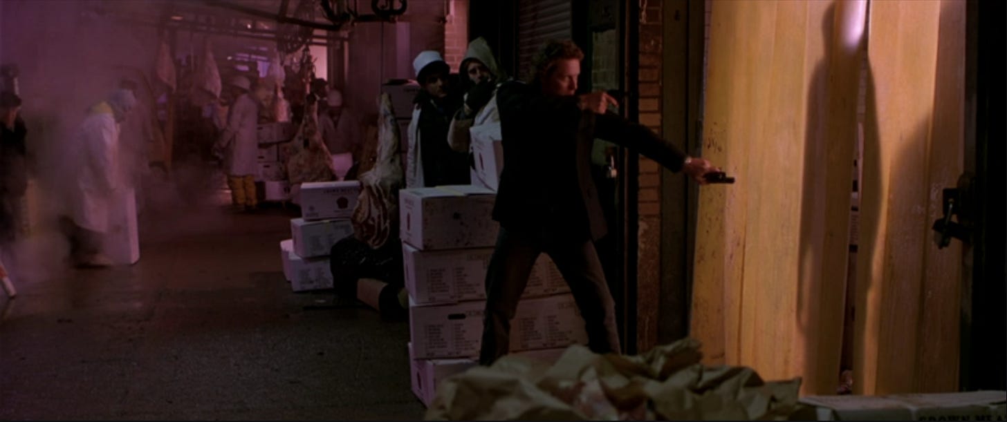 The script–in which a dirty NYPD detective and his partner transport a Japanese gangster home, only to let him slip through their fingers when they arrive–would film extensively in urban locations. The producers quickly realized the reason films made in Japan seemed to take place in the countryside: filming in cities like Tokyo was a logistical nightmare, with permissions, permits and scheduling taking a great deal of time to negotiate, especially by western standards. By February 1988, Verhoeven felt he’d waited long enough and was poached by Arnold Schwarzenegger to direct Total Recall (1990). Jaffe and Lansing, producing Black Rain “in association” with Douglas, offered the directing job to Ridley Scott. Despite the 1988 Writers Guild of America strike halting any work on the script beginning March 7 until the work stoppage would be lifted on August 7, production designer Norman Spencer spent nearly that entire time–five and a half months–scouting locations in Japan with Scott and Jaffe. To his disappointment, Scott found Tokyo and Kyoto too clean and newly constructed in comparison to New York, which Scott valued for its grittiness, visceral locations like the Meatpacking District, in which Nick Conklin, the cop played by Douglas, pursues the bad guy Sato on foot into an abattoir.