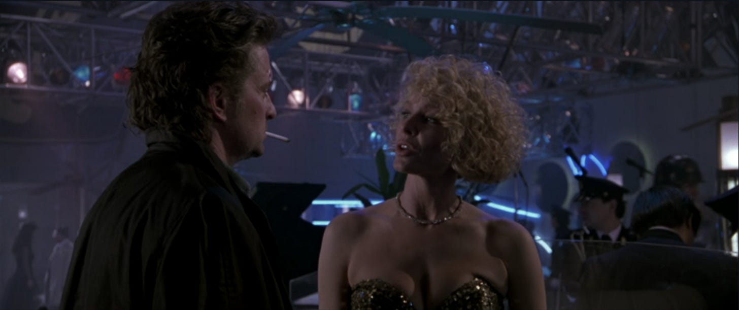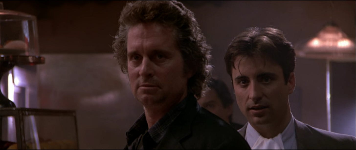 Though completed a year after the writers strike lifted, Black Rain shows all the signs of being hurried before cameras with a script sketched out on a legal pad. It obeys the Maverick Cop playbook line by line. Nick Conklin is living on the edge (he’s introduced on a Harley-Davidson café racer, challenging a Suzuki rider to race from under the Brooklyn Bridge to the Manhattan Bridge) and returns to an empty apartment with the ex-wife on his answering machine (the ex-wife and the answering machine are believable). He does things his way despite exhibiting zero facility for investigative work. The problem isn’t that Conklin is unlikable, a yahoo as well as a crooked yahoo, it’s that he’s produced by cookie cutter. Running 125 minutes, the movie is one that could’ve improved dramatically with just two pages/minutes of material, Michael Douglas ideally coming across as a man as opposed to an action figure acting out a plot, with late eighties dialogue in which he calls everyone “pal” twelve times too many.
