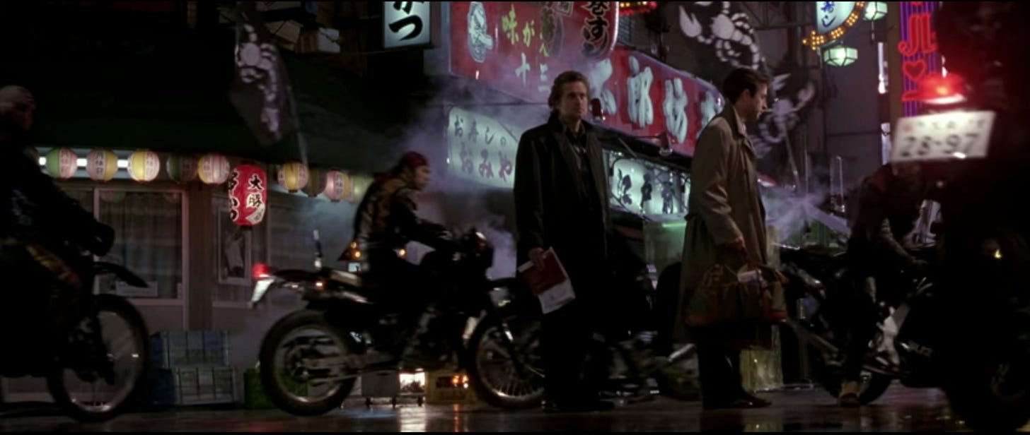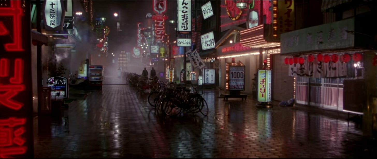 The Japanese cast–Yūsaku Matsuda as Sato, Ken Takakura playing against type as a law-abiding cop, Tomisaburô Wakayama as the Yakuza boss–communicated with Scott through an interpreter. The crew consisted of roughly forty-five westerners on work visas, with 120 jobs being filled by Japanese. While Scott maintained that the local government was more accommodating than the one in Tokyo had been, Osaka authorities were adamant that filming regulations be adhered to without exception. In a case of life imitating art to a degree they didn’t anticipate, the filmmakers found themselves wrapped in the same red tape that Conklin faces as a foreigner working in Japan. Ridley Scott, who’d directed countless commercials, was accustomed to changing camera setups on the fly and paying overtime if necessary to finish his work in as few days as possible, but discovered overtime didn’t exist in Japan, where authorities issued permits down to the minute and had police standing by to halt filming.