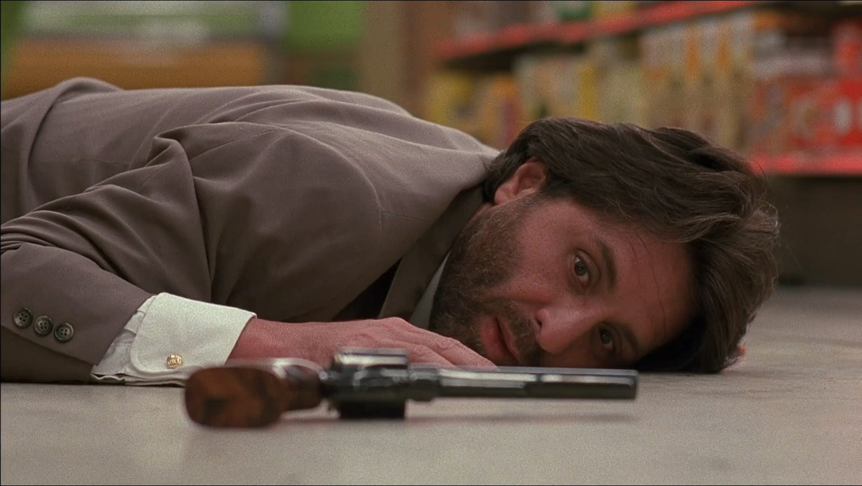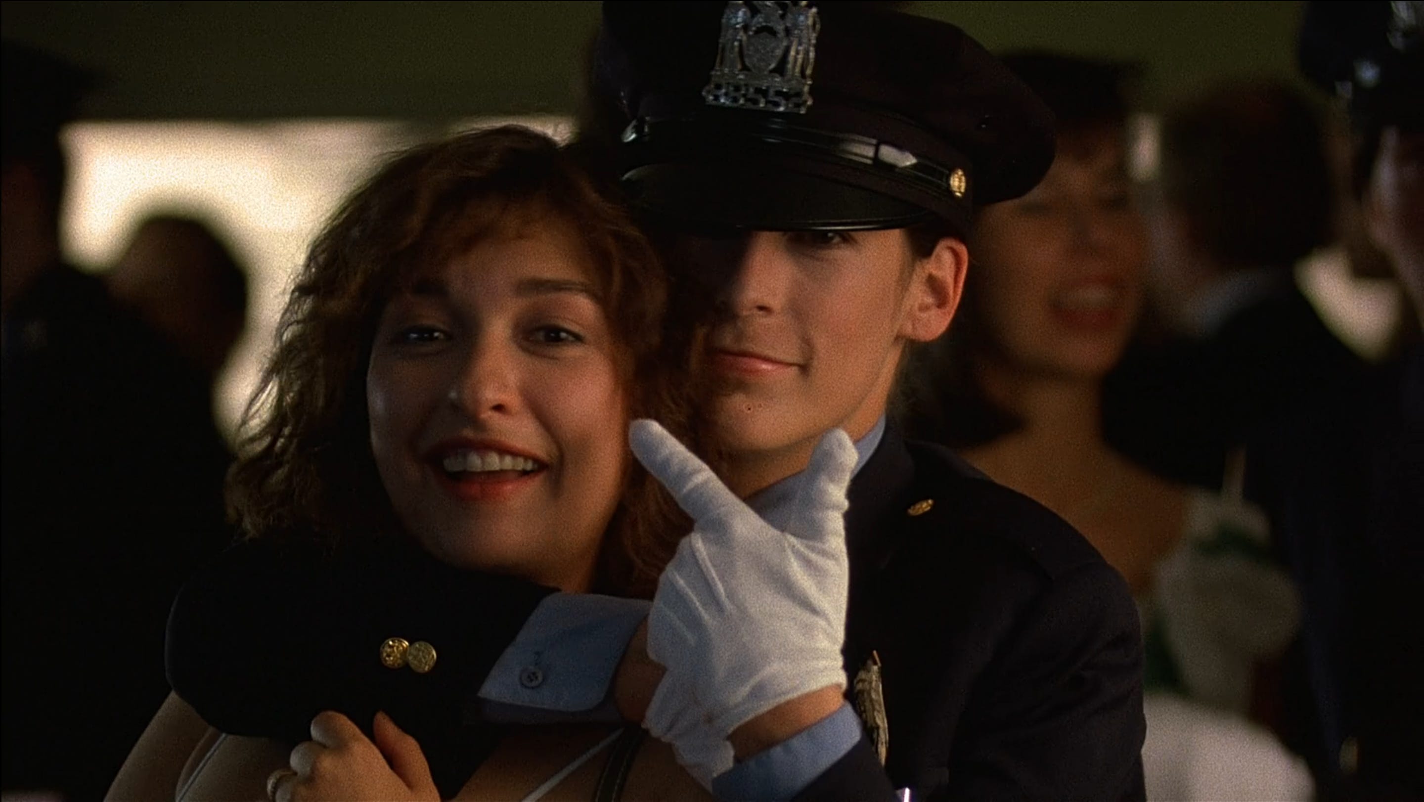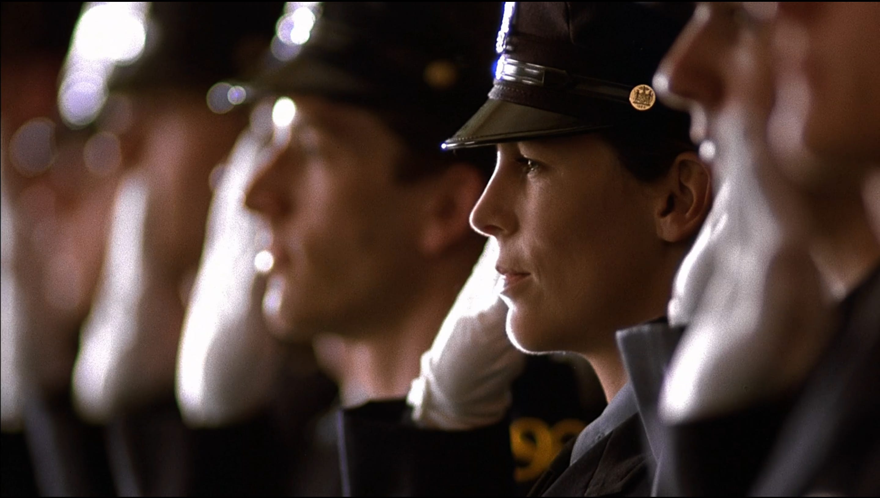On a dry or sober mind, there are things about Blue Steel that stick out as ridiculous. The police shooting that sets the plot in motion defies credulity. Our protagonist is lobbed an armed robbery practically her first hour on the job, which even in the New York of Mayor Ed Koch, must have seemed like hitting the lottery for a woman who just told her partner that she joined the NYPD to shoot people. It’s a facile line we don’t buy, but that Jamie Lee Curtis lacks the relaxed manner to convey as humor. The shooting would’ve been more compelling–particularly with a hard charging actor like Curtis–if her character expressed uncertainty about how she’ll handle herself under fire, having flunked the simulation during training. The logistical inconsistencies begin when rather than wait for her partner, or at least radio dispatch that she’s about to engage an armed robber, she charges in alone. That none of the witnesses, including the cashier, would remember seeing the robber wield a .44 Magnum, is fantasy. None of them would’ve dropped to the ground or feared for their lives unless they saw a gun. It’s just as unlikely that Silver’s character would be able to pocket a hand cannon like that without anyone observing him. And even in the eighties, it’s highly improbable that her superiors would assume Turner fired without provocation, without even considering someone at the scene absconded with the weapon.