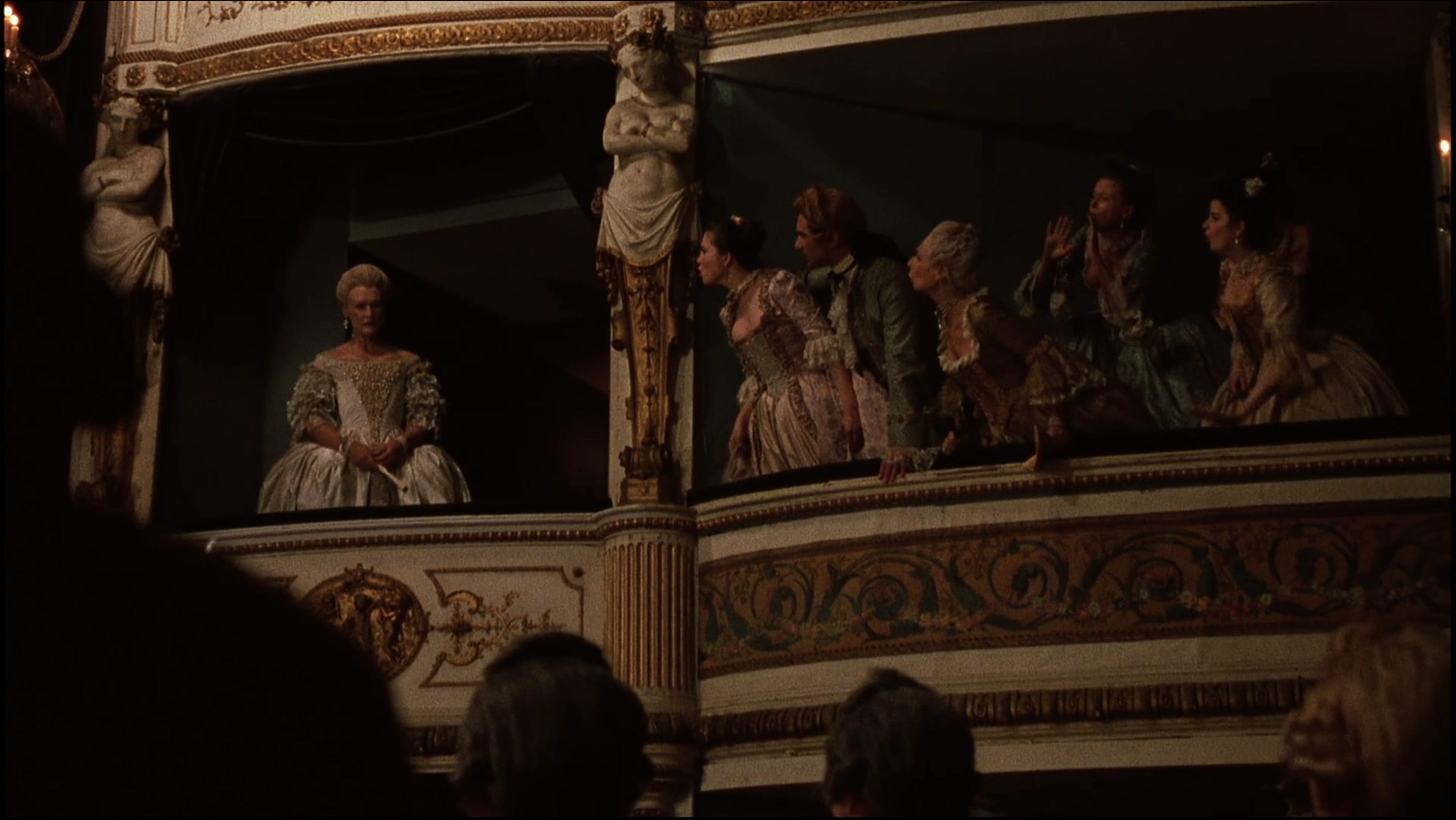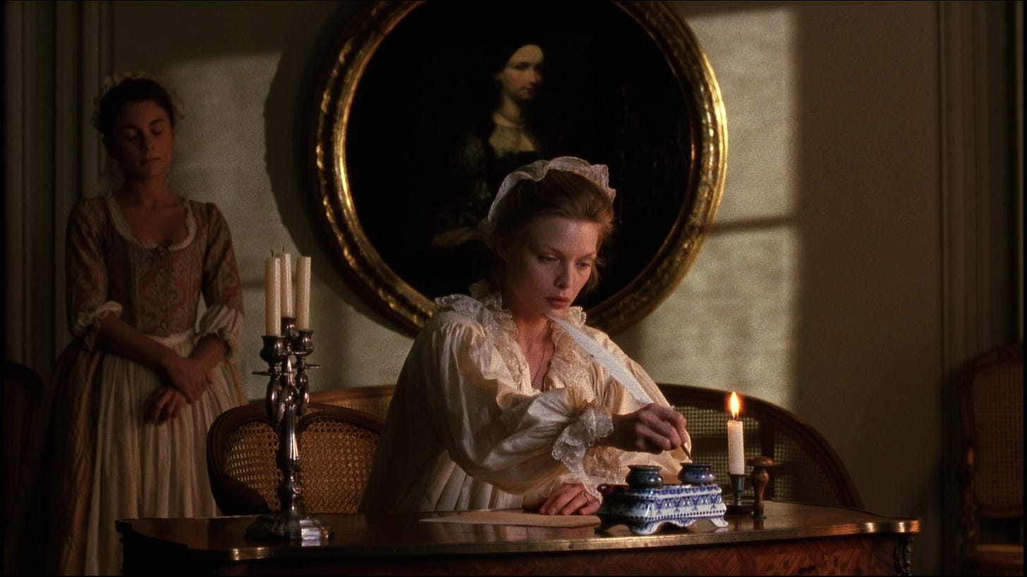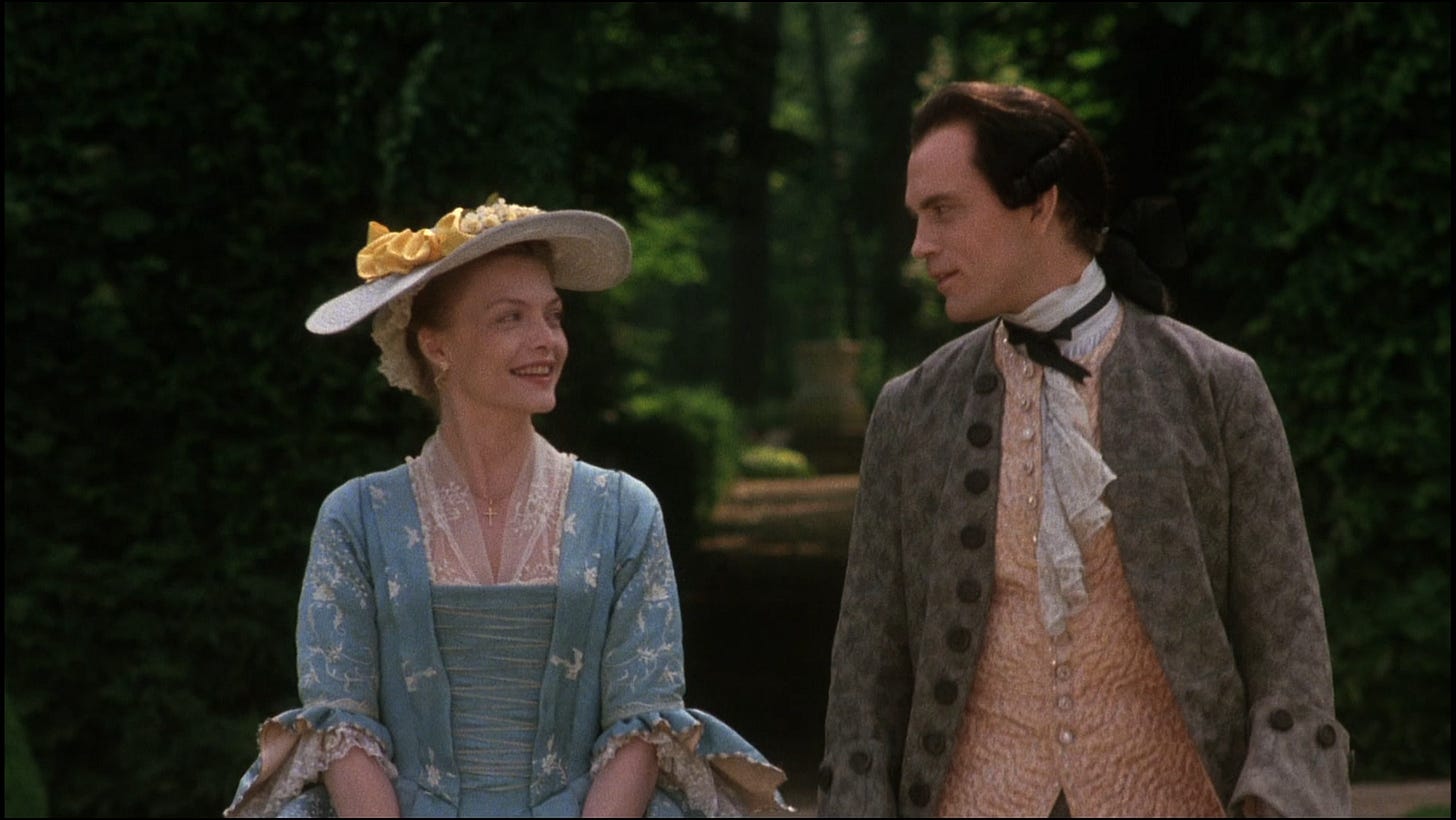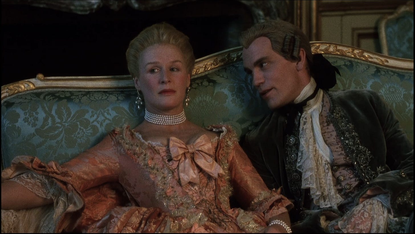 Though it was first out of the gate and didn’t suffer in comparison at the time, Dangerous Liaisons doesn’t hold a candle to Valmont. Miloš Forman’s take on the material is not only visually splendid, but compared to those in Christopher Hampton’s stage play, its characters are younger, coming across as more randy and less Machiavellian, which is its own form of cruelty, the callousness in which nature wastes youth on the young. Valmont is a more sensual film too, though despite being financed with European money, not as dark as this American-made version. Taken on its own, Dangerous Liaisons is often delightful in the way it calls back to the Golden Age of Hollywood. Except for being in color and having end credits, much of the film is punctuated like one produced in the 1930s. Characters enter rooms at the beginning of scenes and often exit then when the scene is over. George Fenton, who composed the music for The Company of Wolves (1985) and was starting on a prolific musical career in film and television, turns in a serviceable score that promptly moves the action from scene to scene.