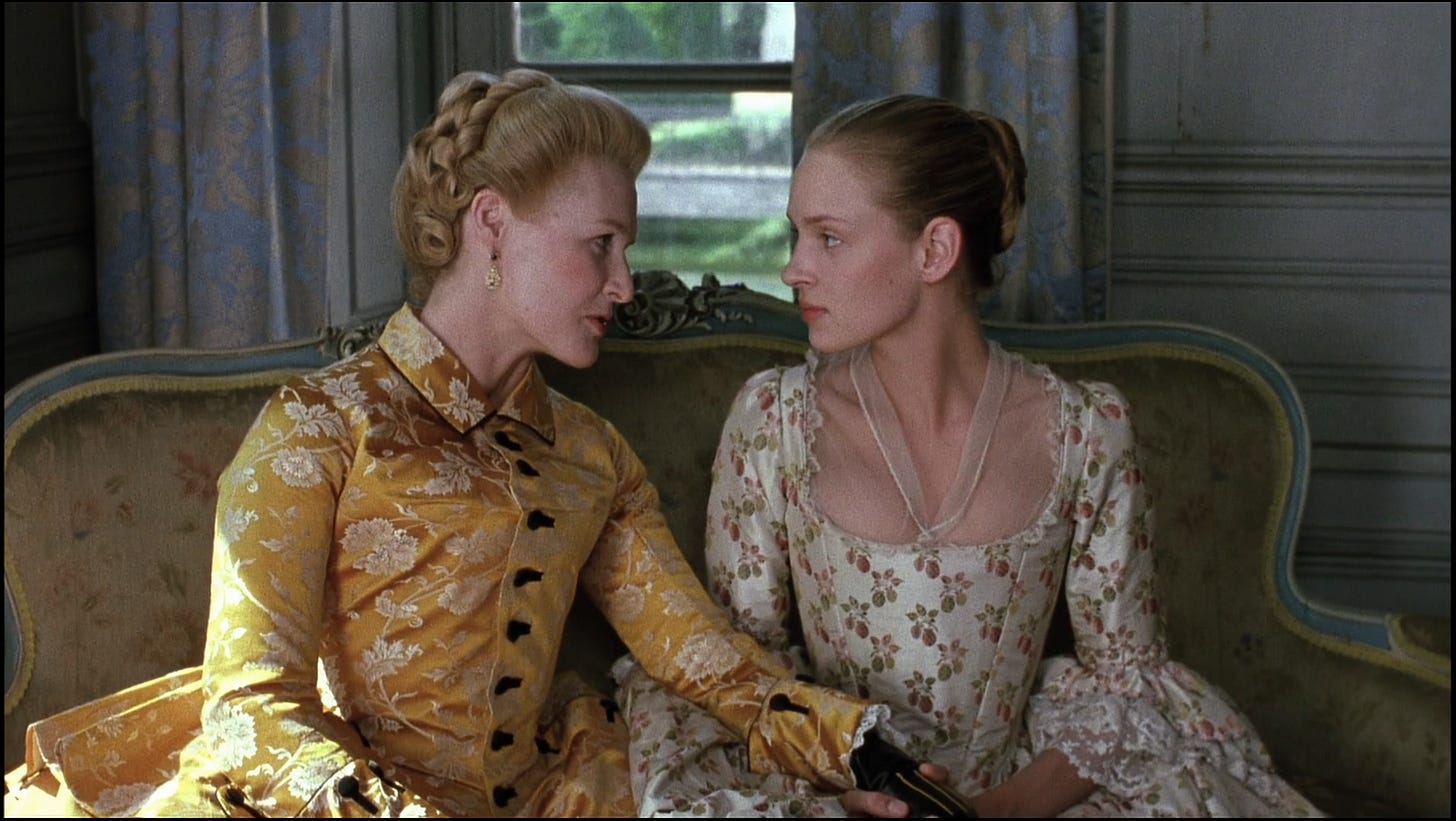 In Hampton’s play, words are not only currency, but filed and used as weapons. John Malkovich’s portrayal of Valmont is where this combative quality had the most opportunity to flourish, but other than his character’s adversarial relationship with Madame de Volanges (Swoosie Kurtz, the most overbearingly American in a cast full of them), the film isn’t nearly as droll as it could’ve been if writing had more time to work on the script with directing. Characters come across as lazy and bored instead of rebellious and combative. The casting is a C+. Glenn Close is far less formidable as Merteuil than she would’ve been as Madame de Volanges. As a femme fatale who yanks Valmont to the end of his rope, Merteuil was the perfect role for an otherworldly presence like Michelle Pfeiffer, not someone as grounded in the 20th century as Close. Malkovich seems on loan from a Hitchcock thriller, his portrayal of Valmont vile and creepy rather than seductive. He’s an effective villain, but an obvious one. The less said of Keanu Reeves as a music instructor in 18th century France, the better. Only Uma Thurman, wonderful as an intellectual and emotional child in the body of a budding superwoman, stands out among the cast. The final scene and the closing moments are far and away the strongest in the picture, suggesting a story that starts way too soon, employing what is backstory as its main story.