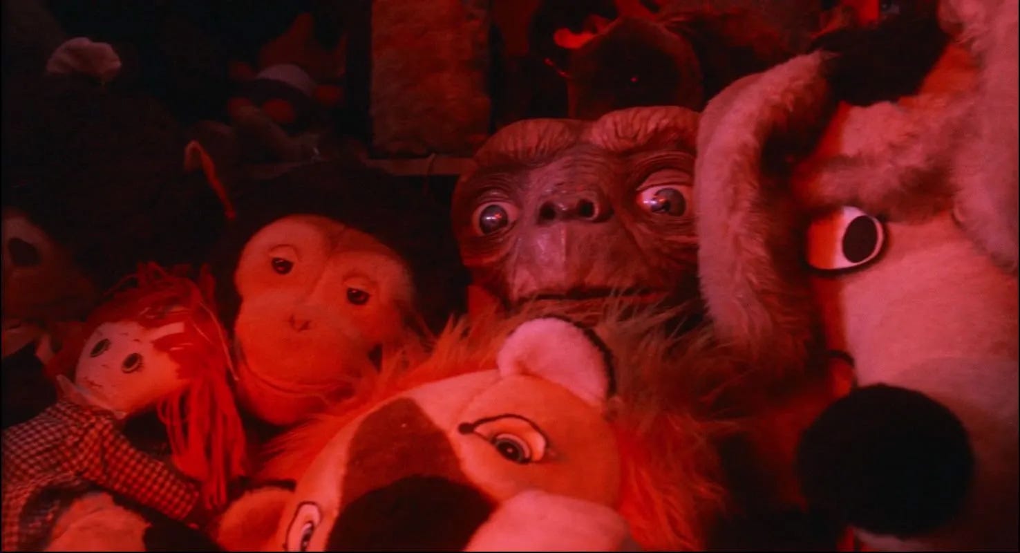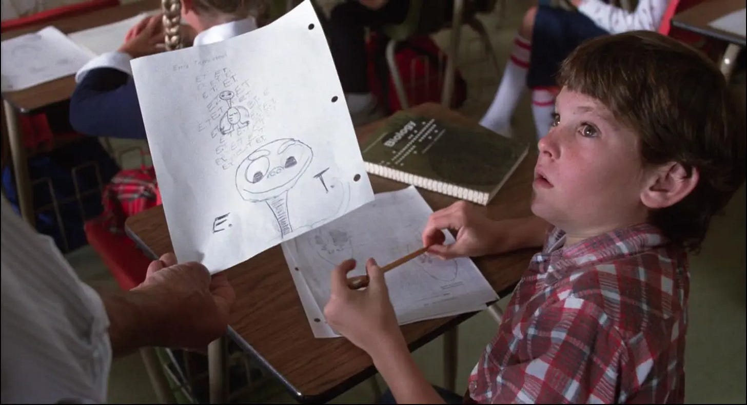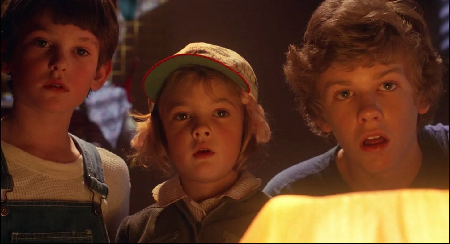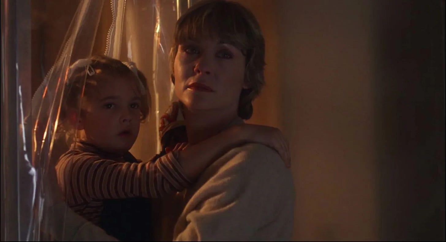 One of the delights of E.T. the Extra-Terrestrial is that it validates for those of us who believe we’re not alone in the universe that intelligent life is not only out there, but that it could visit us and remain anonymous because most adults would be too busy to notice. In its funniest scene, Mary is so preoccupied–unloading groceries, tending to Gertie, taking a call from Ellott’s school–that she doesn’t see an alien waddling through her kitchen (Drew Barrymore’s line when Dee Wallace hits E.T. with the refrigerator door, “Here he is. The man from the moon, but I think you've killed him already,” is hysterical). For all the criticism Steven Spielberg accepted for his comedy 1941 being unfunny, there are laugh out loud moments throughout all of his action/ adventure films, and operating with material that he could relate to from the inside out, E.T. tickles the funny bone more effortlessly than any film he’d made before or since. Its young cast–including future Playboy Playmate Erika Eleniak, who memorably popped out of a cake in Under Siege (1992)--are directed in a way that they understand who their characters are, Mathison and Spielberg knowing what each child’s relationship would be and what they’d be doing from scene to scene as a real child, not a movie character acting out a plot. Specifically, E.T. is made possible by the children of one particular generation, Generation X, who grew up unmonitored. Today’s children exist under such a microscope that Elliott’s encounters with E.T. would be recorded by security cameras, the movie proceeding very differently, if at all.