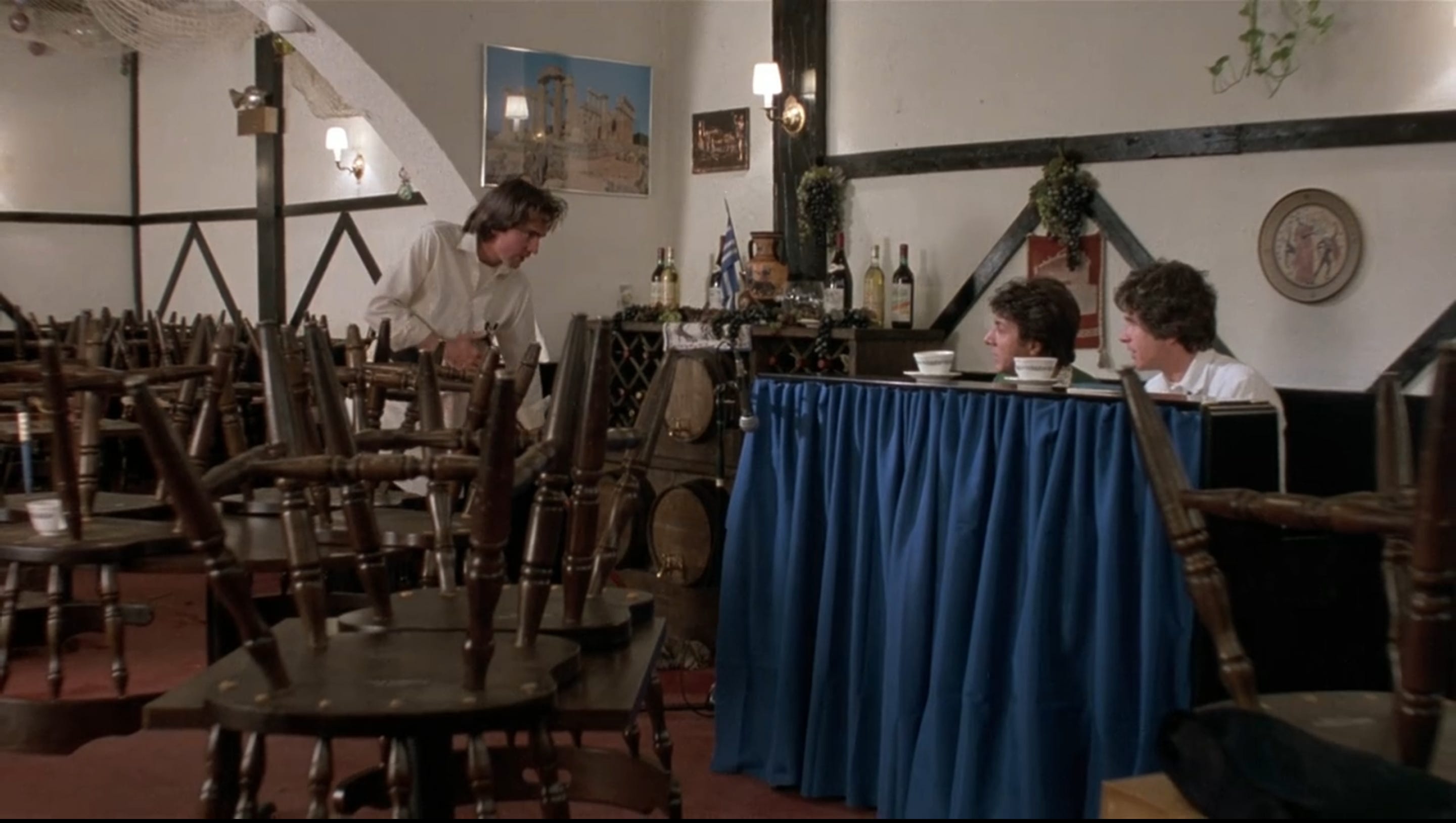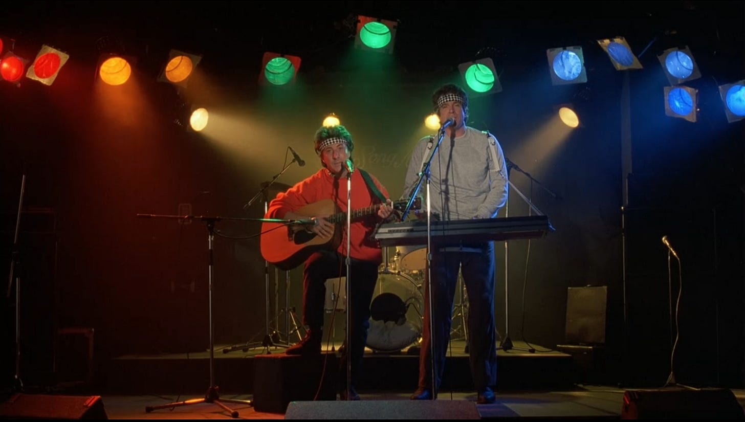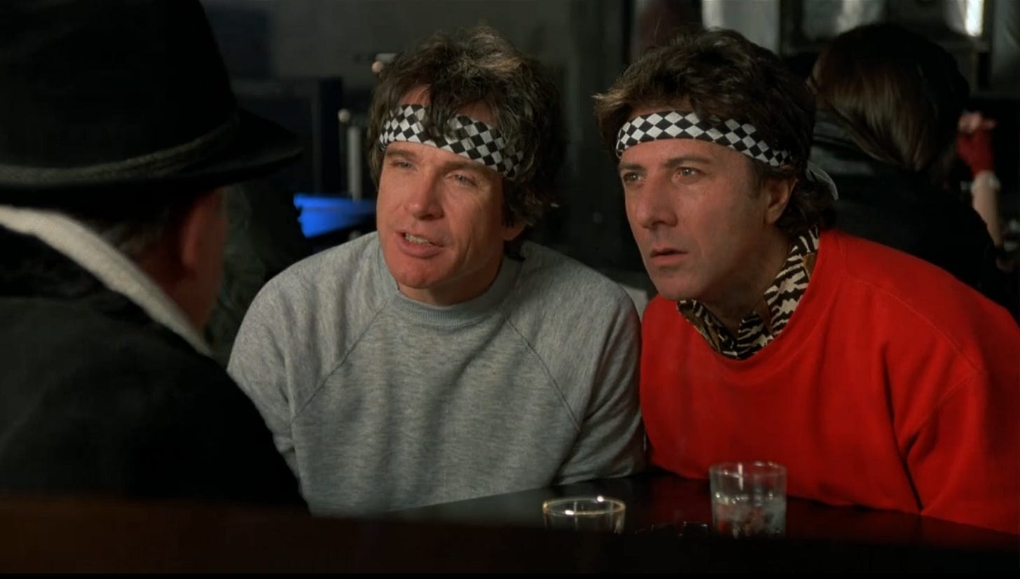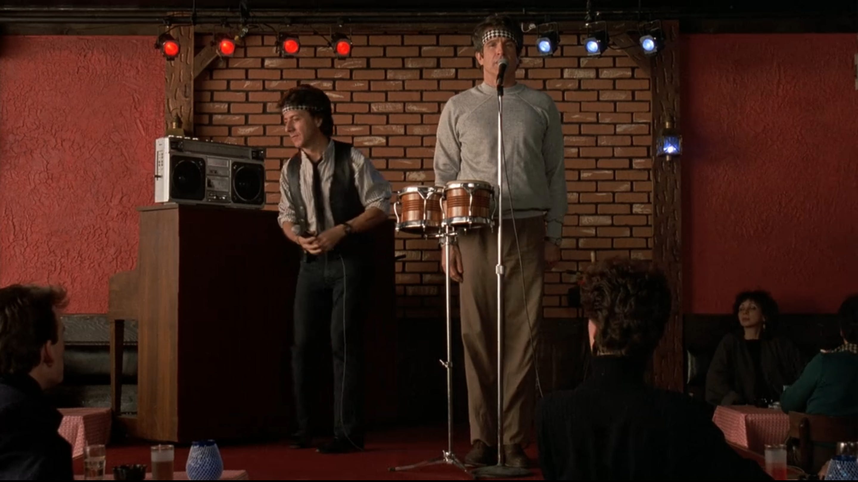There’s a lovely bulb hidden in a ball of Christmas lights that neither Elaine May or her editors are able to untangle in Ishtar, much less turn on. The film’s brilliant little question is whether it’s better to go through life failing at something we love, or succeeding at something we don’t. Love isn’t just what the world needs more of, it’s what Ishtar needed more of too, along with structure. The movie opens as if at least 15 minutes are missing. The bromance between Lyle Rogers & Chuck Clarke–rarely have two characters been so adroitly named–is missing a “meet cute,” for one thing. If this premise was real, the men might’ve been introduced by their wife (Tess Harper) and girlfriend (Carol Kane) at a social function neither wanted any part of. Realizing they share a passion for songwriting, they would need to be separated–perhaps from the garage Clarke has converted into a dumpy studio–in order to return to their lives, which they now no longer can. Fueling each other’s delusions, their family and friends would try to break the news that they aren’t any good. At the very least, this would’ve given Harper and Kane measurable screen time rather than the cameos they’re reduced to. There was potential here for a gentler companion to Martin Scorsese’s The King of Comedy (1983), in which a schmuck risks everything for his art. One lesson May might’ve taken from the Scorsese picture is that Rupert Pupkin (Robert DeNiro) doesn’t take the stage until its climax, and when he does, we’re surprised by how professional this amateur’s set is. Rather than build their act and their friendship, May is backed into a corner because neither Warren Beatty nor Dustin Hoffman were willing for their characters to be introduced second. By introducing them at the same time, performing the catchiest song of the soundtrack (“Dangerous Business,” music and lyrics by Paul Williams), the movie comes out of the gate with its closer.