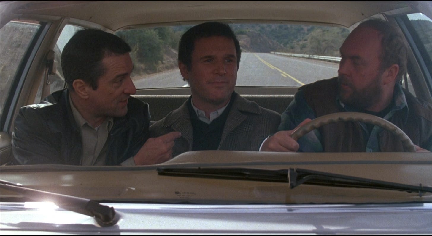 While Gallo had written the role of Alonzo Mosley, FBI, with actor Yaphet Kotto in mind, Jack Walsh and Jonathan Mardukas were blank slates. Brest’s agent at CAA, Jack Rapke, suggested Robert DeNiro. Stories of how he’d put on eighty pounds for his Academy Award winning role of Jake LaMotta in Raging Bull (1980) had earned DeNiro the reputation as the greatest actor of his generation, but he worked infrequently, starring in twelve films since his breakout year in 1973, few if any of them packing in crowds. DeNiro had wanted to make a comedy, meeting with director Penny Marshall for the lead in Big (1988) before both sides agreed that someone like Tom Hanks would be more appropriate. With chemistry such a vital ingredient for Midnight Run, auditions commenced for the part of DeNiro’s co-star. Most of the actors seemed intimidated. Charles Grodin was a bright exception. Grodin had been cast as a leading man by Elaine May in The Heartbreak Kid (1972), but had since played the heel in movies like Heaven Can Wait (1978), Seems Like Old Times (1980) and The Great Muppet Caper (1981). While studio president Ned Tanen was anxious about DeNiro’s ability to attract a wider audience, he refused to bank on Grodin. Tanen argued that the actor wouldn’t even be available by the start date Paramount was aiming for. He suggested the script be rewritten so that a woman might play Mardukas. This gave Brest and DeNiro fuel to hold sham auditions, interviewing men and women, dragging out the casting process until Grodin became available.