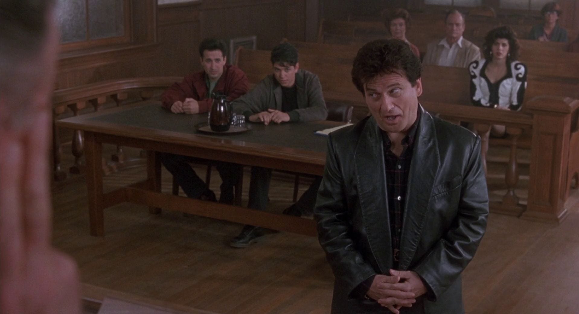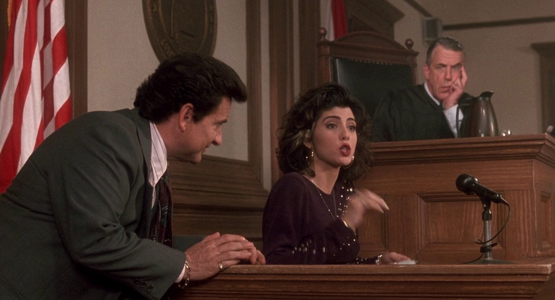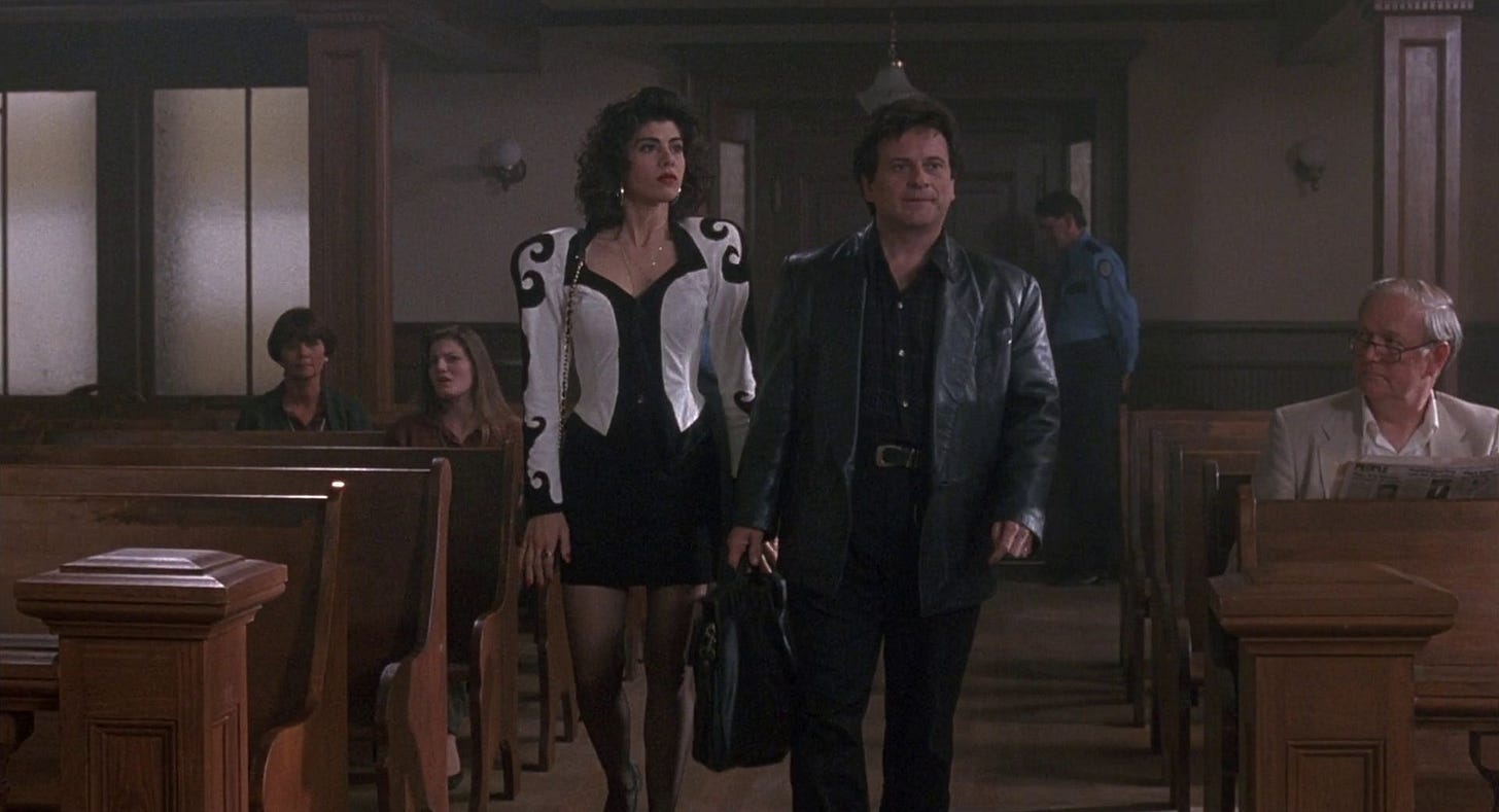 The weakest sections of My Cousin Vinny are its crime and the two characters accused of it. This may have not only been unavoidable, but necessary. Even at 120 minutes–the similarly themed Pauly Shore comedy Son-In-Law (1993) would go down south and back in 95 minutes–there wasn’t time to build a twisty murder mystery, with the real culprits at large and complexities examined between the accused. Ralph Macchio and Mitchell Whitfield, who in a comedy like Stir Crazy (1980) would’ve played the main characters, are in the way of a better movie, and director Jonathan Lynn cuts them loose. The better movie is about Vinny and his fiancée Lisa. On what initially appears to be a completely different track from the courtroom intrigue, their scenes are about men trying to perform an insurmountable task and women who are able to help and anxious to help, but need to be asked. Vinny and Lisa are portrayed like a real couple, not a comic couple, Launer understanding every question we could have about them. There’s a lot that Vinny and Lisa don’t know, but being from New York, and Italian American to boot, they love to argue, even using it in foreplay. In one of the film’s best scenes, they argue about a dripping faucet, not because they’re trying to hurt each other, or because either of them cares about water conservation, but because debate excites them. This gives them a puncher’s chance of forcing the state to dismiss the charges against their clients. Because he can’t dig them out of prison, Vinny has to learn criminal court procedure, and this is the other track the movie excels on.