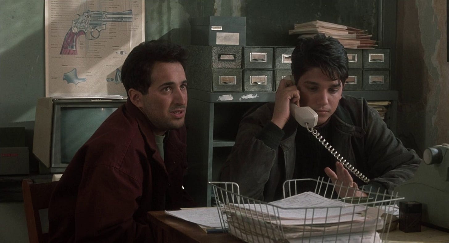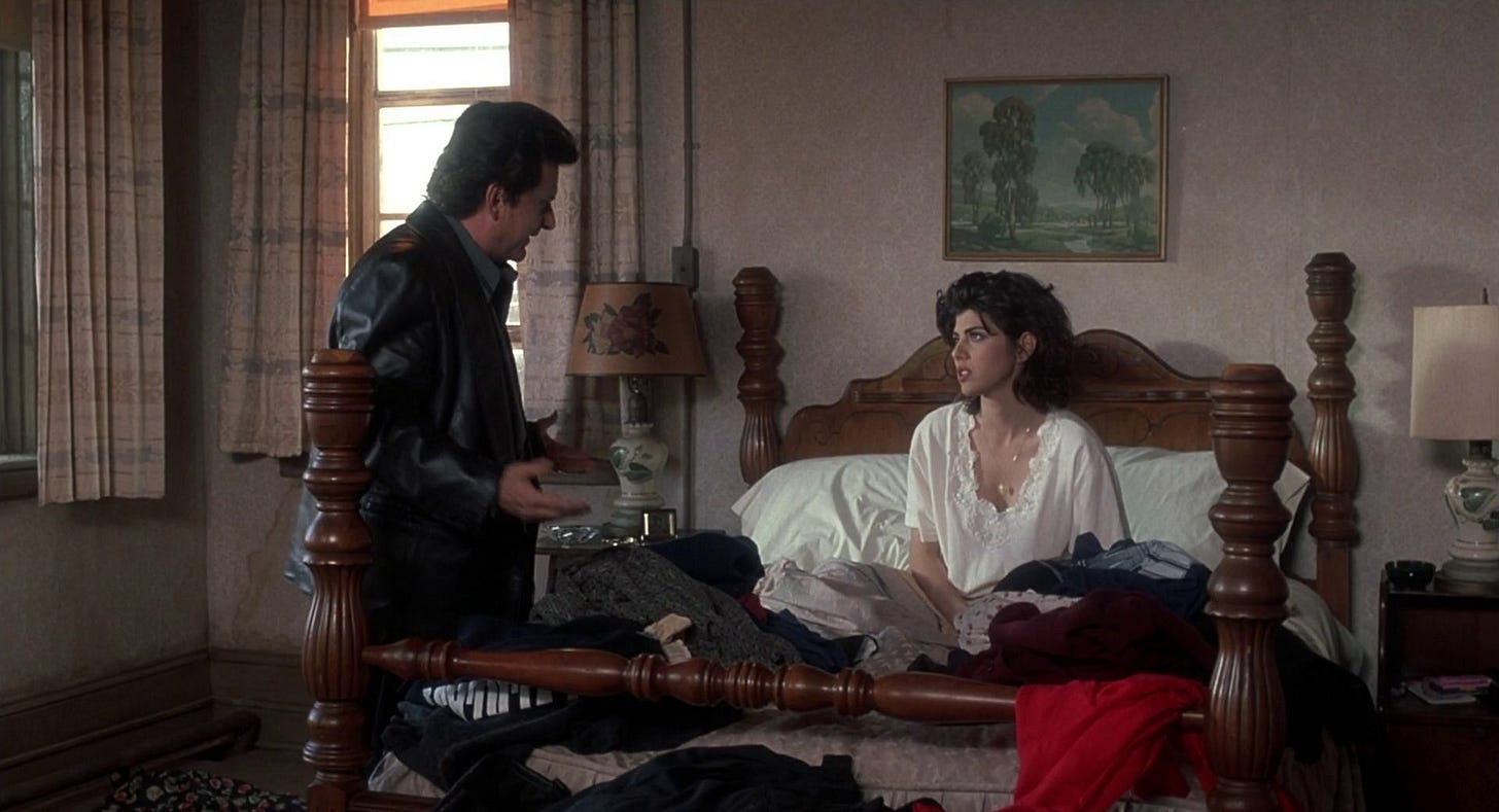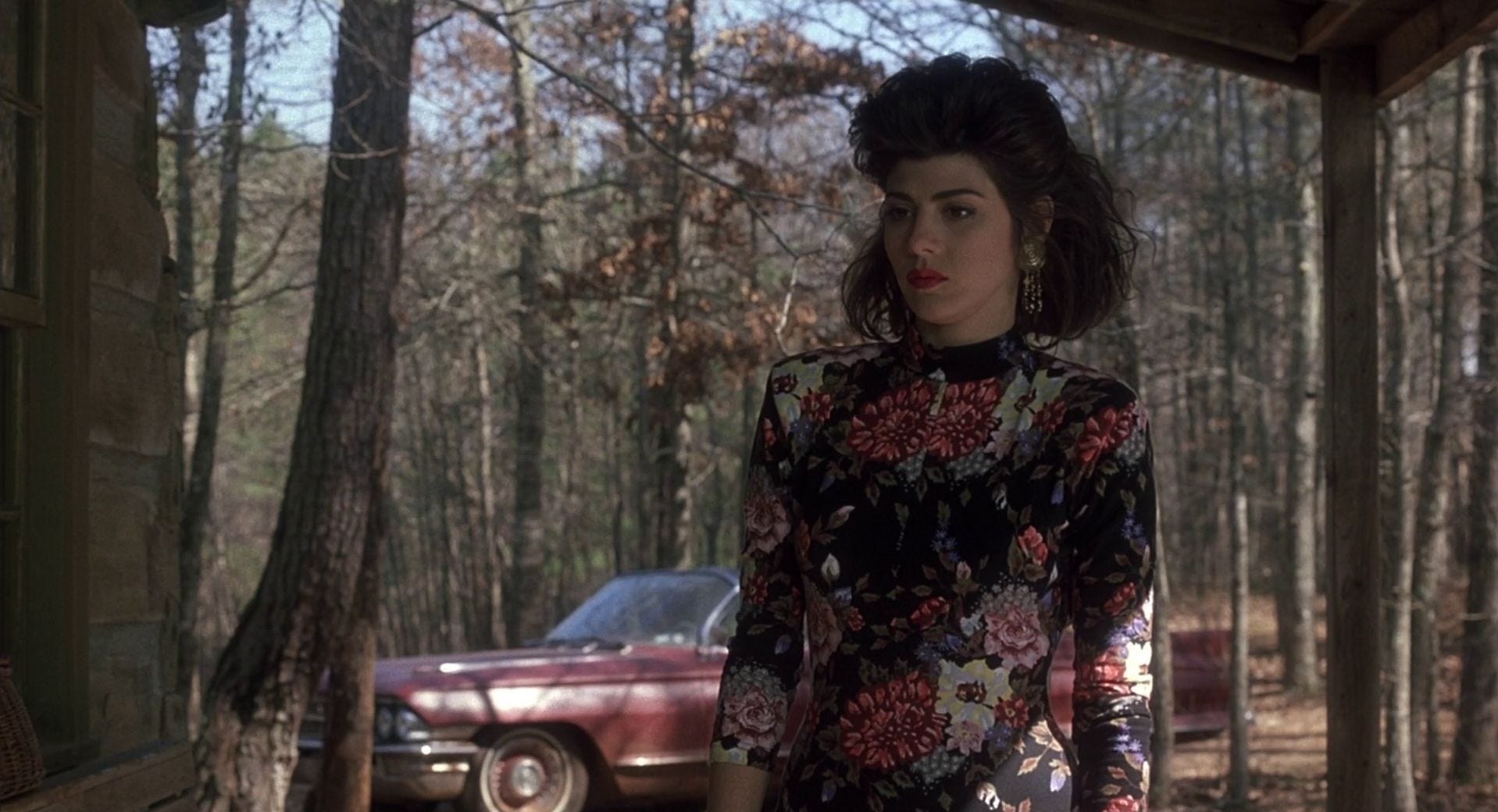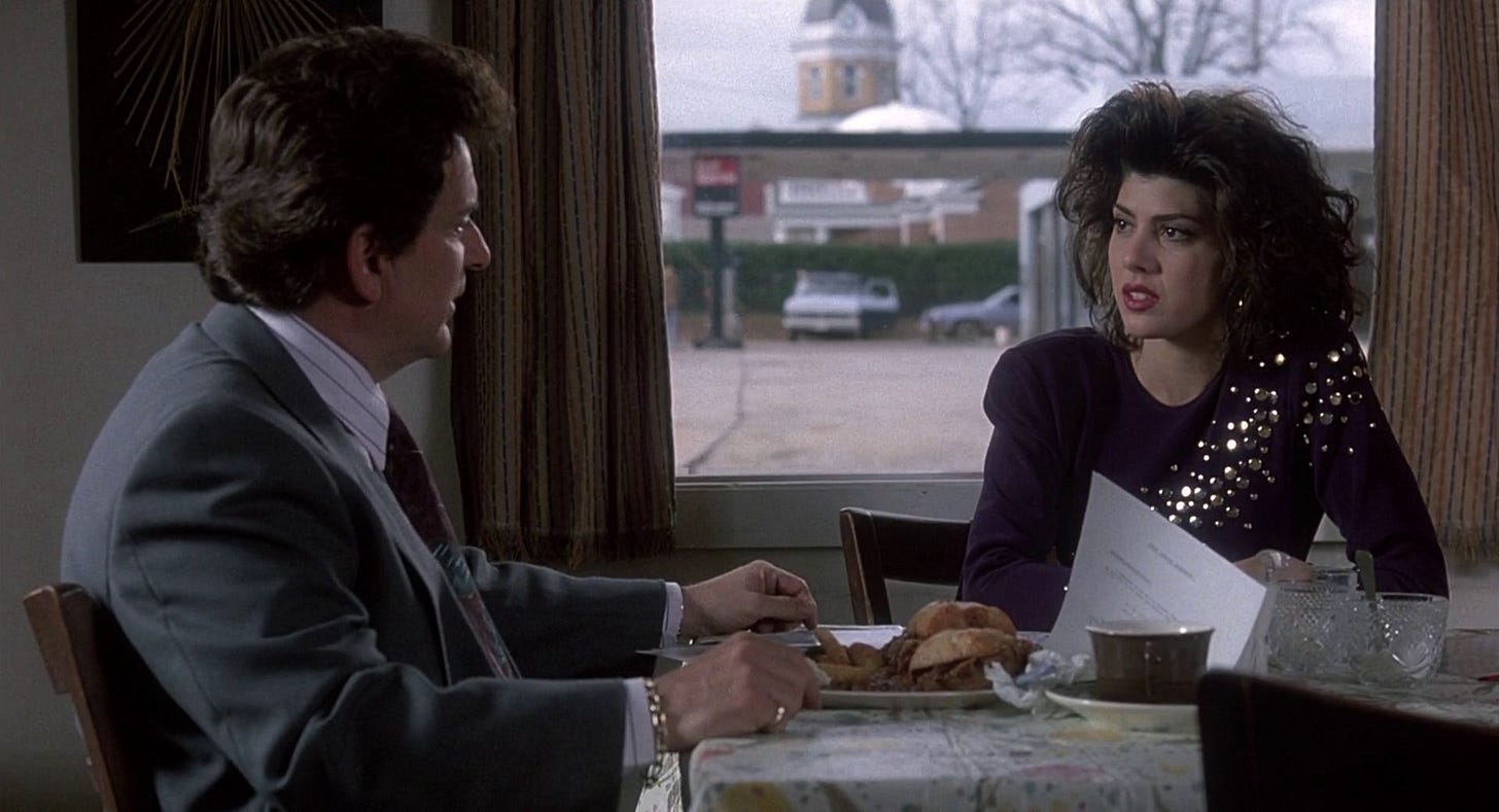 The weakest sections of My Cousin Vinny are its crime and the two characters accused of it. This may have not only been unavoidable, but necessary. Even at 120 minutes–the similarly themed Pauly Shore comedy Son-In-Law (1993) would go down south and back in 95 minutes–there wasn’t time to build a twisty murder mystery, with the real culprits at large and complexities examined between the accused. Ralph Macchio and Mitchell Whitfield, who in a comedy like Stir Crazy (1980) would’ve played the main characters, are in the way of a better movie, and director Jonathan Lynn cuts them loose. The better movie is about Vinny and his fiancée Lisa. On what initially appears to be a completely different track from the courtroom intrigue, their scenes are about men trying to perform an insurmountable task and women who are able to help and anxious to help, but need to be asked. Vinny and Lisa are portrayed like a real couple, not a comic couple, Launer understanding every question we could have about them. There’s a lot that Vinny and Lisa don’t know, but being from New York, and Italian American to boot, they love to argue, even using it in foreplay. In one of the film’s best scenes, they argue about a dripping faucet, not because they’re trying to hurt each other, or because either of them cares about water conservation, but because debate excites them. This gives them a puncher’s chance of forcing the state to dismiss the charges against their clients. Because he can’t dig them out of prison, Vinny has to learn criminal court procedure, and this is the other track the movie excels on.