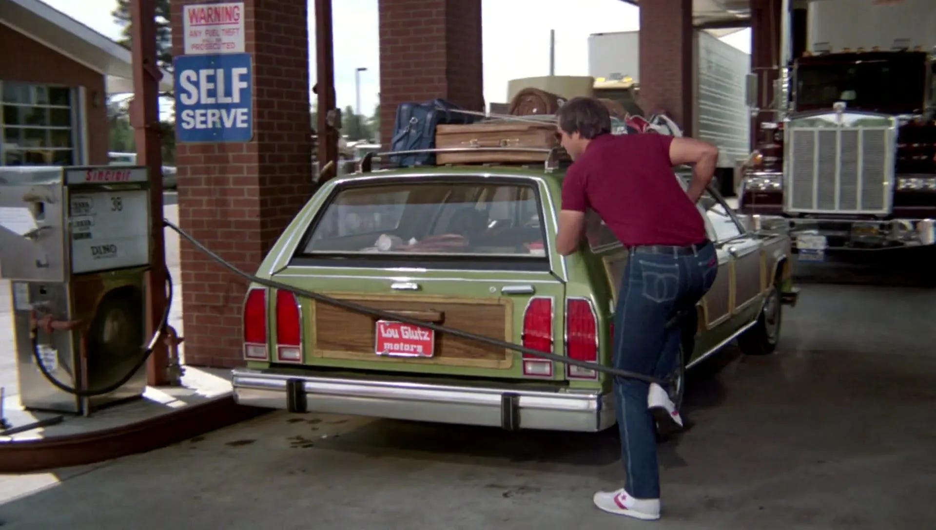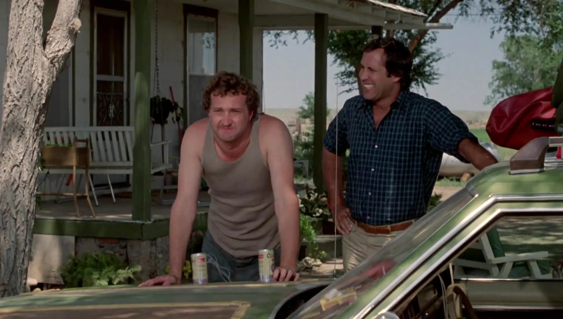 To play the “Wagon Queen Family Truckster,” five ‘79 Ford LTD Country Squires were bought and modified for the show. Once he became a director, John Hughes would apply the same pea green paint and wood siding to what he called a “Gran-Detroit Farm & Country Turbo,” the convertible sedan Steve Martin and John Candy get stuck with in the road comedy Planes, Trains and Automobiles (1987). National Lampoon’s Vacation commenced shooting in July 1982 in Boone, Colorado, which stood in for rural Kansas in the Cousin Eddie scenes. The movie would be shot mostly in Colorado and the Los Angeles area. “Lou Gultz Motors” was filmed outside Glendale Chrysler and Jeep in Glendale (with mountains visible in the background for what is supposed to be Chicago), while exteriors for the Griswold homestead were shot in Los Feliz. The rough side of St. Louis was spoofed on the Warner Bros. backlot. The picnic scene featuring Brinkley was filmed at Shaw Creek Rest Area in South Fork, Colorado. The hotel where Chase and Brinkley cavort in the pool was filmed near Los Angeles, at the Hotel Saddleback in Norwalk.