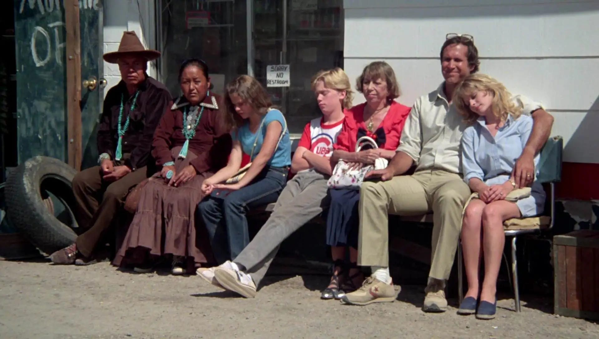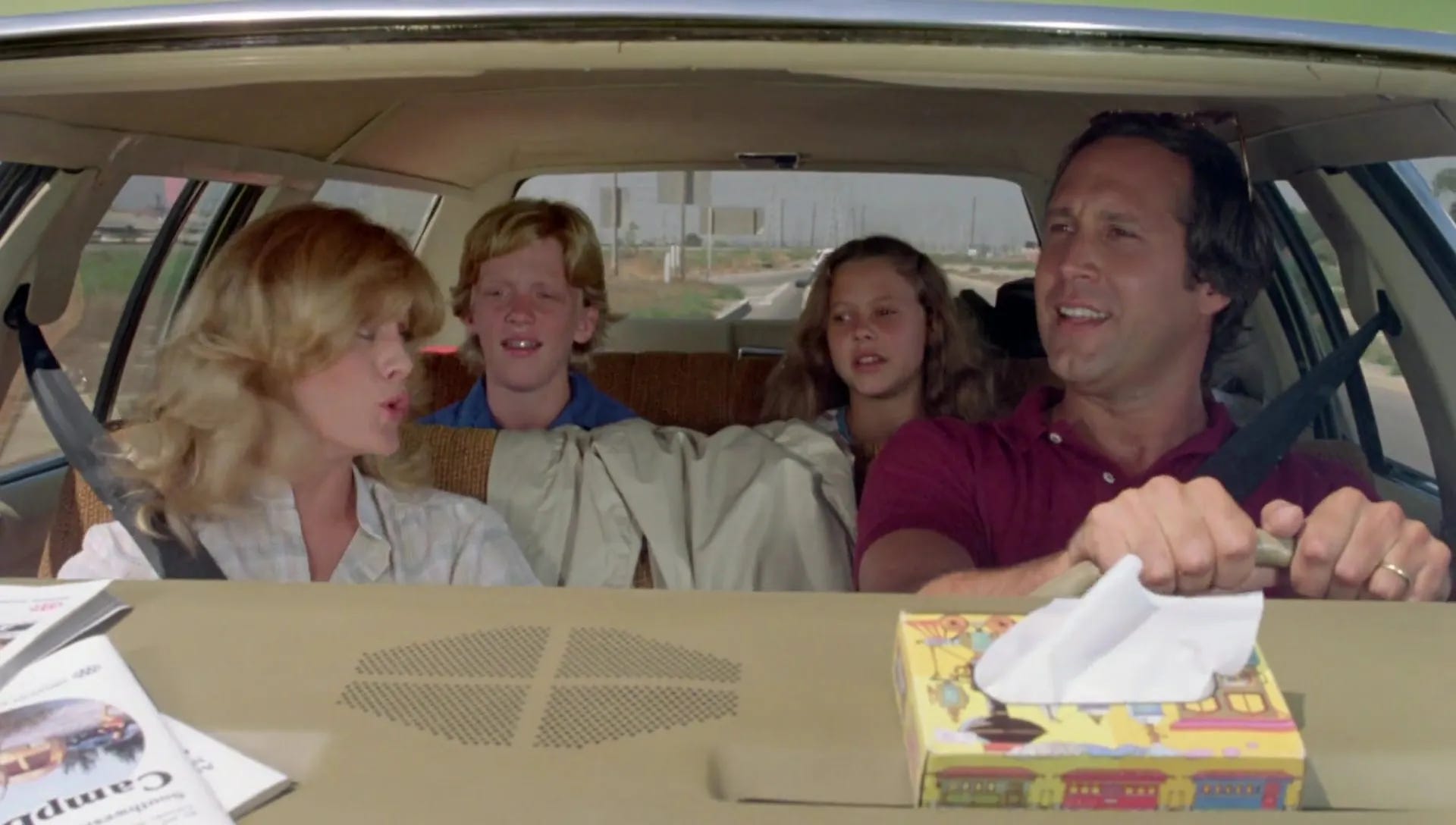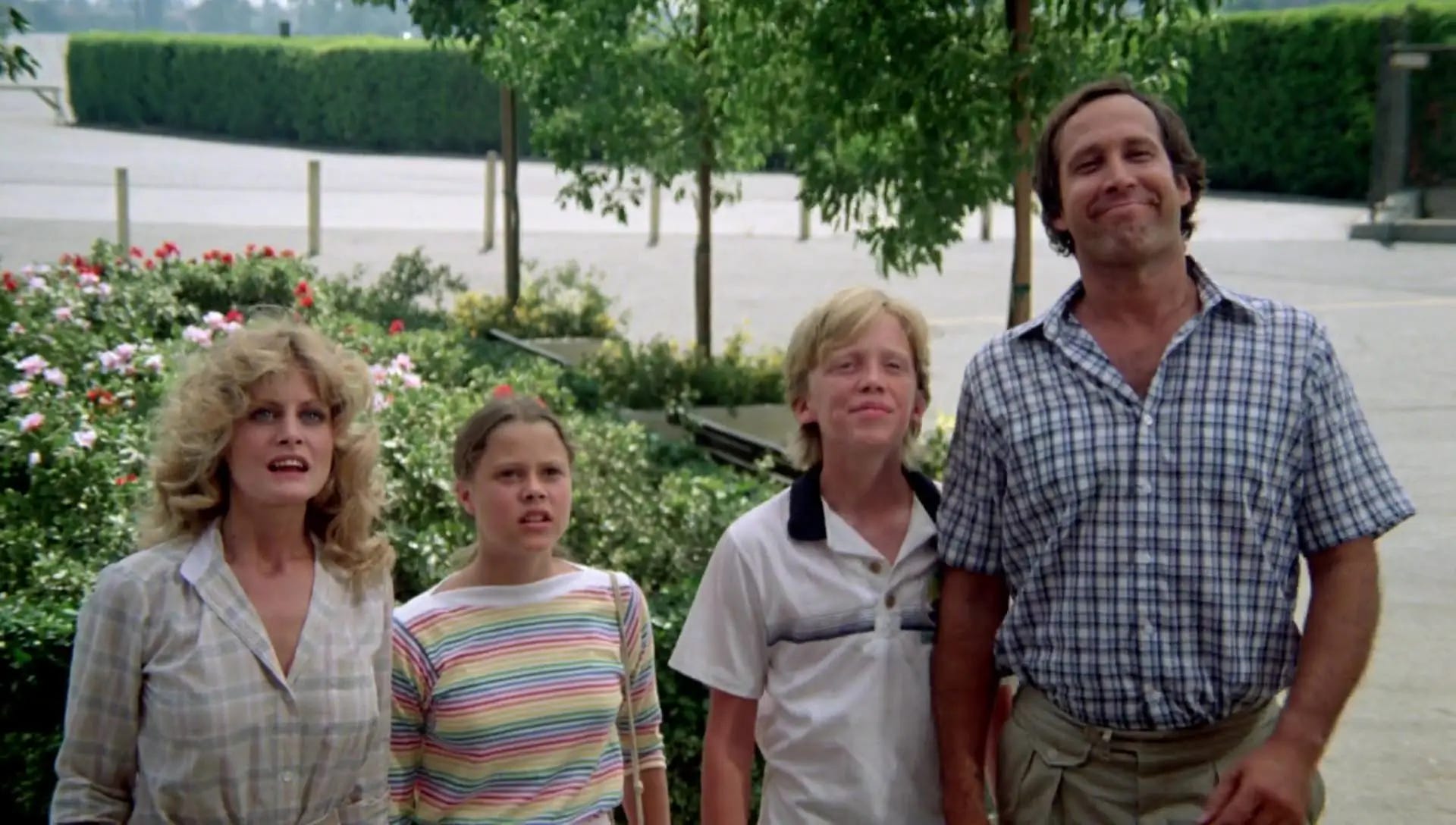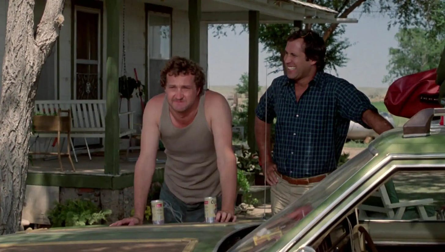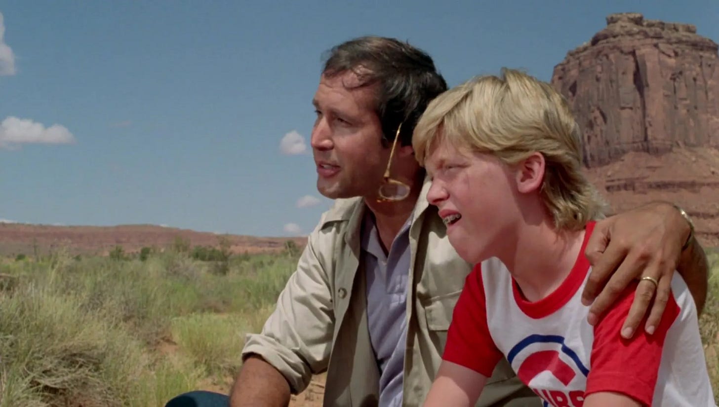 Chase had already turned Simmons down once, opting to make his leading man debut opposite Goldie Hawn in Foul Play (1978) rather than join the ensemble of Animal House, the role of Otter going to Tim Matheson. Receiving assurances from Ramis that they could address his concerns by rewriting the script together, Chase agreed to star in National Lampoon’s Vacation. Ramis conceded that rather than the boy–now named Rusty Griswold–he was more interested in Clark, a man who had two weeks a year to be the perfect husband and father. With Chase in the room offering input, Ramis touched up the script to make cheerful optimism–not hair-triggered anger–Clark’s defining trait. Another change was the vacation route. Hughes had taken the Griswolds from Kansas down into Oklahoma, the Texas Panhandle and New Mexico. Ramis jumped from Cousin Eddie’s farm to the state of Arizona, where the Grand Canyon and Monument Valley offered him visually compelling topography. The road trip climaxed at “Walley World,” a Los Angeles amusement park. In Hughes' script, after the Griswolds find the park closed for repairs, Clark crashes the Family Truckster into the estate of Roy Walley, forcing the CEO and his minions to sing and dance for them as compensation. The police take the Griswolds into custody, but when Walley hears what the family went through to visit his park, he drops the charges. Boarding a flight home with hats that suggest they got to Walley World after all, the Griswolds’ bad luck continues when the pilot announces a change in course.
