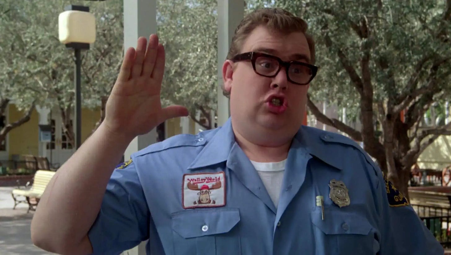 The Walley World parking lot and entrance were filmed at Santa Anita Racetrack in Southern California, the park’s massive signage faked with matte paintings by Hoyt Yeatman’s group at Dream Quest Images. Ramis would recall that when National Lampoon’s Vacation was put before a test audience, the raucous laughter of the first 80 minutes went silent and never returned once the Griswolds invaded the home of Roy Walley. Though the filmmakers found it amusing, they hadn’t anticipated viewers investing in the road trip so much they wanted to see the Griswolds make it to Walley World. The director turned to John Hughes to bail them out. In Hughes’ new ending, Clark takes a security officer hostage at BB gunpoint and forces him to take his family on the rides before Roy Walley and the police arrive. Bill Murray was offered the part of the security officer and declined, but Warner Bros. was so buoyed by the response to the rest of the picture that they paid John Candy $1 million to cameo. Shot at Six Flags Magic Mountain in Valencia, California six months after production had wrapped, Anthony Michael Hall calculated he’d grown at least four inches when he returned to film the new ending.