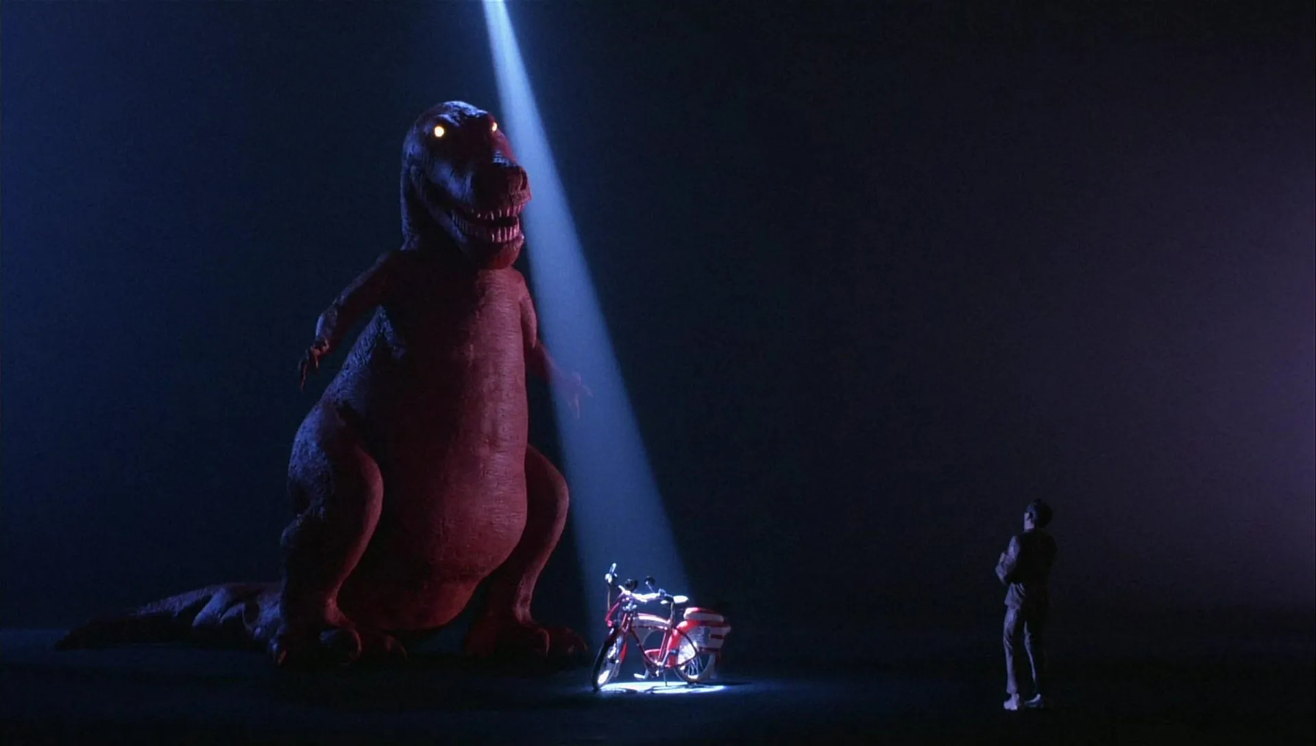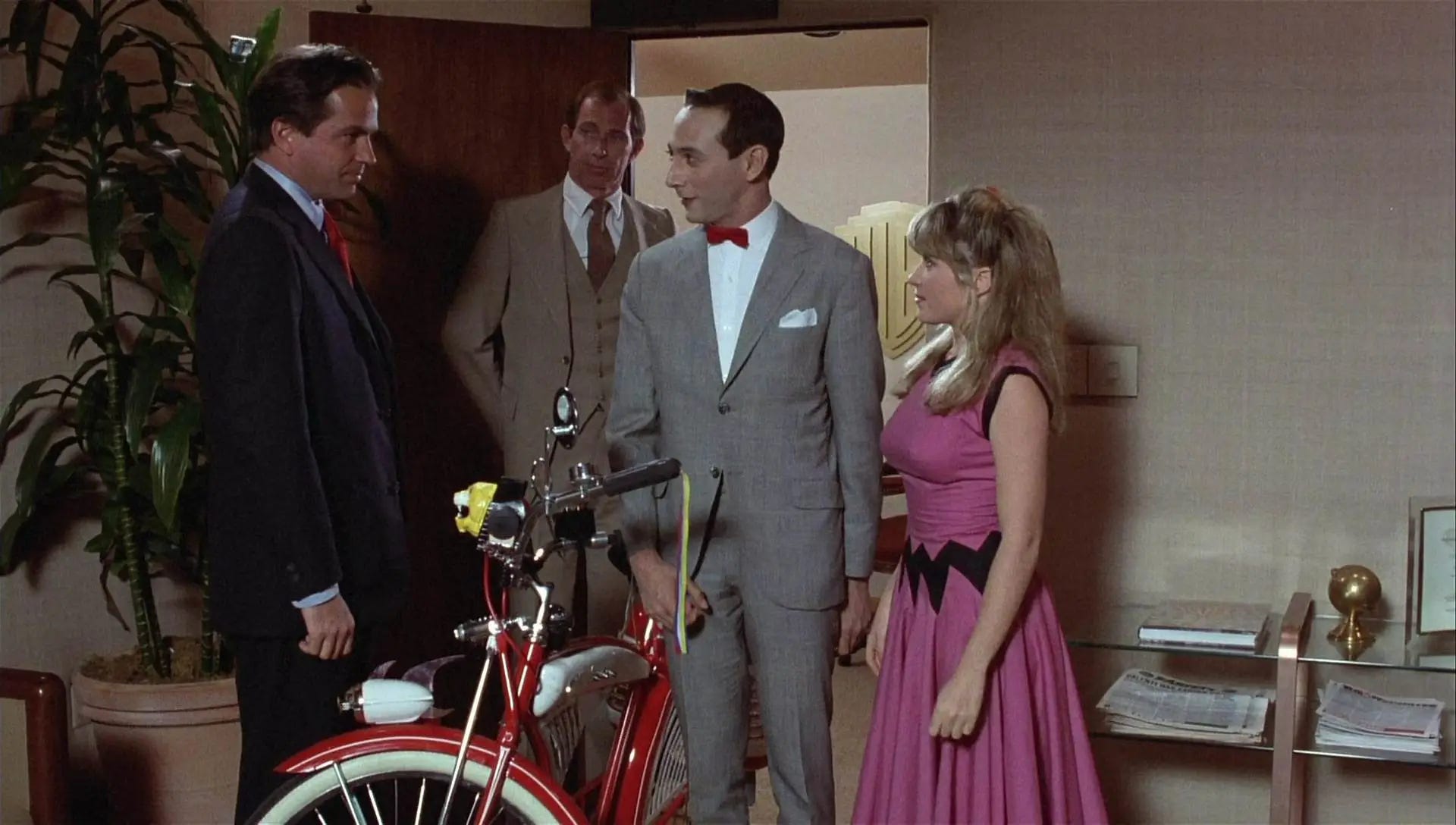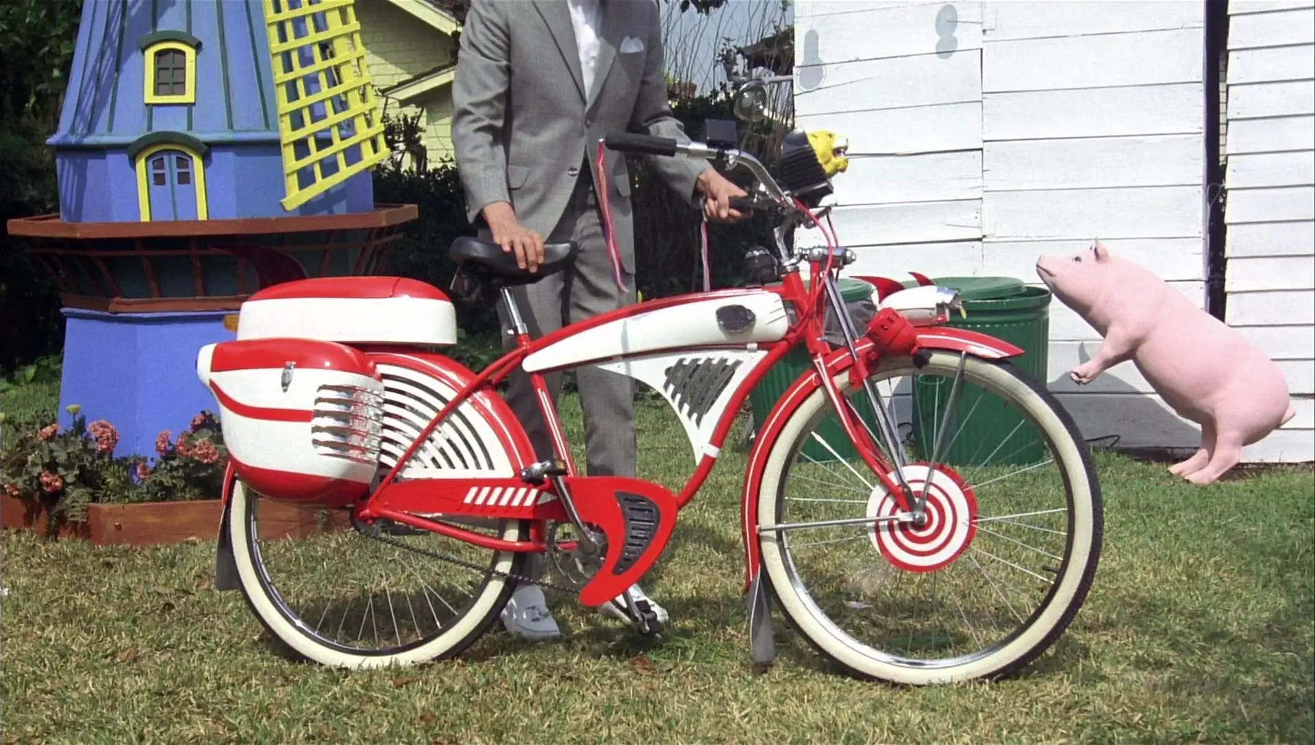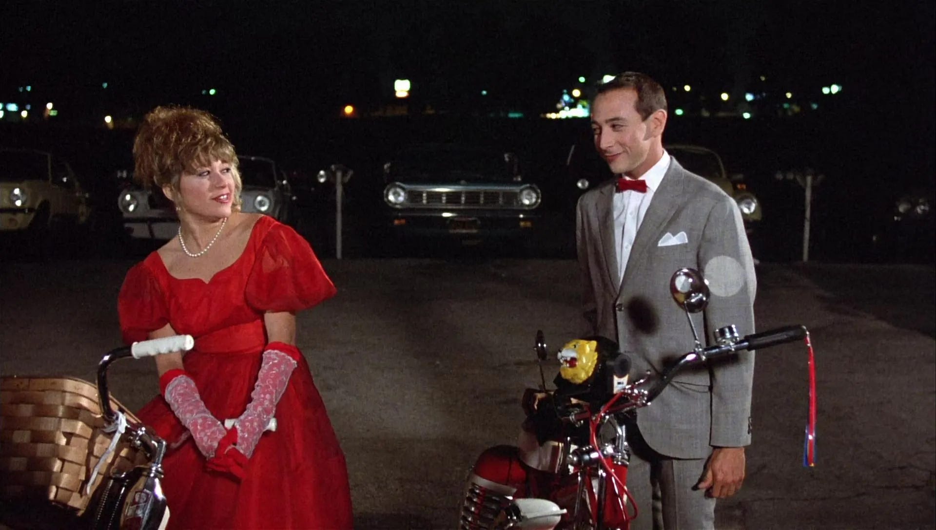 Not considering it important, the studio allowed Reubens and Burton their pick of film composers. They courted Danny Elfman, whose work Reubens was familiar with from Forbidden Zone (1982), a bizarre musical intended to showcase the L.A. musical theater troupe The Mystical Knights of the Oingo Boingo, who Elfman was musical director for. Burton knew Elfman simply as lead vocalist and guitarist for the New Wave band Oingo Boingo. Reubens (32) had never starred in a feature film, Burton (26) had never directed one and Elfman (31) had never scored one with an orchestra. To play Pee-wee’s bicycle, the Schwinn DX was chosen, a line the company introduced in 1939. To build the necessary bicycles for the film, Pedal Pushers Bikes in Newport Beach, California were contracted. Prop master Steven Levine didn’t have room in his budget to build the necessary fourteen vintage 1946-1953 DXs, so Pedal Pushers reached out to collectors to make calls to bike shops and warehouses for new old Schwinn parts. Enough parts were sourced to build six DXs, with six or seven saddlebags that could be used as replacements to keep the bikes they had rolling like new.