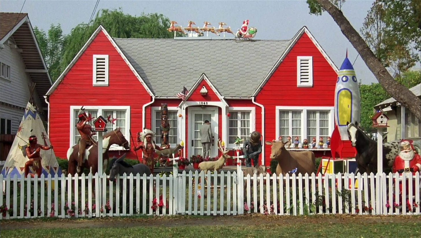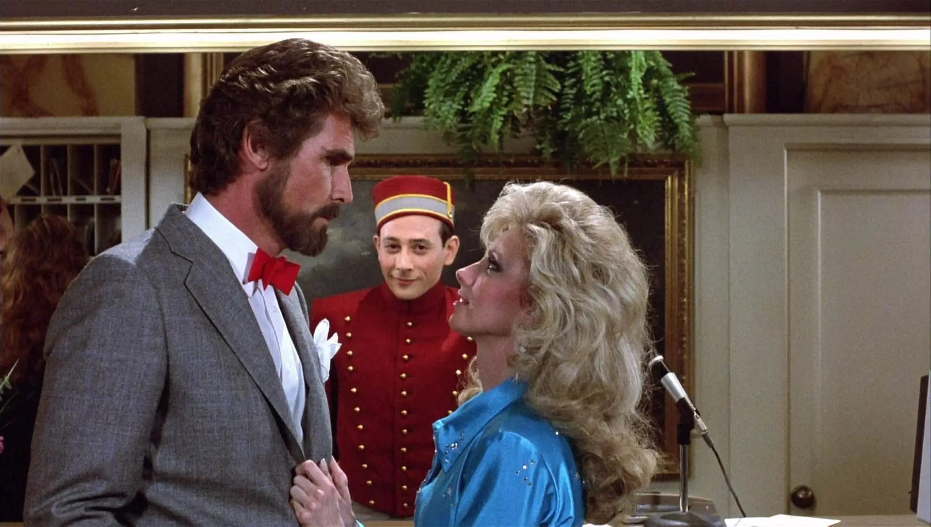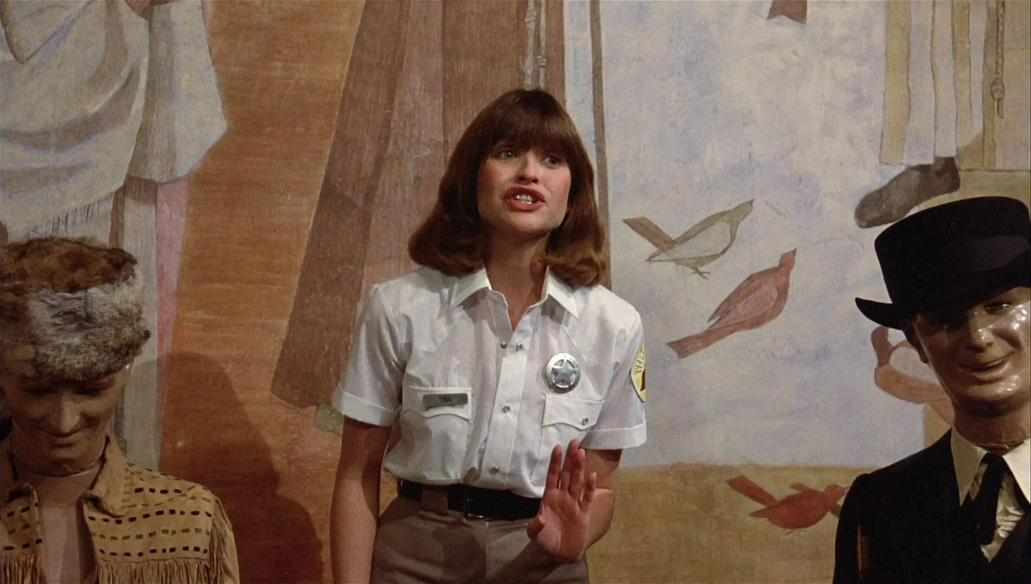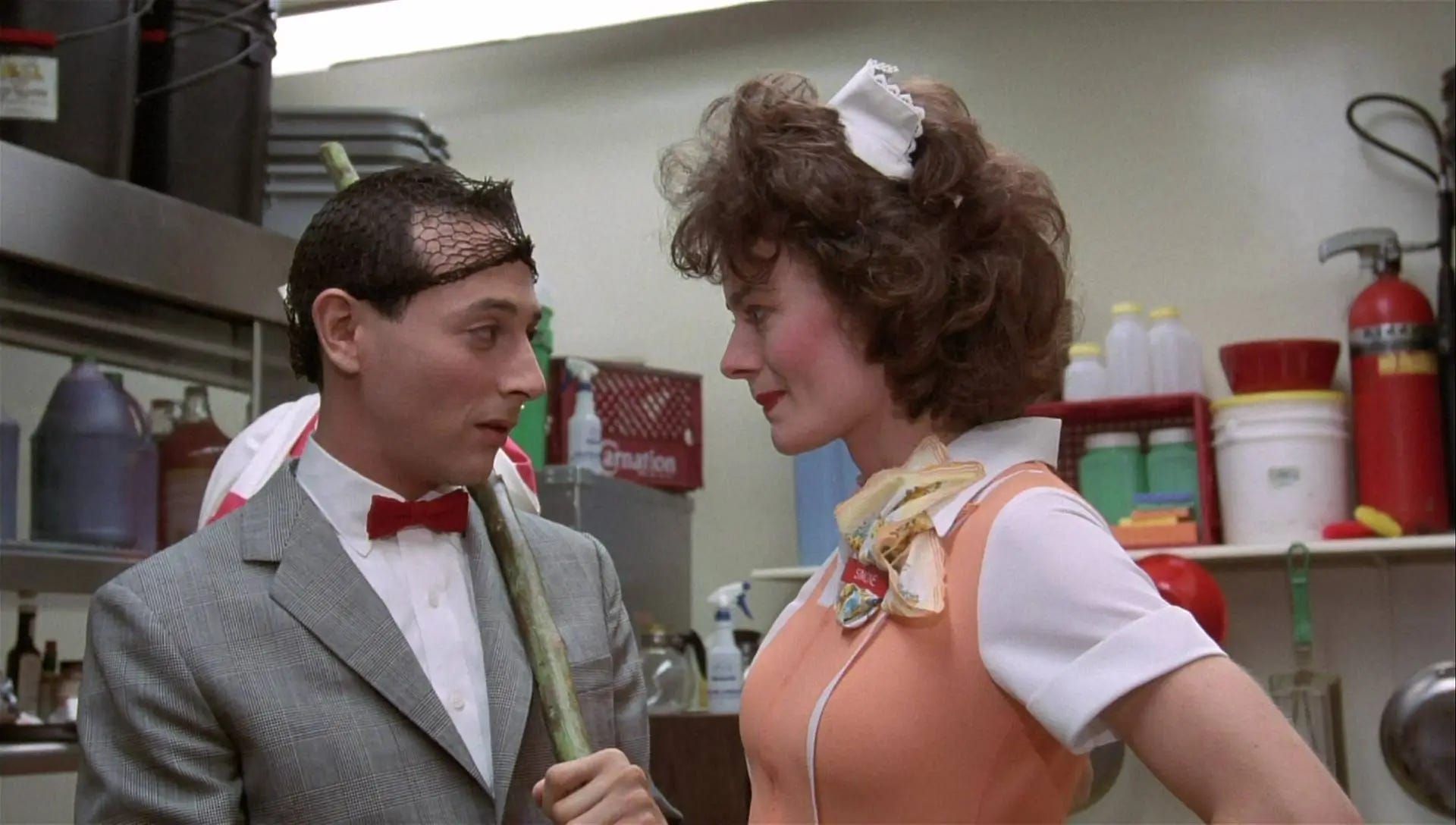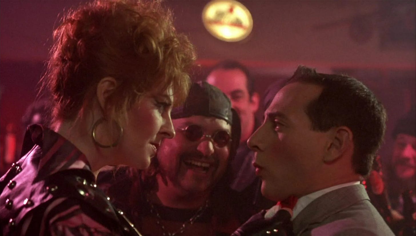 Reubens & Phil Hartman & Michael Varhol seed the fresh ground of their script with wonderfully irreverent characters who ricochet Pee-wee on the next leg of his journey. There’s the phony fortune teller who concocts the location of Pee-wee’s bicycle by glancing at a sign that reads “Al & Moe’s” and “basement,” a fed-up actress (Lynne Marie Stewart) whose spat with a child co-star provides a distraction for Pee-wee to steal back his bike, and in the biggest laugh, a gum-chewing Alamo tour guide (Jan Hooks) whose good cheer is even too much for Pee-wee. The gift the Groundlings Theatre gave to Pee-wee Big’s Adventure is how quickly, expertly and economically actors are able to create memorable characters. No one on this show gets caught standing around with nothing to do. The material and cast are put on a rocket by Tim Burton, working with less money and time on his feature film debut than he ever would again as a filmmaker, using that to his advantage. Rather than tell stories, the director of Beetlejuice (1988), Batman (1989), Edward Scissorhands (1990), Batman Returns (1992), Ed Wood (1994) and Mars Attacks! (1996) would specialize in creating characters, making dark and visually lavish shorts separated by filler within a larger film. Pee-wee’s Big Adventure is Burton’s best picture because there is no filler. Every five minutes is a different movie: a sports film, a cartoon, a stop-motion animation fantasy, a movie-within-a-movie, a romance, a musical. Like Reubens and Burton, Danny Elfman delivered in tremendous excess to his salary, his simple musical score bringing color and circus-like amusement to a film that couldn’t afford lighting or camera tricks, set design or even an opening credits sequence to suggest handmade spectacle, which this is.