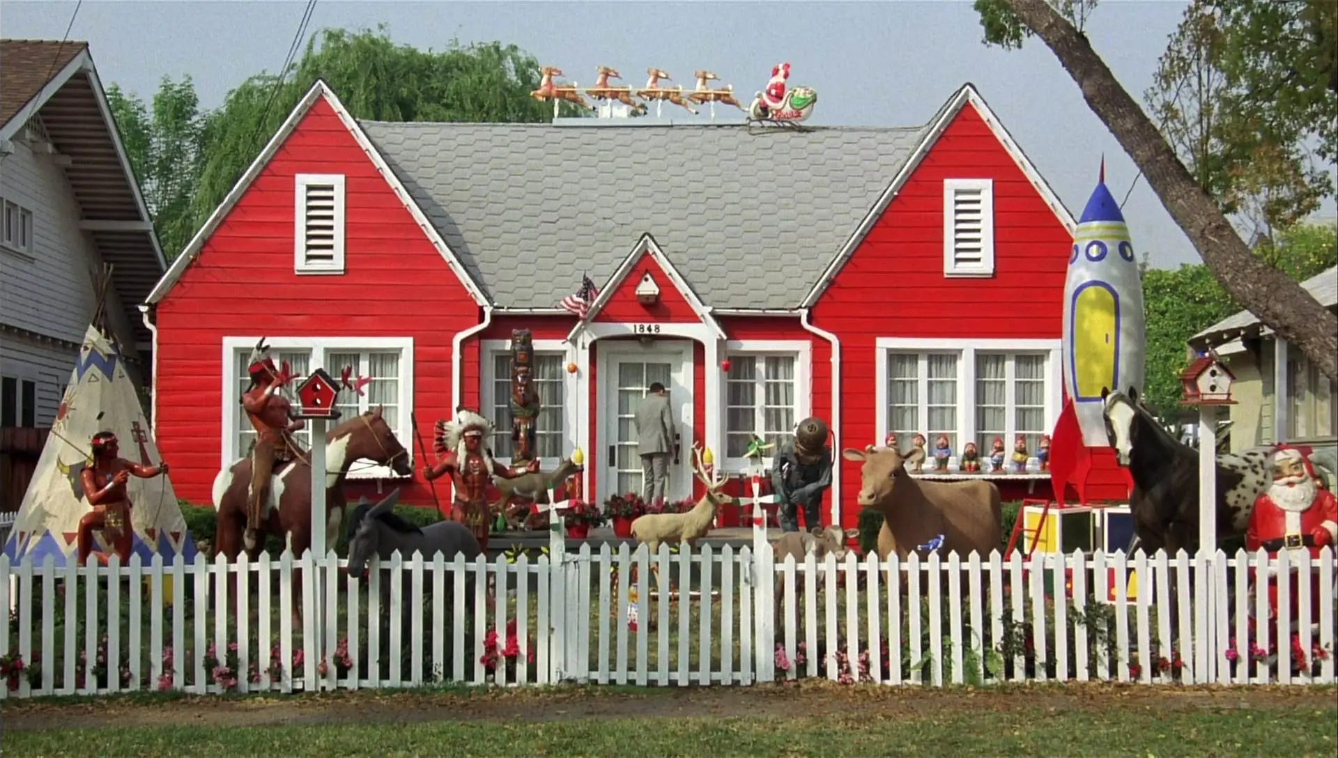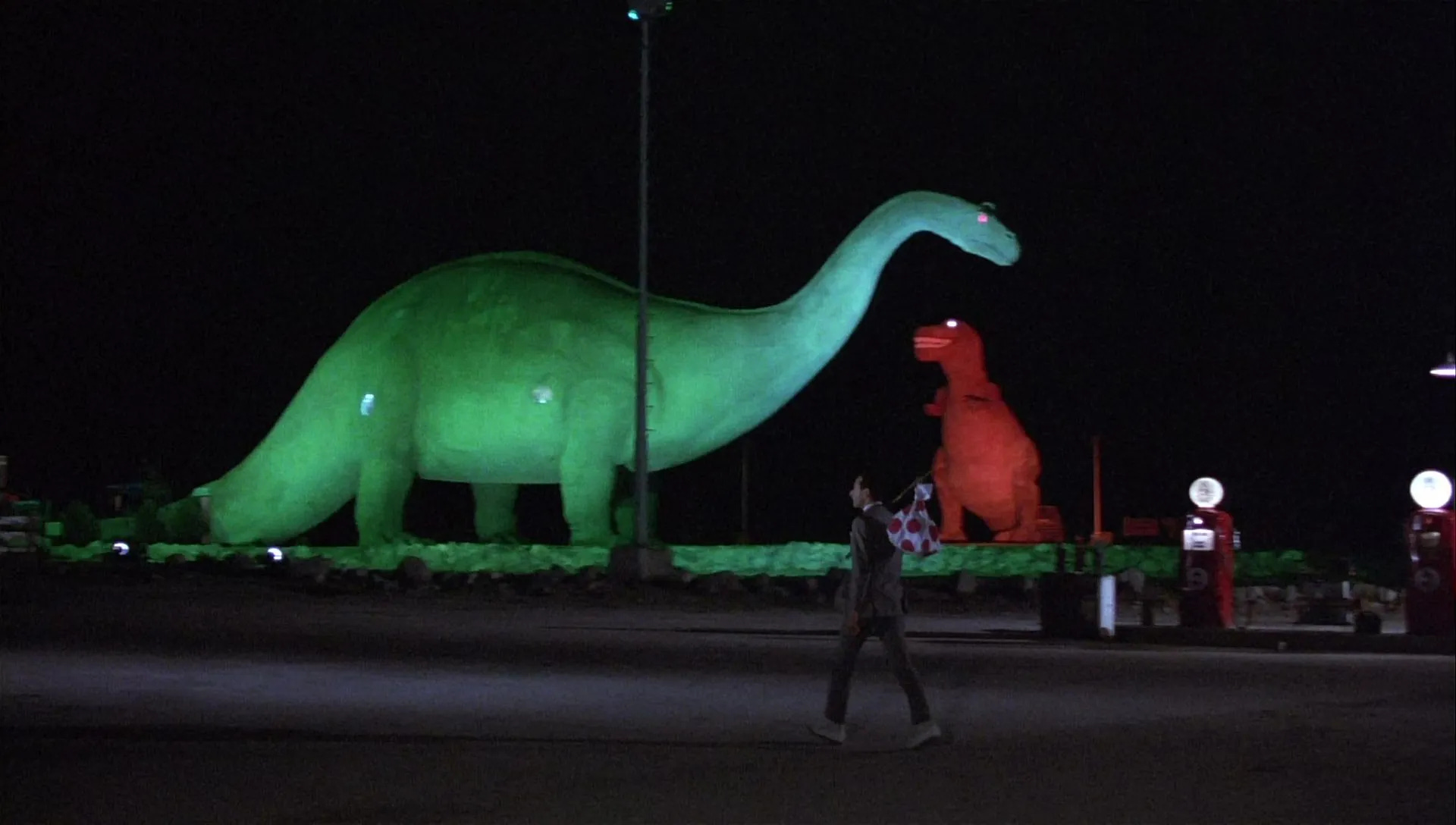 Pee-wee’s Big Adventure commenced filming in January 1985 in Los Angeles. The exteriors for Pee-wee’s house were grabbed in South Pasadena, and those for Francis’ house at the Ahmanson Mansion, a Tudor-style estate in Hancock Park. The scene of the crime was filmed at the outdoor Santa Monica Mall, before it was remodeled as Third Street Promenade and when it still had a F.W. Woolworth. The truck stop was a real location: the Wheel Inn Restaurant in Cabazon, the diner and its two dinosaur statues standing until 2016. The Alamo interiors were spoofed at Mission San Fernando Rey de España in Mission Hills. The Warner Bros. backlot played itself. The finale was shot at the Studio Drive-In in Culver City, closed in 1993 and bulldozed five years later. Interiors were filmed on stages at Warner Bros at the same time The Goonies (1985) was in production on the massive Stage 16. A closed set, Pee-wee Herman’s popularity among the adolescent cast gave him a pass to visit (while Paul Reubens would use his own name for his writing credit, Pee-wee Herman was credited as playing “Himself”).
