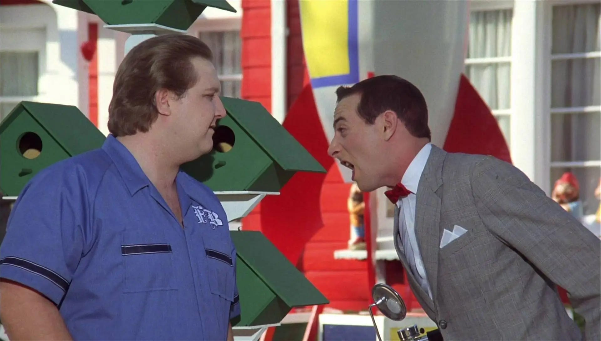 Pee-wee Herman might never have caught the public’s imagination if introduced on television in 1970 (the era of The Smothers Brothers Comedy Hour and The Sonny & Cher Comedy Hour) or 1990 (the peak of In Living Color and Def Comedy Jam). In 1980, he was right on time. Instead of commentary on whatever had made the news in those politicized times, audiences needed a breather, and Paul Reubens reached back in time to Saturday morning TV of the 1950s, and to an extent, public television like Sesame Street or Mr. Rogers Neighborhood populated by budget puppets, kitschy cartoons and fantasy worlds where everyone was welcome and no one was mocked. That was the creative direction of The Pee-wee Herman Show of stage, but what makes Pee-wee’s Big Adventure of film exciting is how it abandons nearly all of what had made Pee-wee a cult icon, forcing a man who–without explanation–exists in a bubble of Saturday morning TV in his mind to venture forth and share his outlook with folks who don’t really live in Puppetland: an escaped felon (convicted of losing his cool and cutting the manufacturer tag off a mattress), a rangy waitress who dreams of visiting France, hobos, bikers and Hollywood types. Pee-wee isn’t saddled with problems, and by finding a way to bring joy and excitement to those he encounters, isn’t treated as if he has a problem.