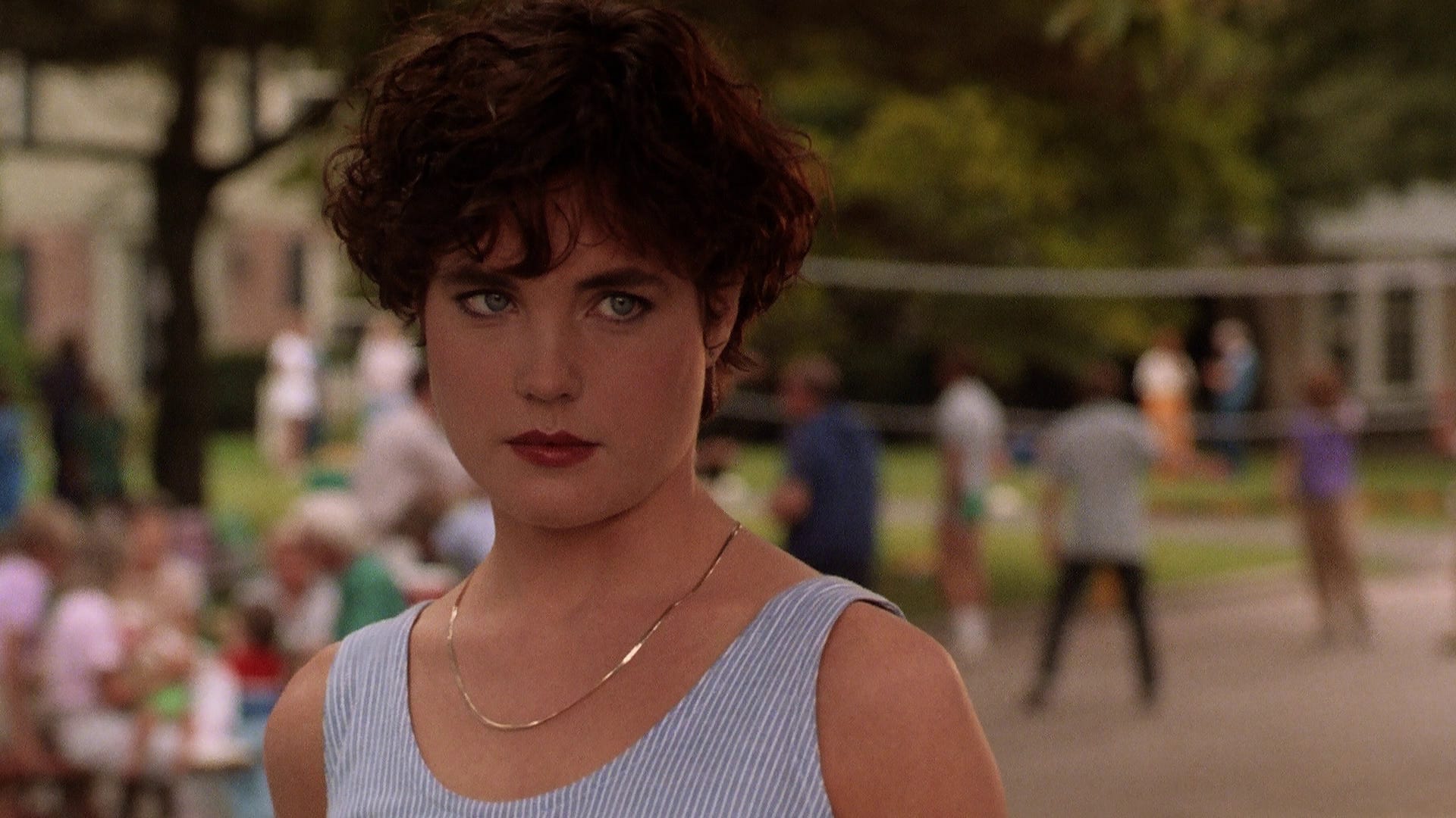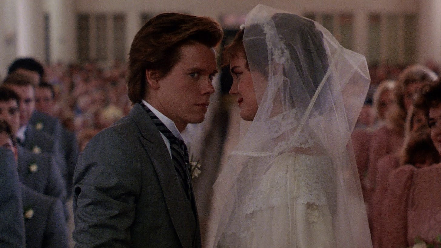 Rather than an idealistic couple facing a hectic world of in-laws, career, home ownership, neighbors, and family planning, much of She’s Having a Baby reduces Bacon’s character to staring off into the middle distance in deep anxiety. This is an honest reaction, but makes for a boring movie. In an effort to give these routine domestic scenes flavor, Hughes indulges in his main character’s fantasy life, from a minister who issues specific wedding vows to a dream blonde he’s imagined. For someone who’s supposedly writing a novel–another thing characters tell us, but we never see much evidence of ourselves–Bacon’s inner voice and dream life are mundane, not at all like Hughes’ writing up to this point. Then in its closing credits sequence, actors or musicians who Hughes had worked with, or who were working on the Paramount lot, toss out baby names. Filmed over several months, the sequence doesn’t work because almost everyone throws out random names or words that have no context. Ad-libbing why the baby should or shouldn’t be named after them might’ve inspired some good bits, as well as put names to each cameo, all of which go uncredited. Like so much of the movie, longer moments that should’ve been trimmed instead go on and on, while fleeting ones that needed more time to incubate fly by.