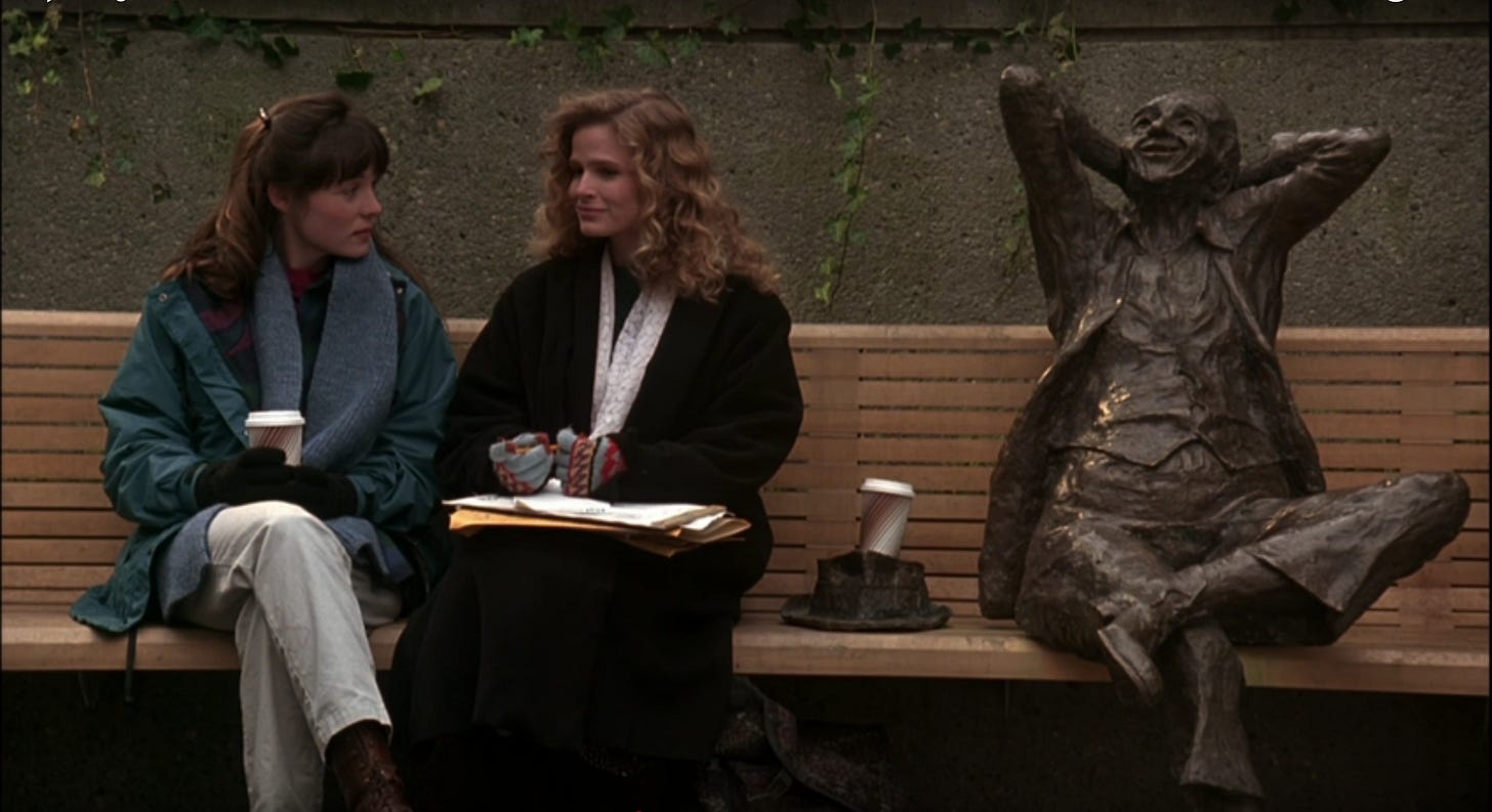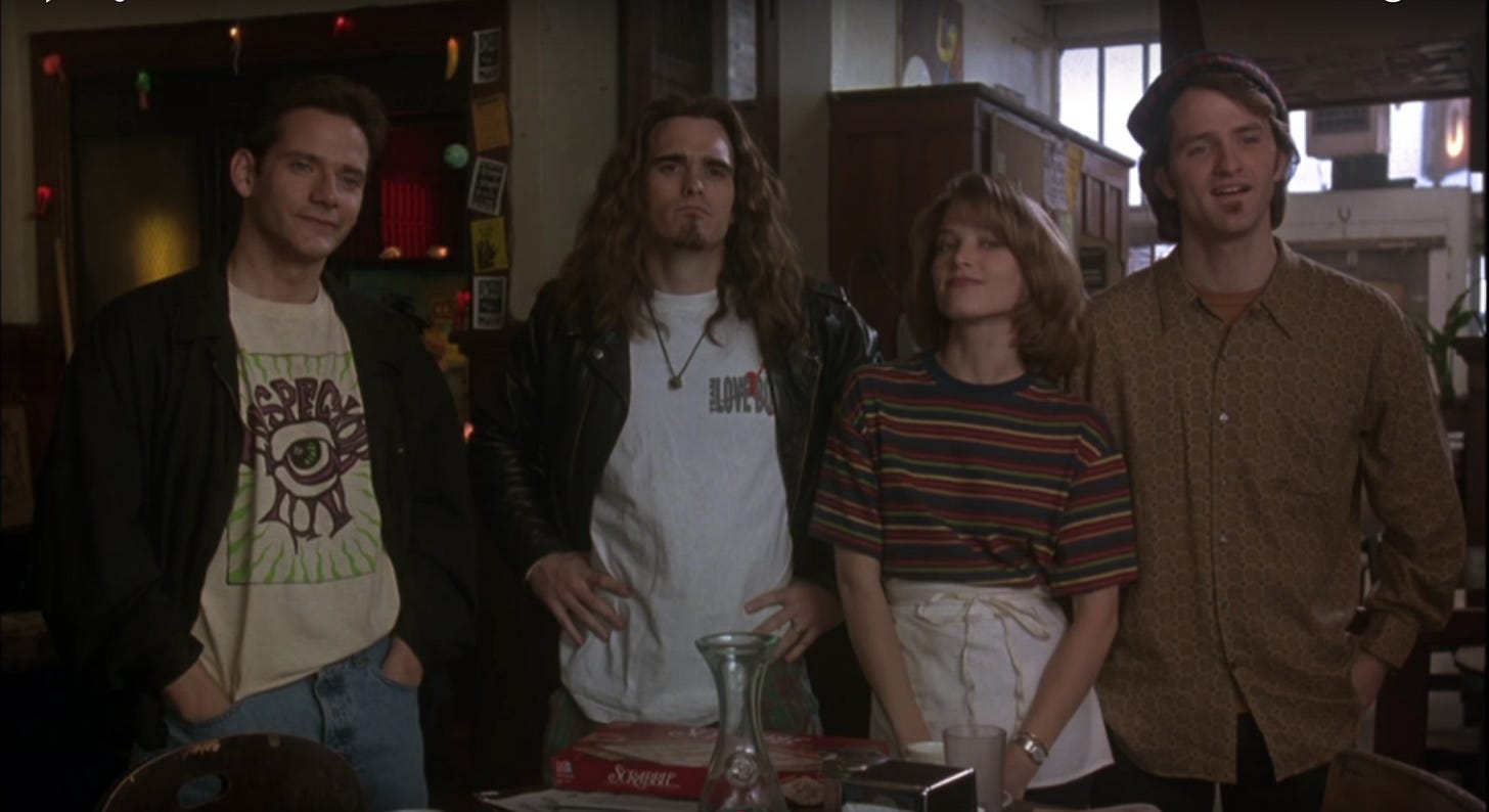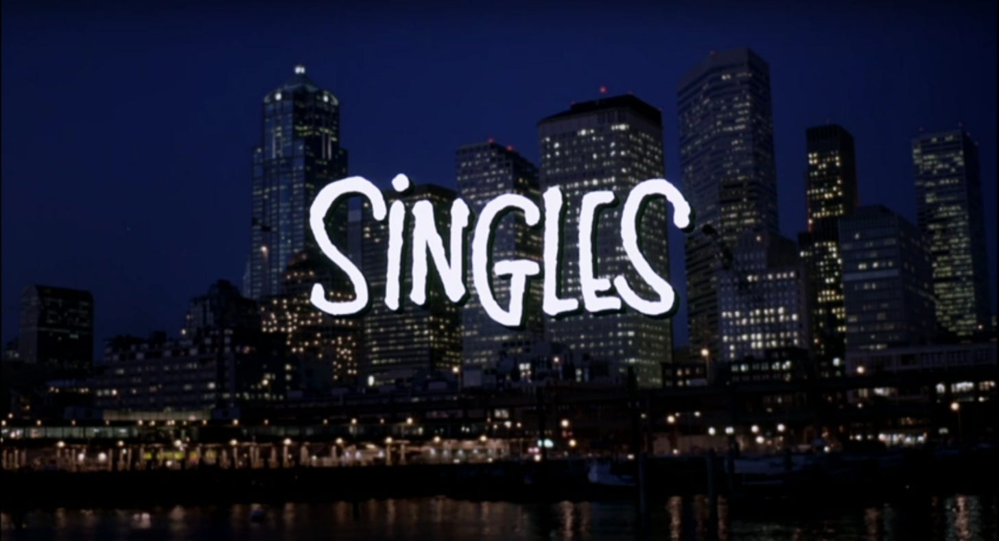 SINGLES (1992) is a love letter to the city of Seattle, to its music scene or what would become known around the world the year of the film’s release as “grunge rock,” and the steps men and women stumble over in their journey as new adults. In descending order, that’s what the film is most interested in. Written and directed by Cameron Crowe, it does have authorial vision, which the new adulthood comedy he wrote but did not direct–The Wild Life (1984)--lacks, but stagnates a bit and isn’t blessed with the fortune of his directorial debut, Say Anything … (1989).