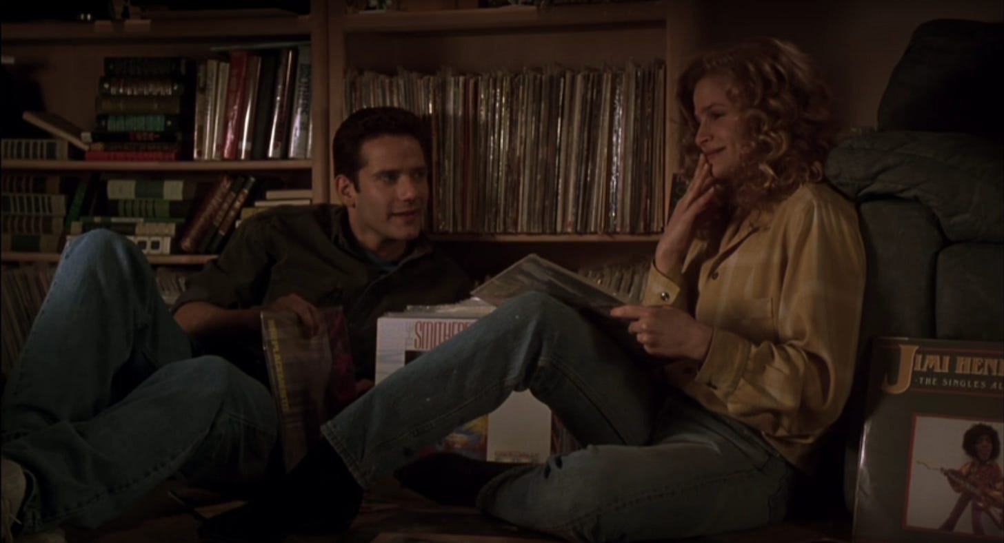 The problem with Singles is that it has one earbud in a crisp Billy Wilder/ I.A.L. Diamond romantic comedy from the late fifties/ early sixties like The Apartment (1961) and another earbud in grunge rock, a big chunk of which was sort of like heavy metal from bands who journaled, with growly vocals and distorted guitar. Generally speaking, this is music better suited to a drama about a disillusioned male loner than a comedy about relationships. It’s easy to imagine Nicolas Cage’s character rocking out to Alice In Chains on his way to the liquor store in Leaving Las Vegas (1995), hardly a laughing matter. Crowe tries to lighten the soundtrack by hiring Paul Westerberg to compose the music, lending it something of a New Wave/ indie pop vibe, but in order for the grunge rock to be turned down, the characters would’ve needed to have been dialed up with more agency than they’re given. None of them possess a quarter of the desire of Lloyd Dobler (John Cusack) in Say Anything … who’d tell these slightly older characters that they were wasting their time.