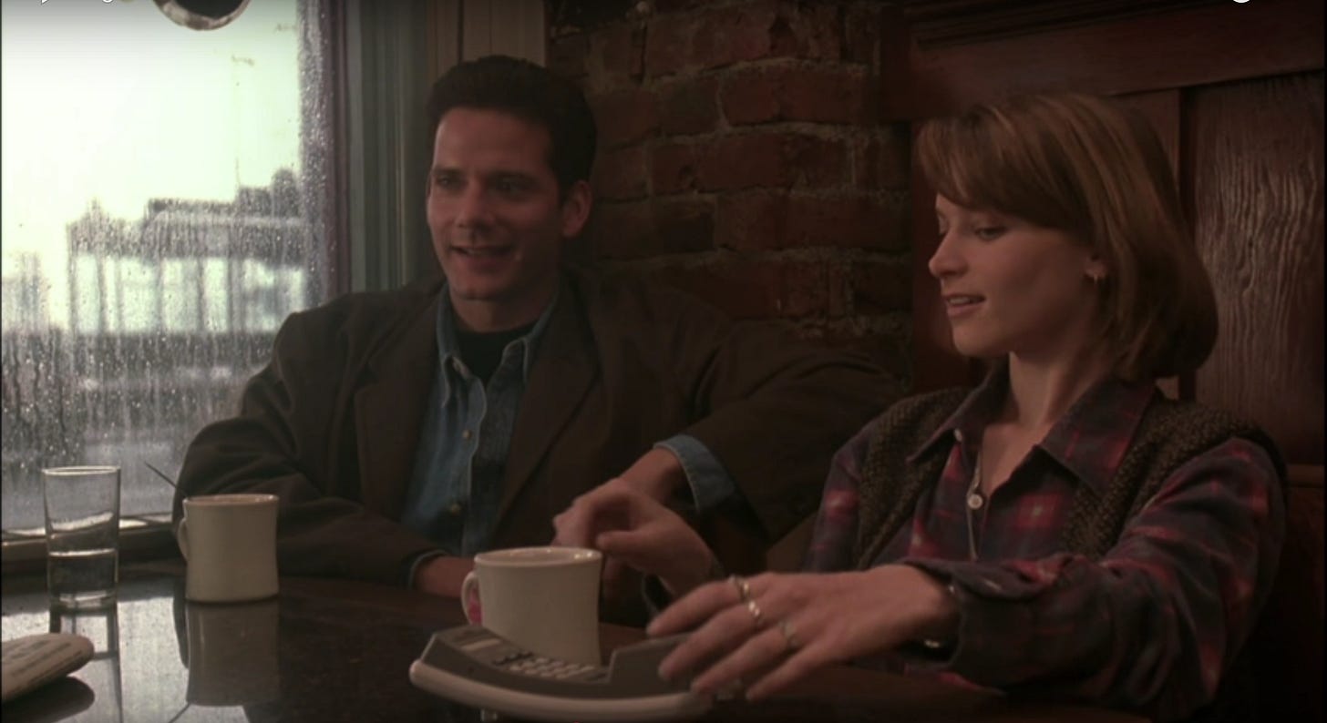 Singles held its first test screening in Glendale, California on 11/6/1991 (dates were recorded in a production diary Crowe logged, which Rolling Stone published shortly after the film’s release). Reaction from the mostly teenage recruited crowd was, according to Crowe, average. A trusted friend who Crowe screened his film for offered that the movie grabbed him and held on, but lost some focus when Steve and Linda seemed to break up without Crowe providing a clear reason why. The writer/ director convinced Warner Bros. to allow him to return to Seattle for reshoots with Campbell Scott, in which Steve crawls into a phone booth and dials Linda’s answering machine, asking for another chance. The second test screening, held in Marina Del Rey on 1/23/1992 with the new material, showed improvement, but by now, Warner Bros. was beginning to lose whatever enthusiasm they might have had for Singles. Crowe had observed some audience restlessness between laughs, and contended that his film was for college audiences more so than the teenagers being pulled out of malls. Not sure what they had, the studio bumped Singles from its planned February 1992 release to an undetermined date.