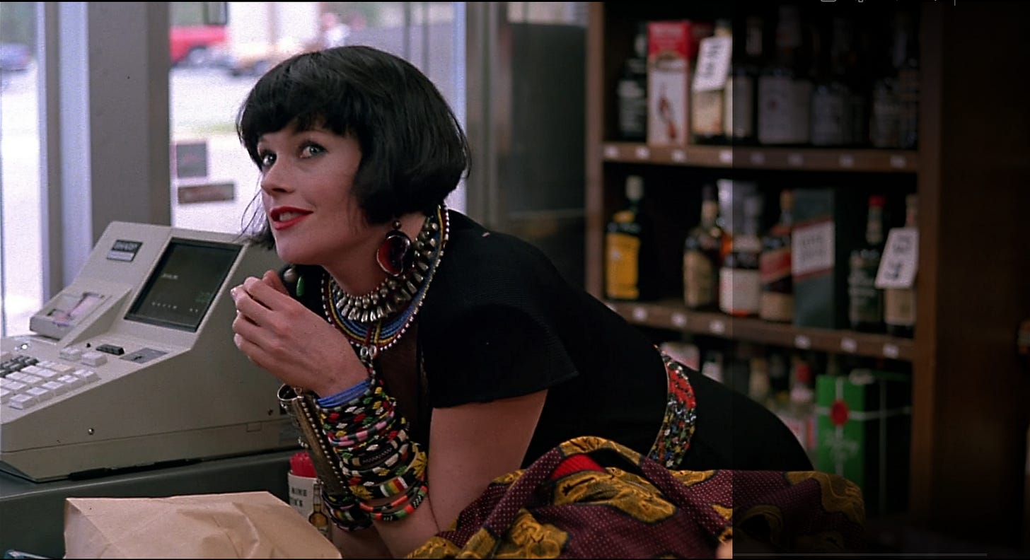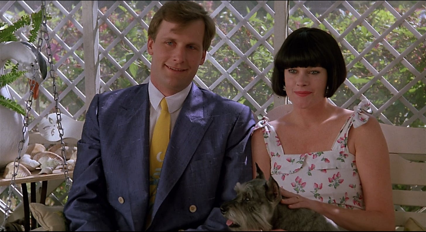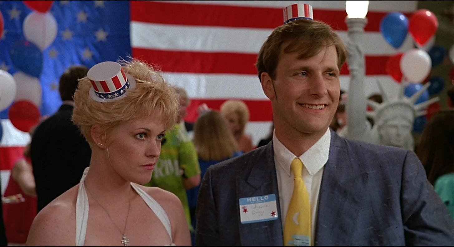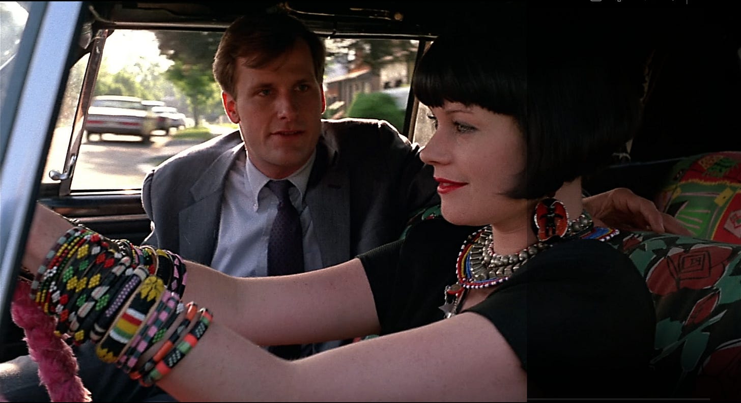 Watching Something Wild is like watching the build for a house of cards, a screenwriter and director going perilously higher under a paper thin foundation. E. Max Frye and Jonathan Demme test how much they can stack without the entire structure imploding, stopping one card short. Demme’s next picture for Orion, Married to the Mob (1988), would pile too many cards on top of a weak base and crumble. The reason Something Wild works is the couple at its core, Melanie Griffith and Jeff Daniels playing a hip, KCRW variation on the characters in a classic film noir. Rather than shadow and glamour, the picture is loaded with color and kitsch. Demme’s skills as a music supervisor are on point, painting Lulu with funky world music (“Wozani Mahipi” by The Mahotella Queens) and reggae (“Ooh! Aah!” by The Fabulous Five). Griffith’s early scenes are nutty and explosively funny. Donned in a Louise Brooks wig and swigging whiskey with wrists covered in bracelets, Griffith is not only sexy–squeaking like a girlish pinup whose image jumped off the siding of a WWII bomber–but is driven by pure id, sent by the gods to breathe impulsivity into the life of an investment banker, even if she has to open his lips with hers. As femme fatales go, Griffith plays one of the most alluring, her look by production/ costume designer Norma Moriceau (who dressed the Mad Max and “Crocodile” Dundee pictures). Jeff Daniels’ setting as a film actor is “wholesomeness”, and this is another picture he bounds through like a golden retriever. Rather than bring frenetic terrier energy as Kevin Kline might’ve, Daniels hangs his head out the window game to go anywhere Lulu wants him to, giving us permission.