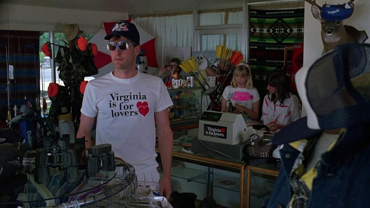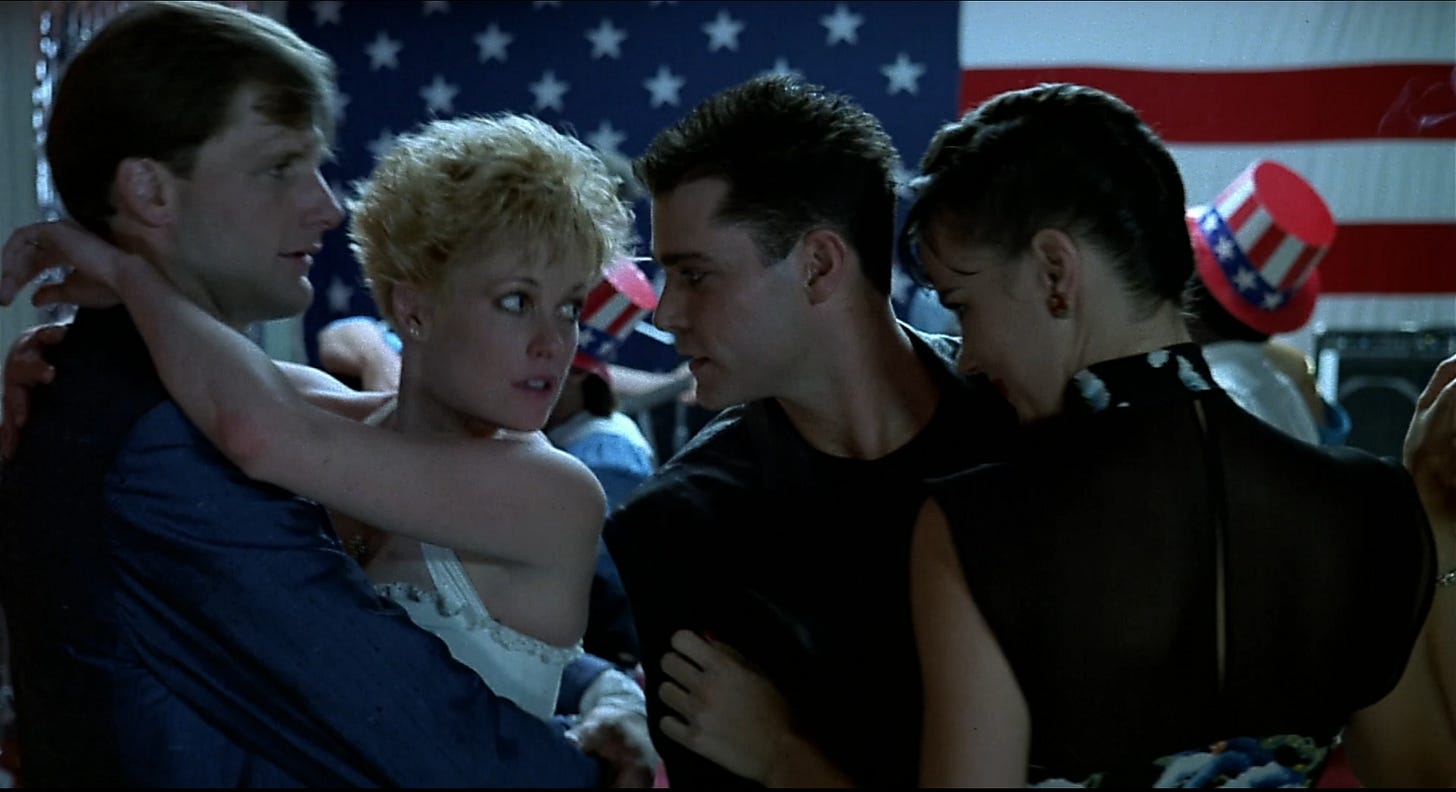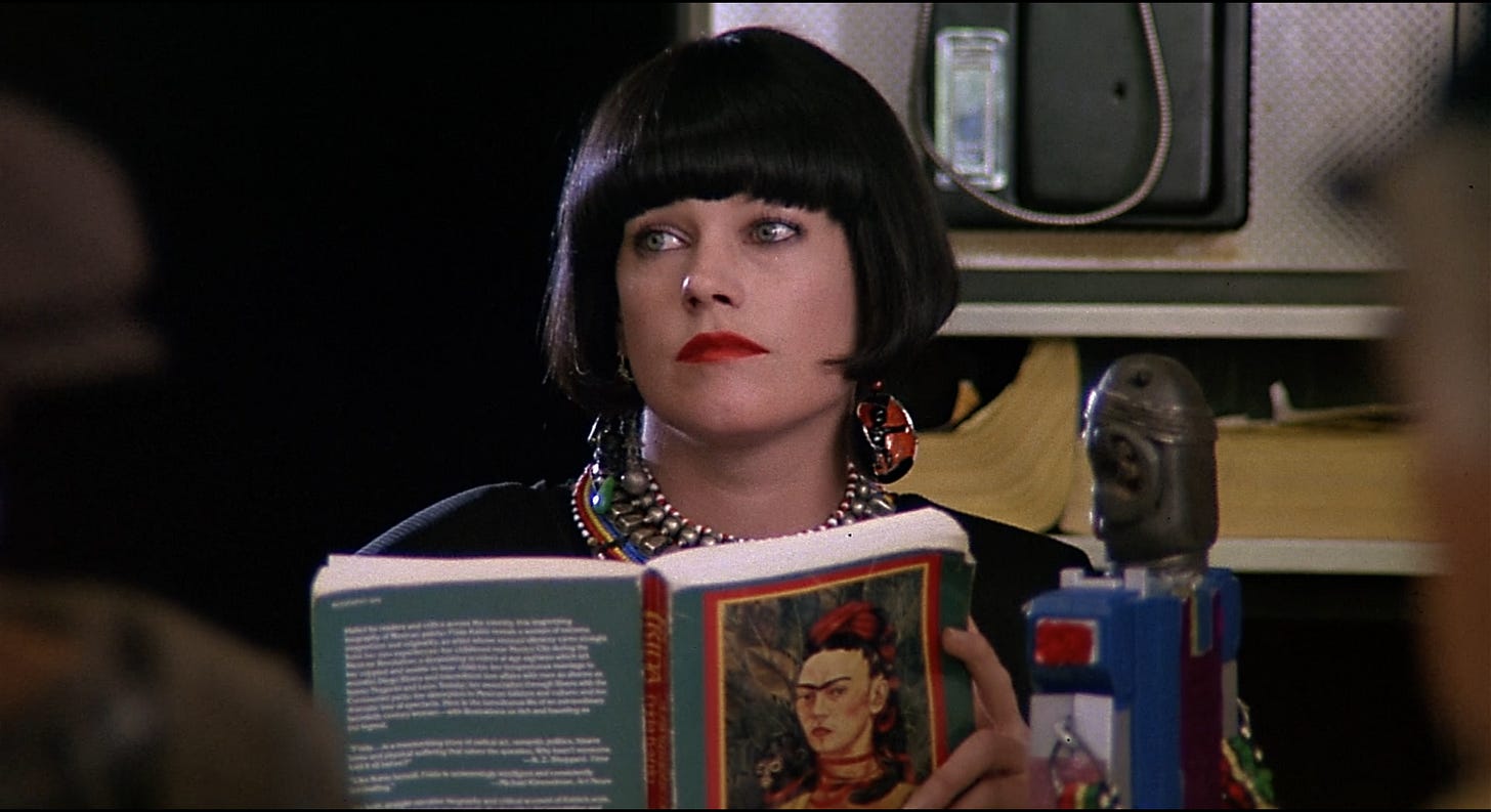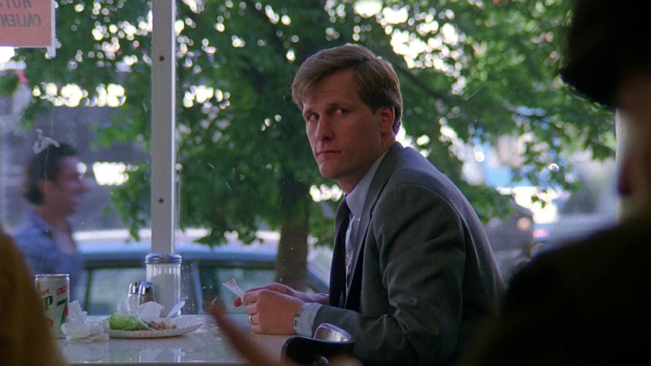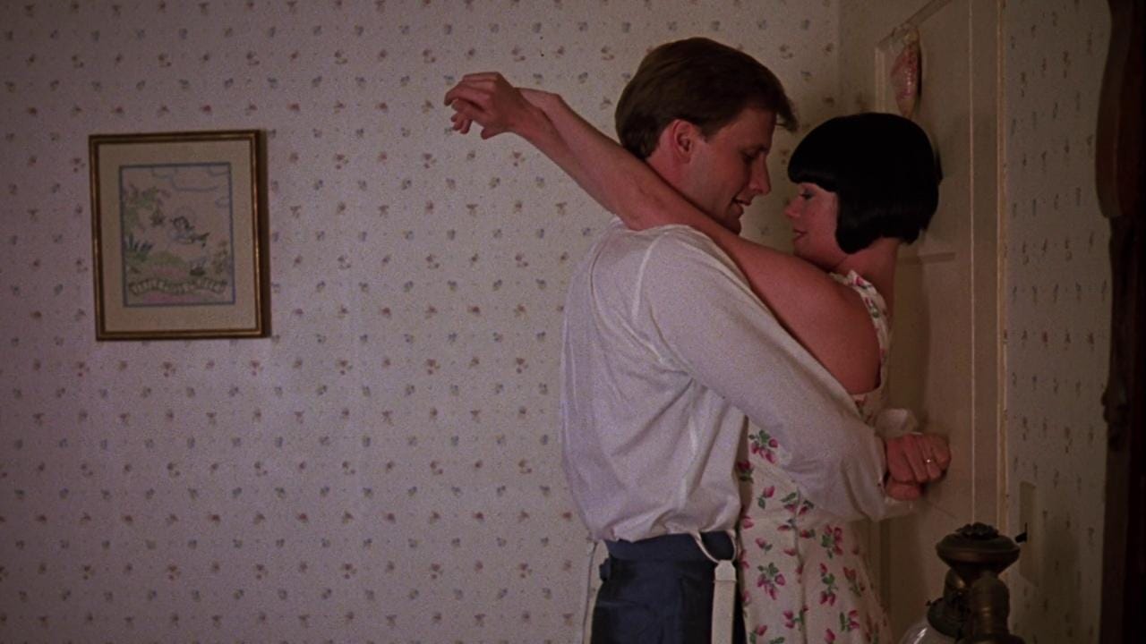 Watching Something Wild is like watching the build for a house of cards, a screenwriter and director going perilously higher under a paper thin foundation. E. Max Frye and Jonathan Demme test how much they can stack without the entire structure imploding, stopping one card short. Demme’s next picture for Orion, Married to the Mob (1988), would pile too many cards on top of a weak base and crumble. The reason Something Wild works is the couple at its core, Melanie Griffith and Jeff Daniels playing a hip, KCRW variation on the characters in a classic film noir. Rather than shadow and glamour, the picture is loaded with color and kitsch. Demme’s skills as a music supervisor are on point, painting Lulu with funky world music (“Wozani Mahipi” by The Mahotella Queens) and reggae (“Ooh! Aah!” by The Fabulous Five). Griffith’s early scenes are nutty and explosively funny. Donned in a Louise Brooks wig and swigging whiskey with wrists covered in bracelets, Griffith is not only sexy–squeaking like a girlish pinup whose image jumped off the siding of a WWII bomber–but is driven by pure id, sent by the gods to breathe impulsivity into the life of an investment banker, even if she has to open his lips with hers. As femme fatales go, Griffith plays one of the most alluring, her look by production/ costume designer Norma Moriceau (who dressed the Mad Max and “Crocodile” Dundee pictures). Jeff Daniels’ setting as a film actor is “wholesomeness”, and this is another picture he bounds through like a golden retriever. Rather than bring frenetic terrier energy as Kevin Kline might’ve, Daniels hangs his head out the window game to go anywhere Lulu wants him to, giving us permission.