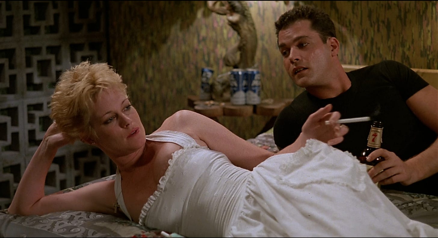 The third major role–Audrey’s sociopath ex-husband Ray, who derails the lovers’ weekend–went uncast for a while. For the audience to be intimidated by Ray, Demme kept waiting for an actor to intimidate him in his audition. Smarting from a bad experience she’d had with an actor on another film, Griffith had been given informal casting approval by Demme. To play her character’s ex, Griffith suggested a friend named Ray Liotta. An alumnus of the soap opera Another World, Liotta had scant screen credits to show for nearly five years in Los Angeles looking for work. He’d remained friends with a college pal from the University of Miami–actor Steven Bauer–who’d married Griffith in 1981. Prior to Body Double, Griffith was better known as the daughter of Tippi Hedren and had worked sporadically as an actor herself, mostly in television. She’d suggested Liotta join the acting class she belonged to, instructed by Harry Mastrogeorge, which Liotta would remain a student of for twelve years, even after he started booking film roles. A friend told him to give Griffith a call to see if she could get him an audition for Cross Cut. Casting directors Billy Hopkins and Risa Bramon had already considered and rejected Liotta, but with Griffith getting him through the door, Liotta so frightened Demme that he won the part, his film debut.
