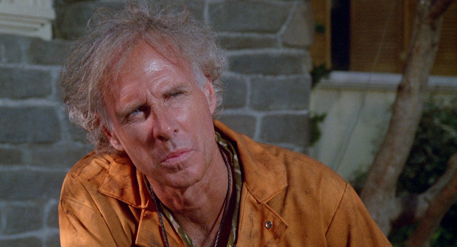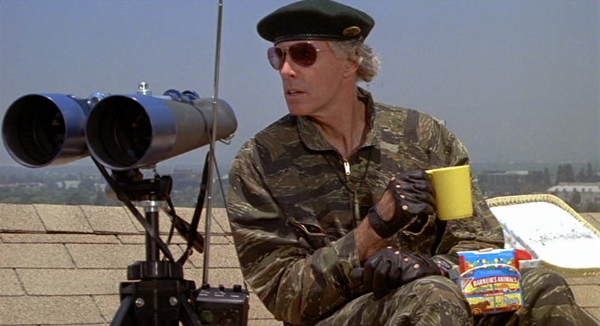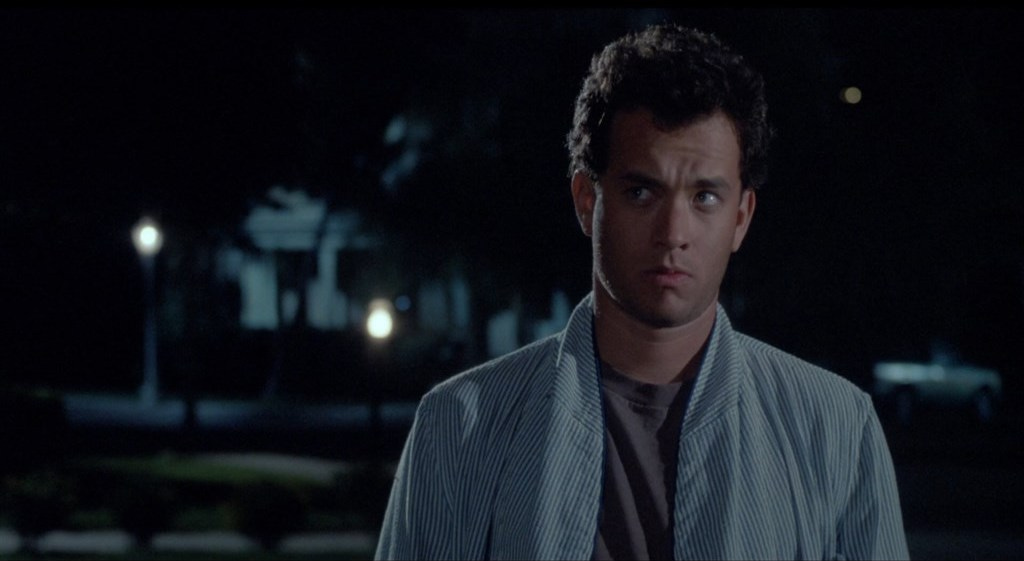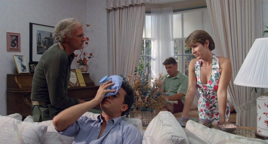 At its best, The ‘Burbs is—with the exception of They Live (1988), another film that proposed something weird was going on behind the curtain in America–the most bizarre movie Universal distributed in the late eighties. In terms of originality, it stands out among the comedies Imagine would begin to churn out for the studio, like The Dream Team (1989) or Parenthood (1989), The “Burbs also being the first. With a script by Dana Olsen whose dialogue is the furthest from sharp, Tom Hanks gives a performance quietly reminiscent of Buster Keaton or a silent movie comedian. His great moments aren’t just funny-sneeze coughing in an allergic chain reaction to sardines, descending porch steps three at a time while in a semi-catatonic state–they’re pulled off without him uttering a word. Bruce Dern and Wendy Schaal–playing the block’s other couple, a Vietnam vet wrapped too tight for the ‘burbs and his Barbie doll wife, respectively–are funny too. Carrie Fisher was a steal as Hanks’ wife. Having worked with him on The Man With One Red Shoe (1985), Fisher is as comfortable around him as a wife would be her husband, but more importantly, was launching her career as a script doctor, tasked with performing triage on scripts with pedestrian female characters. In The ‘Burbs, Fisher fixes her own character, giving her autonomy, neither getting in her husband’s way, nor helping him.