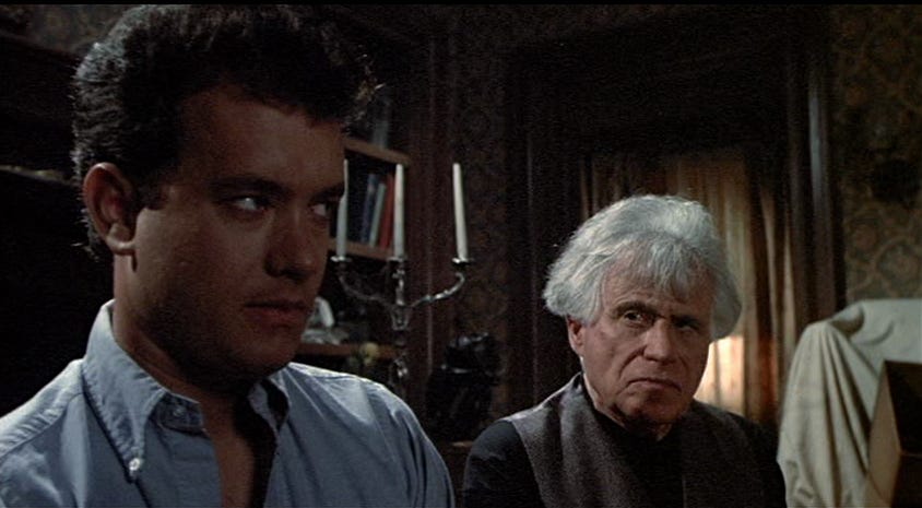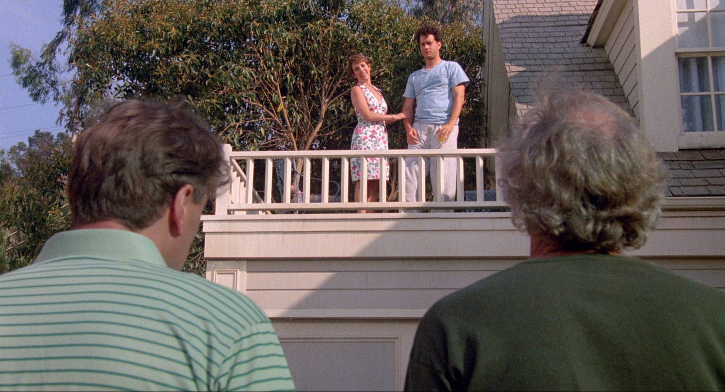 In February 1988, Imagine sent Bay Window to Joe Dante, who’d cut the first movie Ron Howard had directed, Grand Theft Auto (1977), when the king of the indies Roger Corman was giving them both on-the-job training as filmmakers. Dante had since directed one manic horror movie after another, often slipping in more than the plot required with cheeky wit: Piranha (1978), The Howling (1981), Gremlins (1984) and the segment of Twilight Zone: The Movie (1983) in which an omnipotent but lonely boy imprisons wayward travelers in a Looney Toons universe of his making. Dante had been one month from directing a quirky drama for Fox titled Little Man Tate about a child prodigy raised by a single mother in her twenties. He’d completed casting for the boy, but walked away when the studio insisted they cast Cher as the mom, which would’ve turned Little Man Tate into a movie about a parent still figuring things out in her forties. Dante didn’t particularly read Bay Window as a commentary on Alfred Hitchcock thrillers, nor was he interested in making one. What he could relate to and wanted to make was a comedy about weird neighbors, or at least our obsession with them. The more people Dante and his producing partner Michael Finnell talked to about the script, the more mentioned growing up near a house with reclusive characters that everyone else in the neighborhood was suspicious of. Dante and Finnell came aboard to direct and produce, respectively, and when Ron Howard, assuming the role of executive producer, landed the actor he and Brian Grazer had made a star in Splash (1984), Universal greenlit the film with Tom Hanks starring. Their project would be retitled The ‘Burbs.