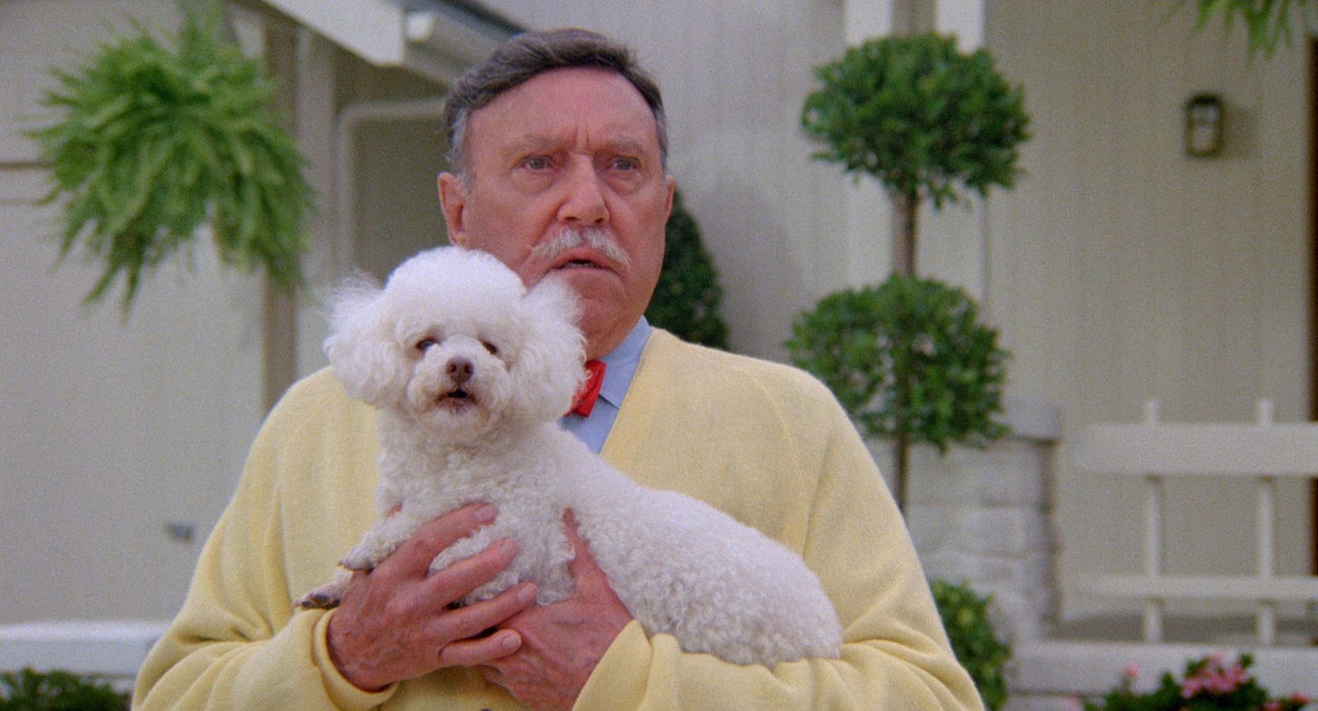 Hanks was unsure whether he was ready to play a dad and perhaps be typecast as one forever, but rather than spend the summer of 1988 without work while the WGA went on strike, he took the job. Casting directors Mike Fenton and Judy Taylor, who’d worked with Dante and Finnell on their previous film Innerspace (1987), helped assemble an A-cast. Bruce Dern, Carrie Fisher and Rick Ducommun (whose manager Larry Brezner was producing The ‘Burbs with Finnell) joined actors Dante had worked with previously: Wendy Schaal in Innerspace, Corey Feldman in Gremlins and appearing as garbage men, Robert Picardo and Dick Miller, who’d popped up in nearly every film Dante had made. To play the Klopeks, three generations of strange men who move into the nameless neighborhood, the filmmakers went 3-0 with Henry Gibson, Courtney Gains and Theodore Gottlieb. The latter was a Holocaust survivor who came to America and as “Brother Theodore” embarked on a career in the performing arts, leaning into theater of the absurd as the voice of Gollum in the animated The Lord of the Rings (1978) and as a guest on Late Night with David Letterman in the early eighties. Imagine had anticipated filming exteriors for The ‘Burbs in a real cul-de-sac somewhere in the midwest, but the impracticality of homeowners signing off on a neighboring home being blown to bits nixed that plan.