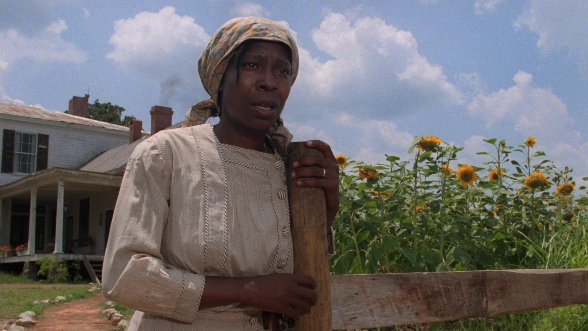 Shooting commenced in early June 1985. The first three weeks of production took place on soundstages at Universal Studios in Los Angeles, where Harpo’s juke joint and most of the interiors were filmed. This was followed by eight weeks on location in North Carolina. The town of Marshville in Union County stood in for Hartwell, Georgia, clay poured over paved streets where necessary to mimic a rural town in 1910, 1922 and 1930. Mr’s farm was constructed and filmed on a parcel near the Anson County town of Wadesboro. A sixty-year-old Baptist church facing demolition was transported to the location, while exteriors for Celie’s childhood house and Harpo’s juke joint were built nearby. Greensman Danny Ondrejko had arrived six weeks prior to plant tobacco, pearl millet and sunflowers on Mr’s farm, as well as a field of cosmos in front of Celie’s house. When the flowers bloomed, Spielberg and others were alarmed that despite the seed packets being labeled lavender, the flowers looked pink. This led to a debate over what was purple and what was pink, and as a workaround, Riva and his crew spraypainted flowers in the foreground purple for shots of actors in the field. In an era before digital compositing, the production designer also defoliated the trees and to spoof snow for the winter scenes, poured Epson salt on the ground. For the East Africa sequence, a second unit crew led by producer Frank Marshall was dispatched to Maasai tribal areas in Kenya.