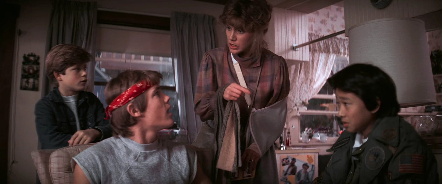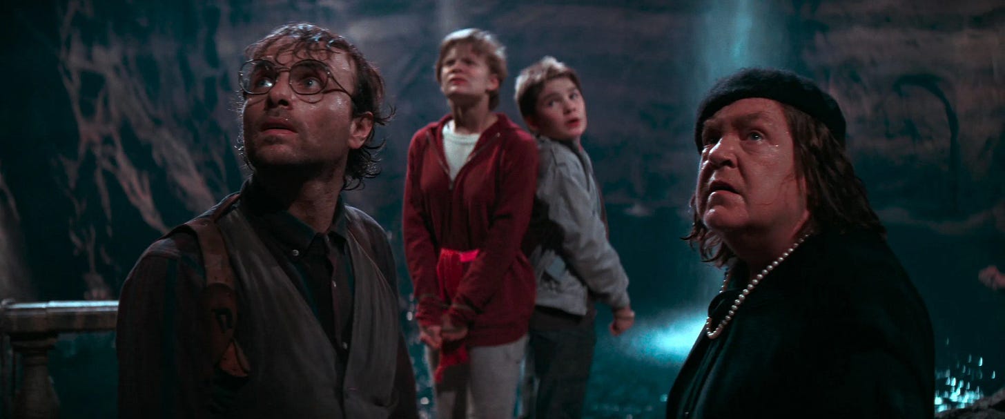 Warner Bros. designates The Goonies a family film, and while the crudeness and profanity of the first half hour (the MPAA settled on a PG rating) is mild by today’s standards, the target audience is not children, but junior high school kids seeking independence and their own stories, and adults who remember experimenting with language or behavior their parents did not approve of. Exhilarating throughout most of its 114-minute running time, unlike Back to the Future (1985), this is a disposable movie. The reason is that while the Goonies are given tasks to perform, they aren’t given a problem to solve. Whereas Marty McFly not only had to repair his time machine, he was doubly challenged by playing matchmaker for his parents in order to fix his own timeline. The Goonies is a ride that acts on the viewer, but doesn’t engage us on a deeper level. Its plot doesn’t stand up to scrutiny. That no adult in the Goon Docks is current on their mortgage–if they don’t already own their old homes free and clear–defies believability, nor is it plausible that “rich stuff” would satisfy the bank, Mikey’s father knowing better than anyone that One-Eyed Willy’s booty belongs to someone who can afford better lawyers than he can. The movie would be just as entertaining if the Goonies went adventuring out of sheer boredom, with no way back but forward, and though forced to hand most of their loot back, are rewarded with something that isn’t material, like pride at not being helpless misfits. It would take Steven Spielberg a couple of more productions to embrace a hero or heroes whose reward isn’t financial.