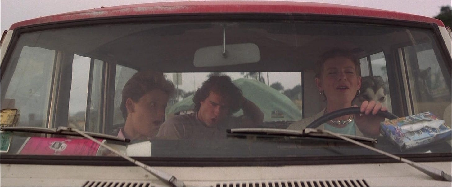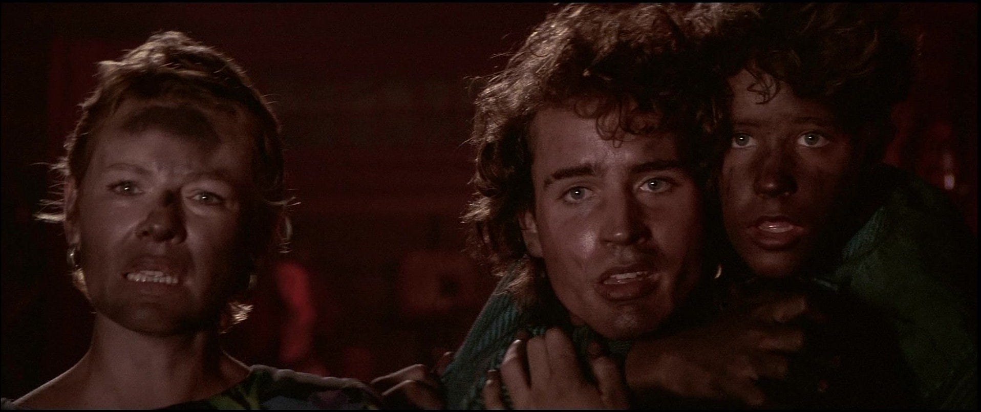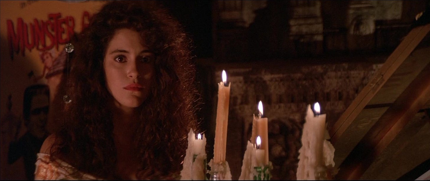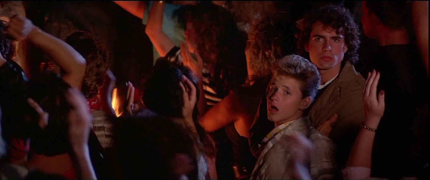 Jeffrey Boam’s strong suit as a writer is action, and when his action doesn’t inform character, not much else but the costuming does. The same goes for Jami Gertz, whose character could be much more complicated than she is. How she and the boy in her care came to be initiated into the gang rather than serve as food is a movie in itself, and Patric and Gertz achieve sexual chemistry so powerful that their hazily lit sex scene proves anti-climactic. Wiest is a delight, particularly in her scenes with Herrmann, cast as a single man moving at innately perfect speed for a vulnerable divorced woman. Even the old fart played by Barnard Hughes deserves more screen time, especially after his closing line, which makes us re-evaluate the entire movie we thought we were watching. Schumacher does such a tremendous job casting and balancing his third consecutive ensemble –begun with the comedy D.C. Cab (1983)--and getting the wardrobe, hair and makeup perfect in genres that typically coast on those details that his questionable taste stand out. Chief among these is the appearance of topless and oiled-up sax player Tim Cappello for the concert scene. Cappello is a perfectly acceptable vocalist and saxophonist, but Schumacher is way more enthralled by his act than the hippies in Santa Clara–who’d be thirsting for rockers like Aerosmith–would be. Cappello’s beefcake antics are allowed to nearly derail the best scene in the film, Michael and Star laying eyes on each other for the first time (Cappello’s cover of The Call’s “I Still Believe” is an evocative song for the lovers). By thinking beyond horror or comedy, The Lost Boys classed up and reinvigorated its genres, and as a sum of its parts, is the most consistently entertaining vampire picture of its era.
