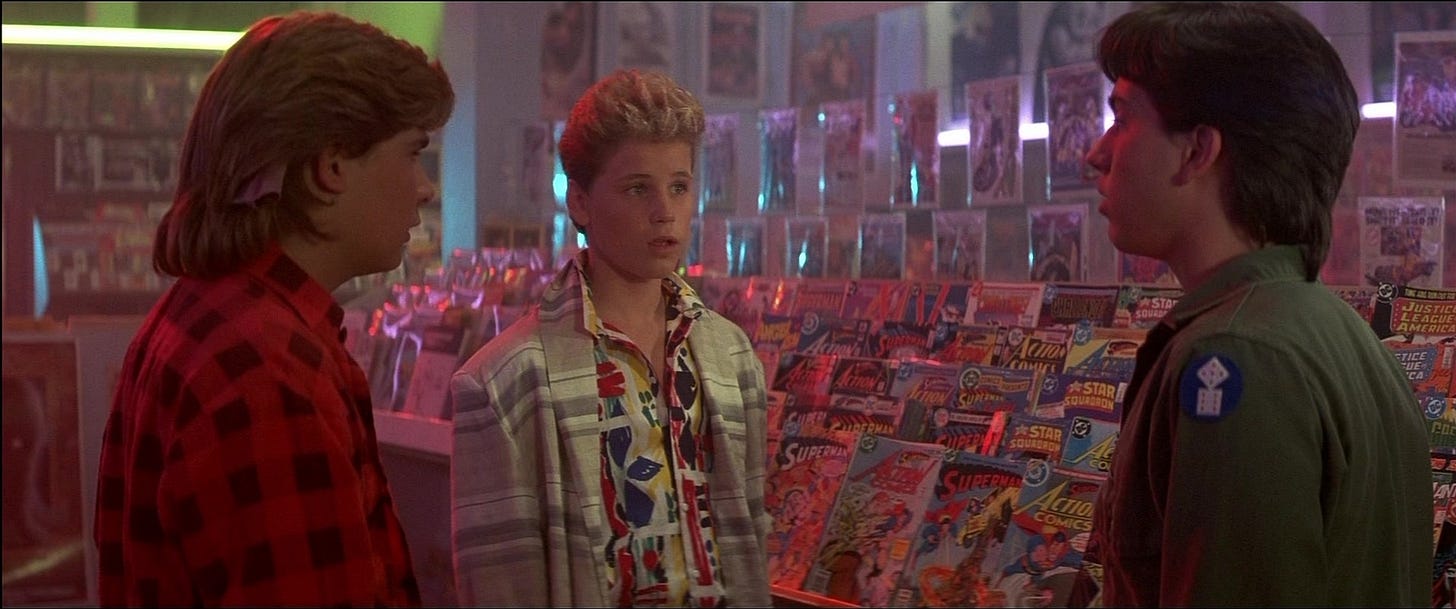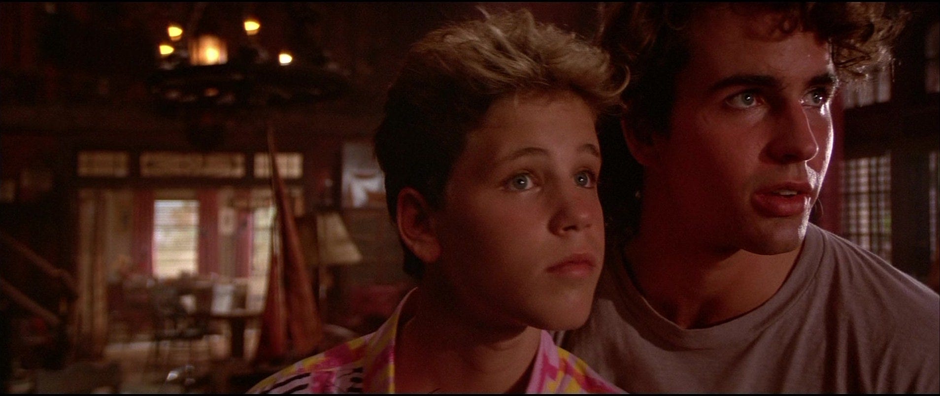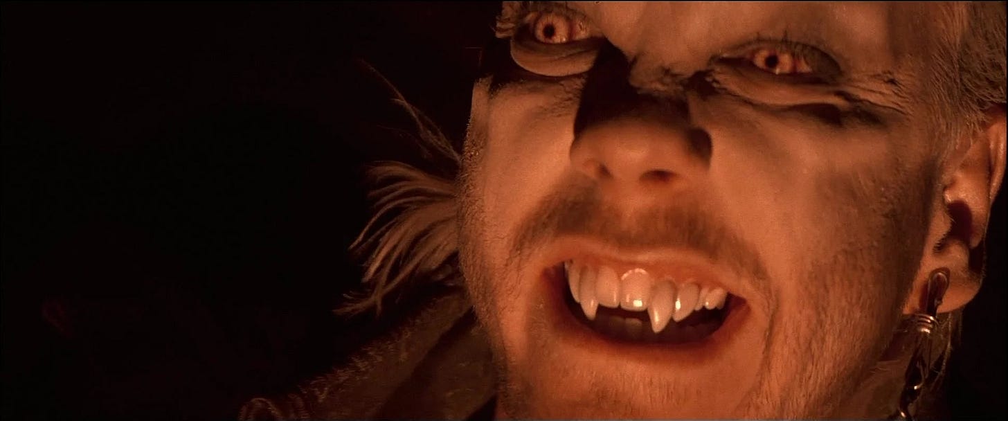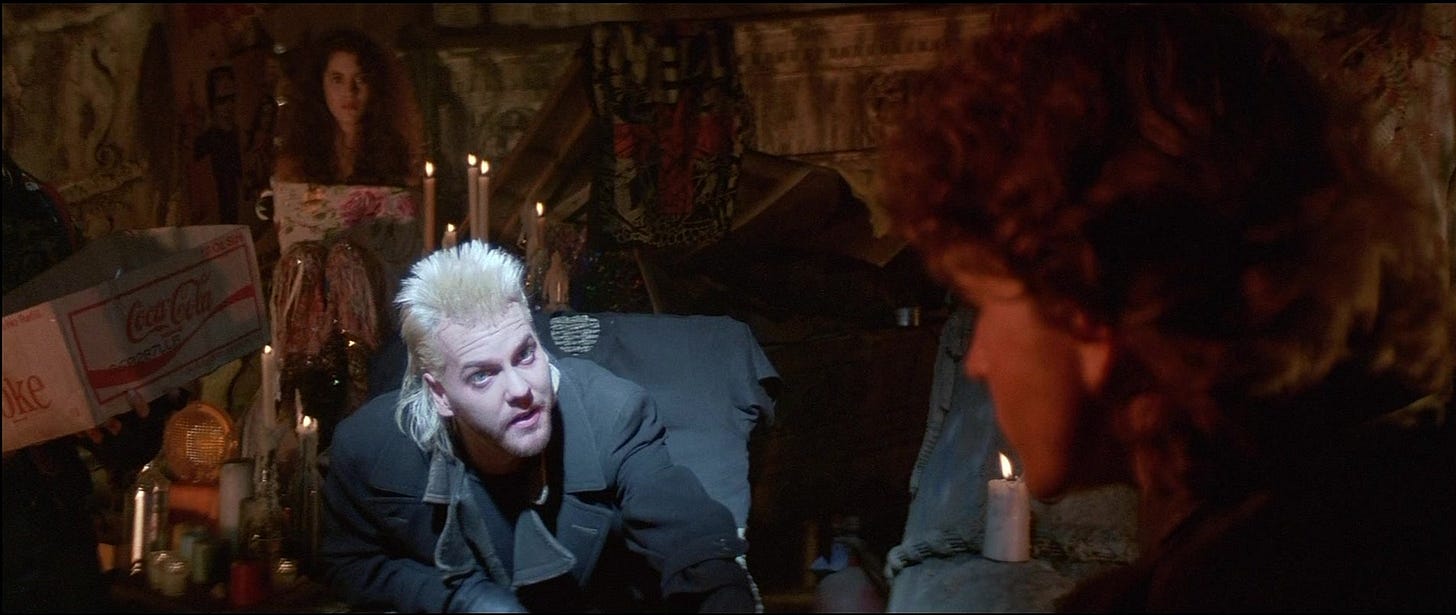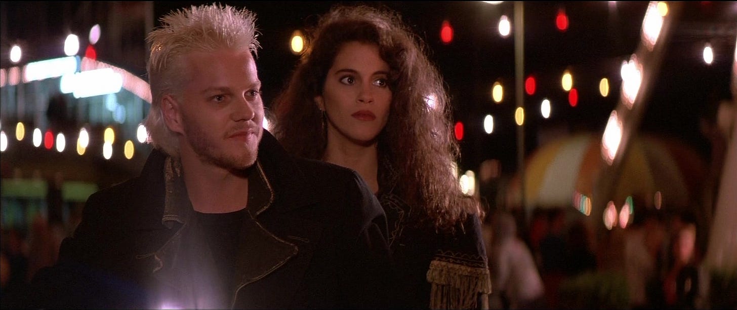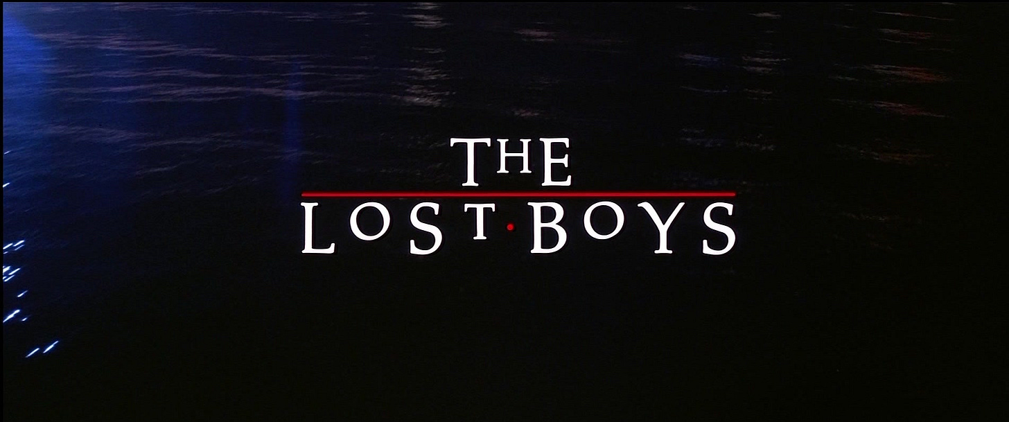 THE LOST BOYS (1987) is a horror thriller by a filmmaker who’d never directed horror or a thriller, never written horror or a thriller, and demonstrates no evidence at having watched a lot of horror or thrillers. Because of this, the movie is all at once delightful and negligent, visionary and throwaway, shedding some of the conventions of the vampire tale with a world-class cast, brisk running time, narrative finesse, and taste that alternates between sensual and trashy. It’s a vintage shirt we loved, then were too embarrassed to wear, and now is back in style again.