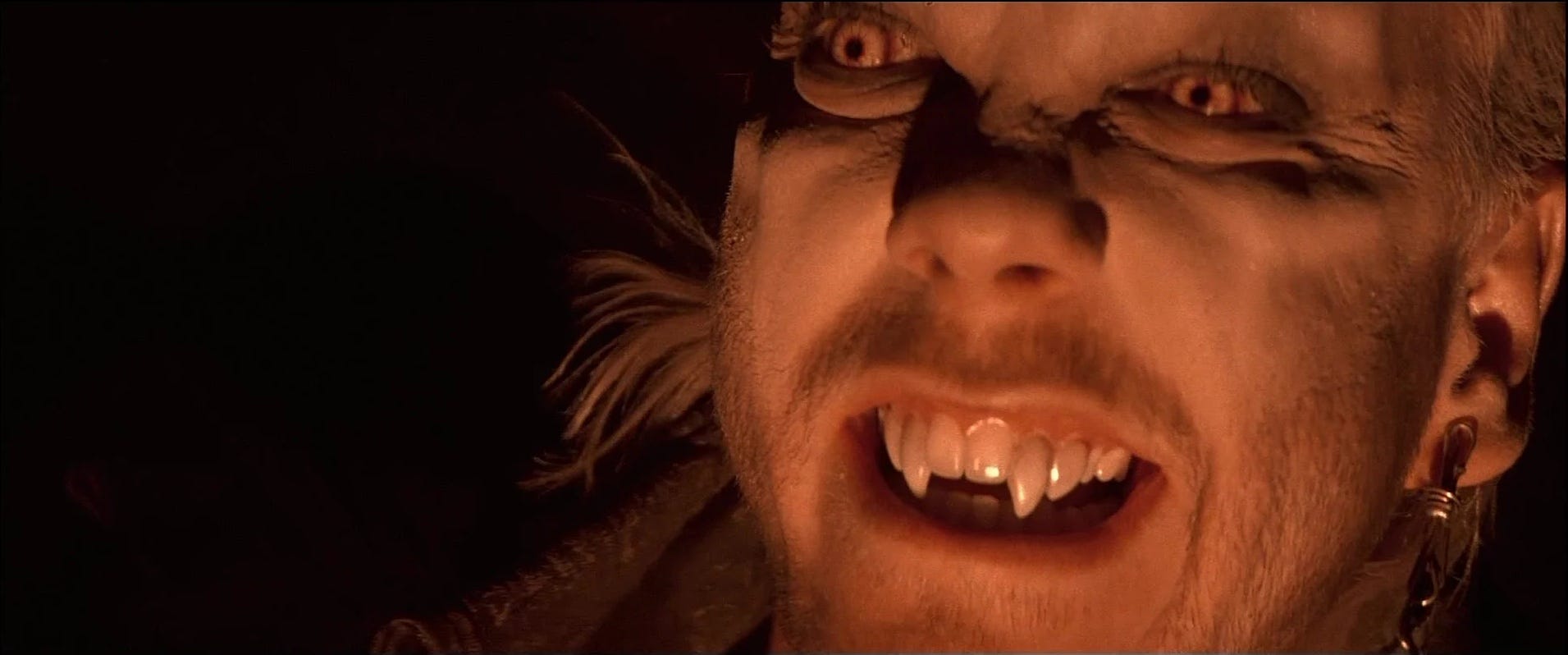 Hearing that Schumacher wanted prosthetic makeup that would retain the sexual allure of his actors, Neill was unconvinced that Edlund–who’d done the visual effects for most of the era’s monster movies, including Fright Night--was right for the job. Schumacher did reject Steve Johnson’s designs as being too similar to Fright Night and late in pre-production, on Neill’s suggestion, brought in Greg Cannom to do the prosthetic effects. In addition to his makeup effects work on The Incredible Shrinking Woman, Cannom had worked with Rob Bottin (on The Howling in 1981) and Rick Baker (on Michael Jackson’s Thriller in 1983). With four weeks of shooting in Santa Cruz before the vampire makeup needed to be ready in Burbank, Cannom and his crew were able to complete the job. Those most responsible for the look of the Lost Boys would be Schumacher, Susan Becker (costume designer), K.G. Ramsey (hair stylist) and Ve Neill (makeup artist), with the director crediting Michael Chapman for understanding the movie they all wanted to make. A camera operator on Jaws (1975), Chapman advocated doing the flying sequences as point-of-view shots, leaving much to the viewer’s imagination. Though they defy gravity, the vampires are never seen flying across the sky.