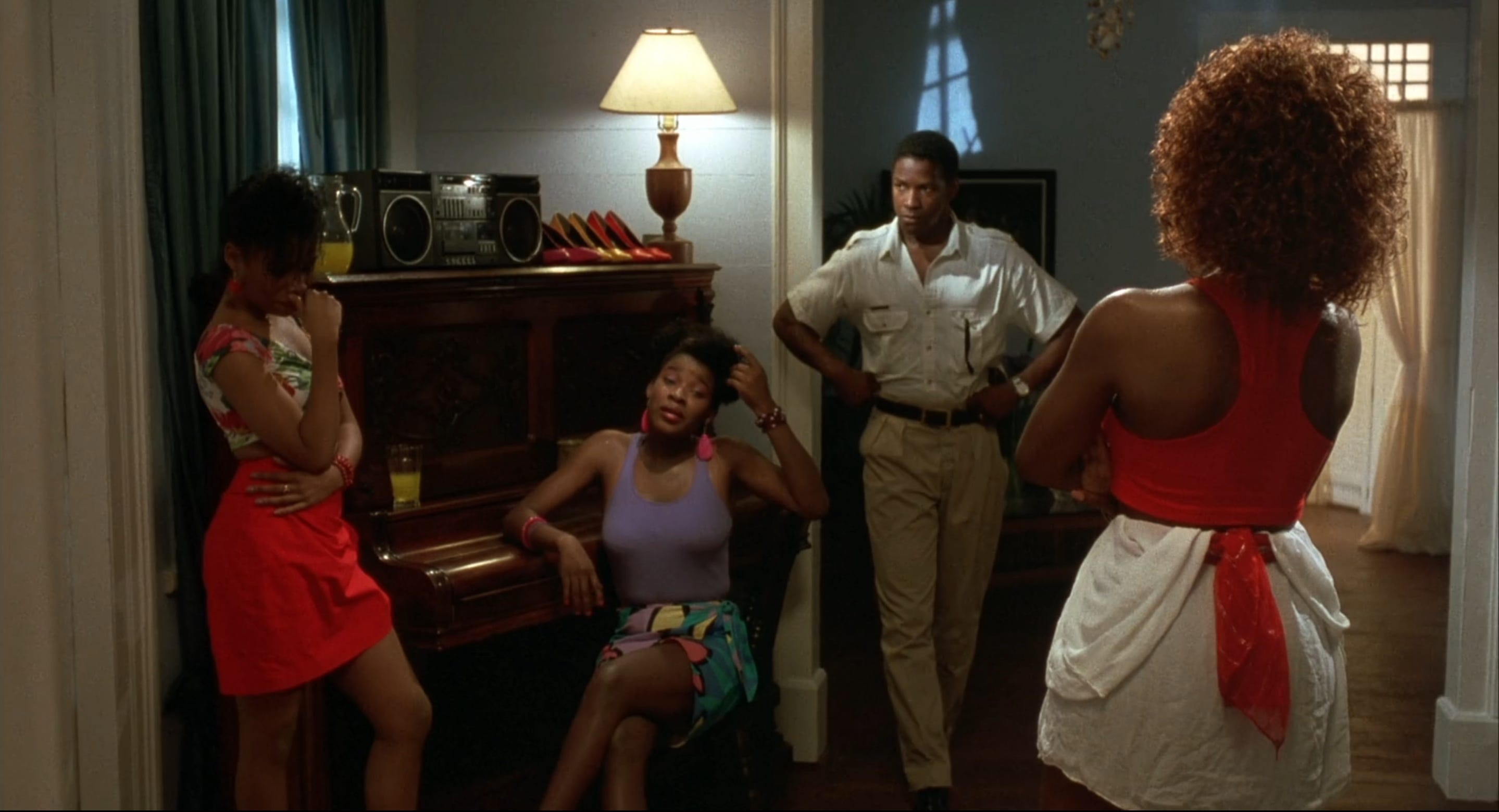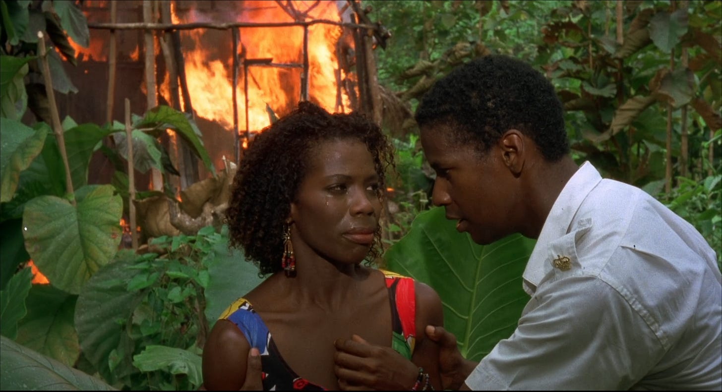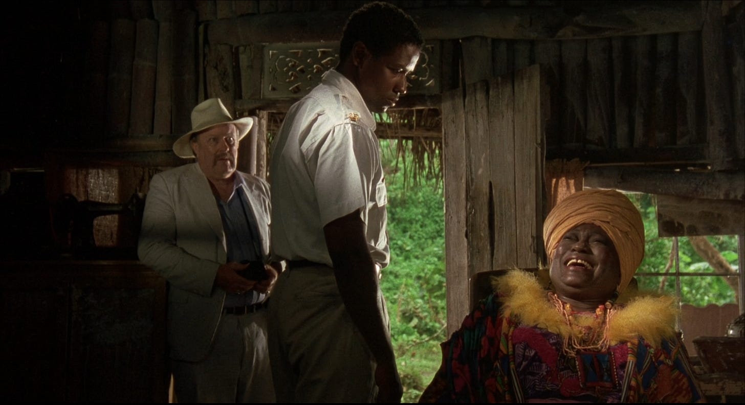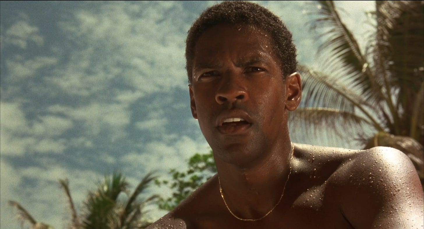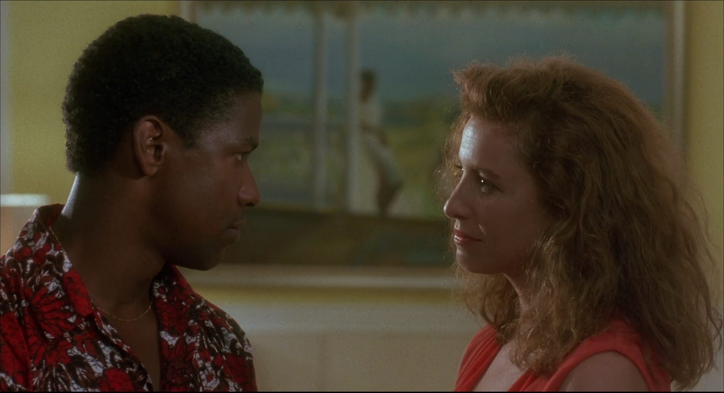 Compared to a succession of riveting Denzel Washington performances in films that push viewers to edge of our seats–from Glory (1989) and Malcolm X (1992) to Crimson Tide (1995) and Training Day (2001) — The Mighty Quinn drifts along lazily. What was revelatory in 1989 — a new leading man in a film dominated by Black actors — plays best as a soundtrack today, or something to leave on in the background without paying much attention to. The filmmakers fail their actors. James Fox, often cast as a jolly, good-natured titleowner, plays against type as a hotelier who bristles at Quinn’s presence, questioning good white people about a murder. As his bored wife looking for a diversion, Mimi Rogers generates nearly as much allure as Washington. She isn’t on screen enough to build memorable sexual tension with her co-star, and both she and Fox disappear from the movie. Another good actor in the wrong part is the superlative M. Emmet Walsh. As a business agent who arrives on the island to appraise Quinn’s investigation, the role needed an actor like Christopher Reeve, a bounding, country club type who might tempt the chief with career opportunities in the States, if he’s willing to do him a favor. Nothing more is asked of Walsh in the finished film than he play a nefarious cracker, as he does so well.