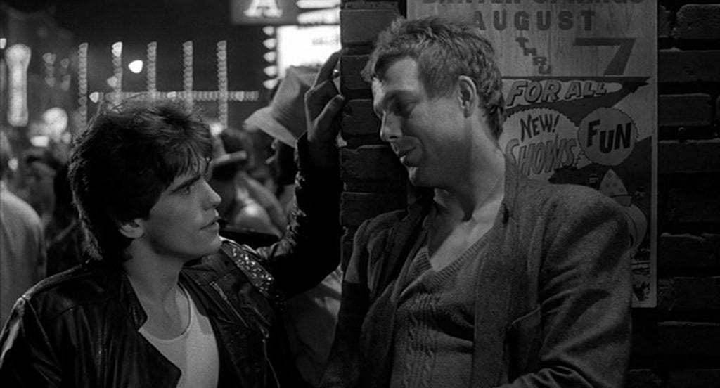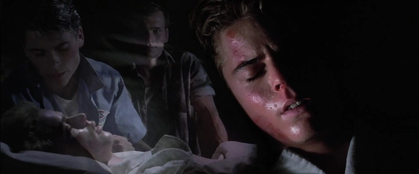 In the words of Rob Lowe, The Outsiders wasn’t “a hit-hit.” The film was unceremoniously kept out of the #1 spot at the box office by a Porky’s rip-off titled Spring Break, but spent six, nearly seven weekends among the top ten grossing films in the U.S., a commercial success given its budget. Coppola’s return to his theater roots launched virtually every young actor in his cast to stardom. Matt Dillon fulfilled his promise and with Drugstore Cowboy (1989) was in the same sentence with Sean Penn and Nicolas Cage as the actor of his generation. After Patrick Swayze and C. Thomas Howell were reunited in Red Dawn (1984) and Grandview U.S.A. (1984), Swayze became a star in Dirty Dancing (1987), while Howell rattled off lead roles a handful of pictures: Secret Admirer (1985), The Hitcher (1986), Soul Man (1986). In Tulsa, Diane Lane was already rehearsing guitar for her next picture, Streets of Fire (1984), which she followed with forty plus years as a film leading lady, including an Academy Award nomination for Unfaithful (2002). Ralph Macchio was briefly one of the most popular actors of his generation, with Crossroads (1986) bookended by two hugely popular Karate Kid movies. Rob Lowe weathered several critical and commercial failures as well as publicity gaffes in the eighties to a career that has paced Lane’s as a supporting actor. While in Tulsa, Emilio Estevez was writing an adaptation of S.E. Hinton’s That Was Then, This Is Now (1985), his father Martin Sheen having optioned the novel for his son, and Estevez would branch from acting into writing and directing. Tom Cruise headed to Chicago for the lead in a comedy titled Risky Business (1983), and by late summer, was a major star on his way to superstardom.