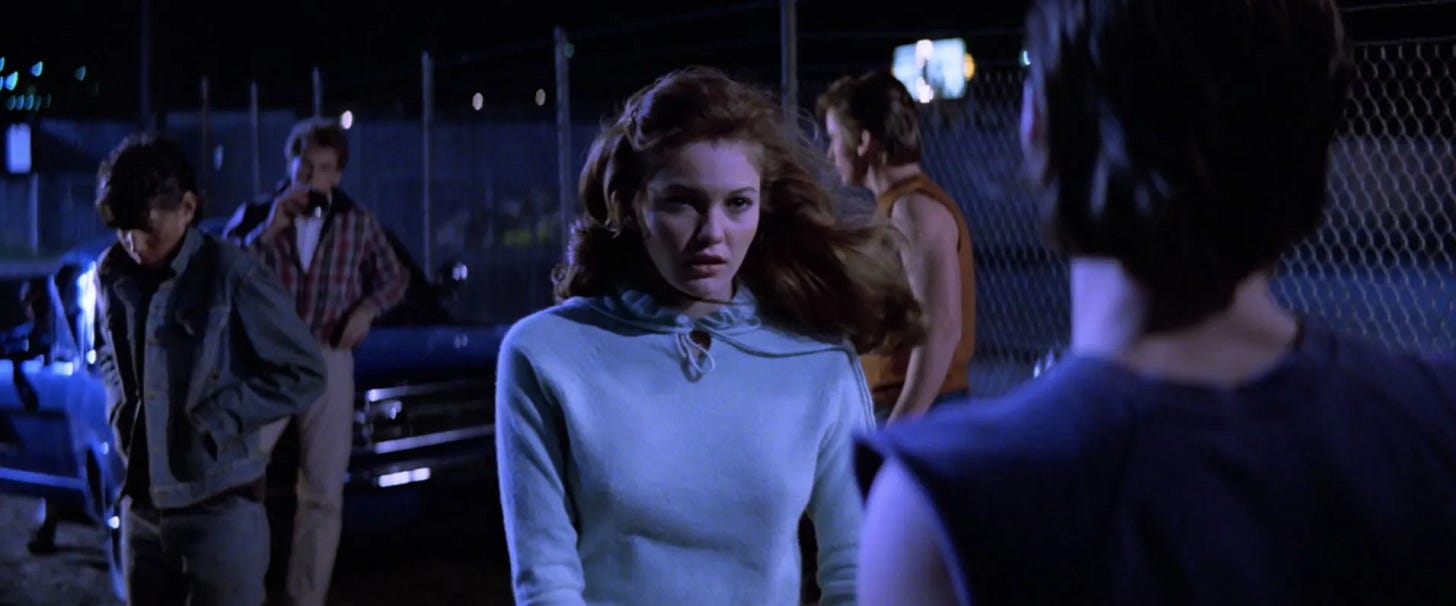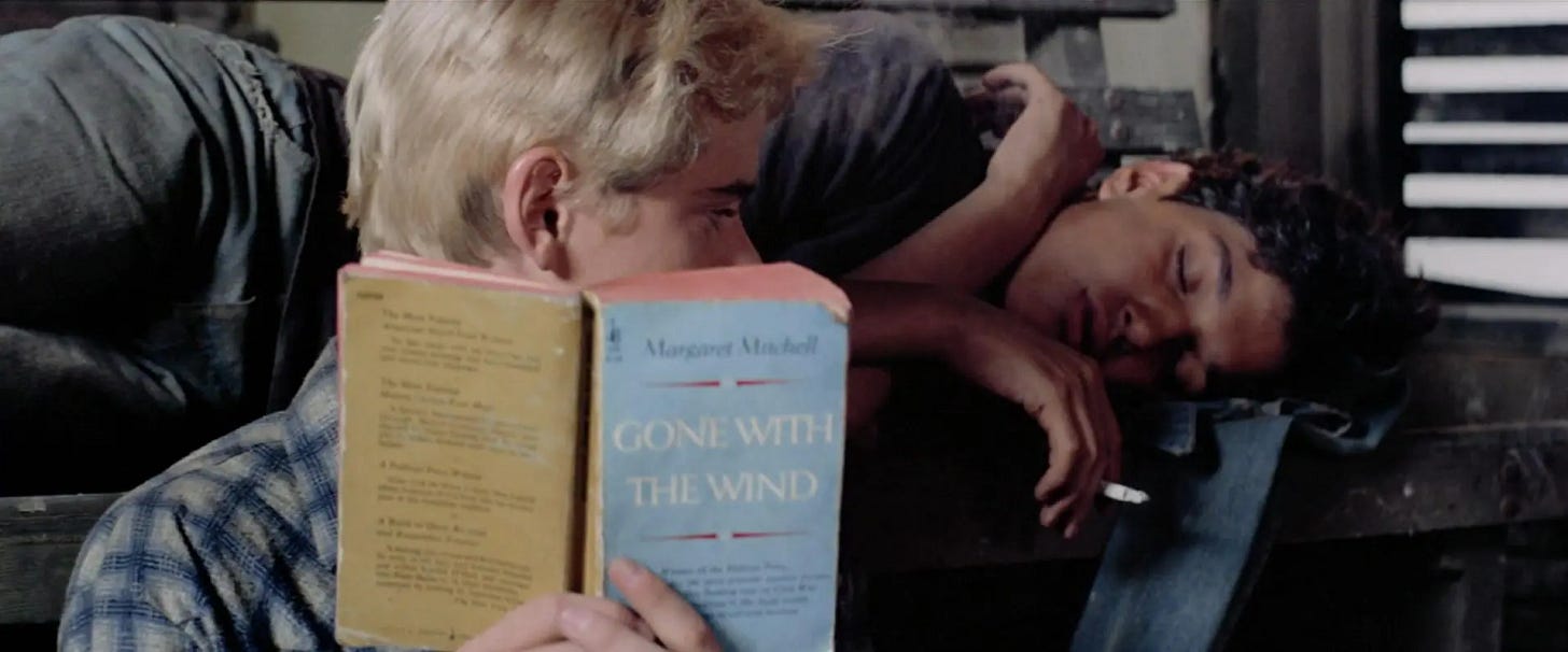 At 17, Francis Coppola had worked as a counselor at a summer drama camp in the Poconos, and the prospect of directing a dozen actors who were either teenage or close to it held tremendous appeal. Working in Tulsa would also get Coppola out of L.A. as his dream of Zoetrope was being sold off. As casting director Janet Hirshenson summarized, “Get out of town. Go make a movie. That’s what we did.” Coppola began by adapting a screenplay himself. According to Lucy Fisher, the filmmaker thought that he might be able to input Hinton’s book into a computer that would format a faithful screenplay, but long before LLMs, this proved futile. Instead, Coppola reached out to S.E. Hinton, who had misgivings about Kathleen Rowell’s draft as well. The author stated, “Francis had me in to work on the screenplay with him. What he had done is he took a paperback book and he cut pages out of it and he outlined the character descriptions in one color and the interior thoughts in one color and then the dialogue in another color and kind of cut it all up and he had somebody paste it together. Francis wrote the screenplay and said, ‘Will you cut it for me?’ I said, ‘I will, Francis, but I’ll warn you that I’m a ruthless cutter.’ Here I am reading this stuff that I wrote when I was in high school and I thought, ‘Here is my chance to make it better.’ And so, once in a while, I would change a line of dialogue and he would read it. He had no problems with any of the cuts I made, but he said, ‘Susie, is this just like it was in the book?’ And I said, ‘No, Francis, but it’s better, really.’ He said, ‘We are making this movie for the readers of the book, so we are going to keep it the way it was.’” (A draft of The Outsiders dated March 1, 1982 was credited to Francis Coppola, triggering the Writers Guild of America to convene an arbitration, in which three anonymous screenwriters studied Rowell and Coppola’s drafts to conclude that Kathleen Rowell merited sole credit for the screenplay).
