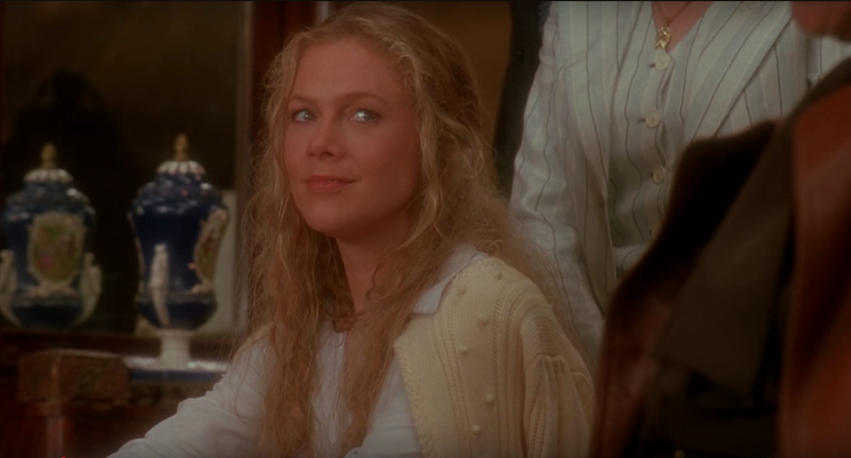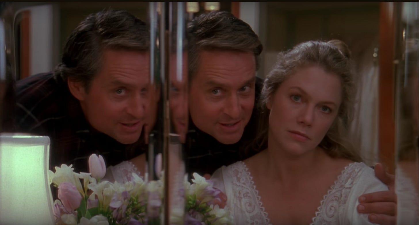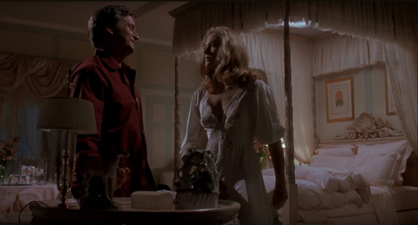 The War of the Roses runs 116 minutes and its first hour is fantastic. Most homicide victims know their killers intimately, and like a murder investigation, Michael Leeson’s screenplay is loaded with forensic clues on the when and how a relationship filled with love started to break bad. Barbara Rose is by her nature charitable and free-spirited. Oliver is hard-working and loyal. They make each other happy. They have great sex. The relationship doesn’t stand a chance. The couple meet as college students at an estate sale, already collecting the stuff they hope to fill their future homestead with. The person they might share that home with is of minor importance. Kathleen Turner was 35 years old when production began, Michael Douglas 44 years old, and neither are very credible playing twenty-one-year-old versions of their characters (Turner is doubled unconvincingly by a gymnast for the acrobatic positions required for her character, a former gymnast). The age disparity is the only unbelievable detail, though. The script’s characterization is nuanced, each scene reinforcing what attracts the couple to each other and also what repels them, all highlighted with tempestuous wit.