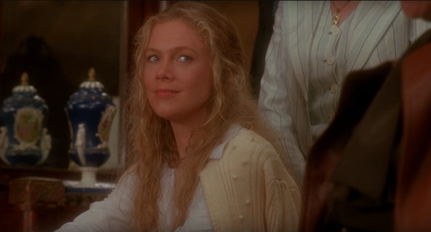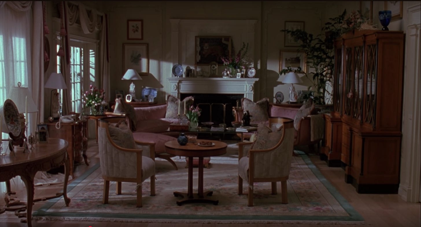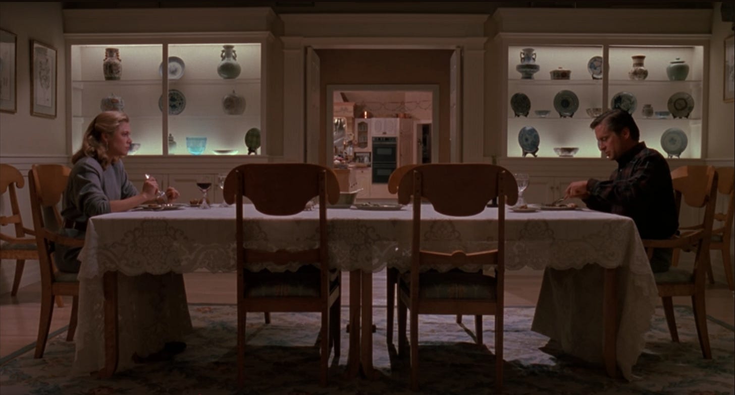 The film’s conceit is that a couple could be so devoted to a house that they’re pushed to increasingly deranged lengths to keep it for themselves. For this to appear plausible, the house needed to not only look and feel grand, but be a character. The ideal director would have had a design sensibility and impeccable taste. Someone like Polly Platt. Directed by Danny DeVito, The War of the Roses settles into a grand scale entertainment, funnier than it probably would’ve been if directed by Platt, but ultimately, less sophisticated. Shot on sound stages by director of photography Stephen H. Burum in a heightened theatrical style, the interiors of the house resemble a sitcom, what we see of the exteriors are generic, and the ceramic figurines so much fuss are raised over are forgettable. Turner and Douglas give maximum-level performances, committing themselves 110%, but the material strands them in the movie by themselves. German actor Marianne Sägebrecht plays the couple’s housekeeper in a role that the filmmakers can’t seem to decide whether to punch up (for someone like Catherine O’Hara or Julia Louis-Dreyfus) or cut even further back, like the children, played by Heather Fairfield and Sean Astin. If the comedies of Nancy Meyers are criticized for their magnificent interior design and sham characters, The War of the Roses exposes the problem of having magnificent characters and sham design in a story where better homes and gardens were important.