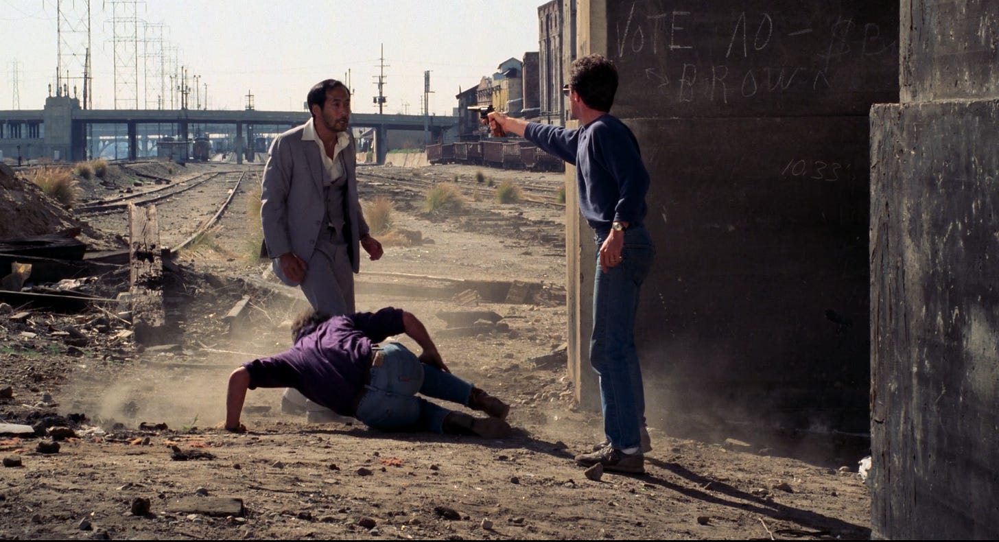 It’s hard to know what to do with a movie like To Live and Die In L.A. It does the complicated things beautifully while neglecting simple things to the point of audience abuse. Handing over the music to Wang Chung–between the band’s two smash singles, “Dance Hall Days” and “Everybody Have Fun Tonight”--some accused William Friedkin, who’d directed the music video for Laura Branigan’s “Self-Control” in 1984, of being seduced by MTV. But as edited by Scott Smith (son of Friedkin’s editor Bud Smith, who assumed the role of co-producer), the film is deliberate in its progression as a classic neo-noir, a dark, cynical and unsparing update of T-Men (1947), which also dealt with Treasury agents and counterfeiters. The steady hand at editing is balanced with evocative lighting by Robby Müller, the Dutch cinematographer who stepped onto this job right off of Repo Man (1984) and Paris, Texas (1984), both of which filmed in Los Angeles. Müller captures the city’s light, rust and dust with subtle wonder. Wang Chung isn't asked to lift more than their synthesizers can carry, providing seductive instrumental music to accompany a sensational theme song. Friedkin deserves credit for capturing a different side of L.A., an unhealthy side, around the city’s dingy bars, menacing bridges, and surrounded by urban desolation, mysterious warehouses. None of these spots would appear on a postcard.